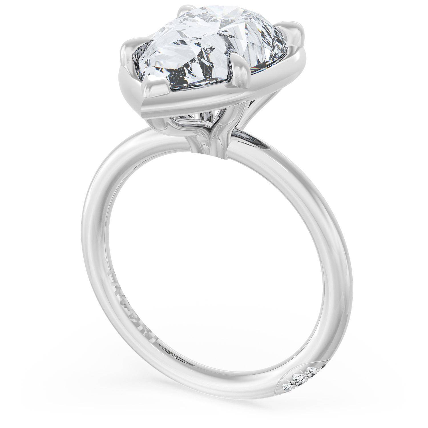 A Pear solitaire is elevated by a modern bloom of round brilliant diamonds, and set into a high-polish Platinum foundation. TACORI Crescents add hidden detail to the underside of the crown.