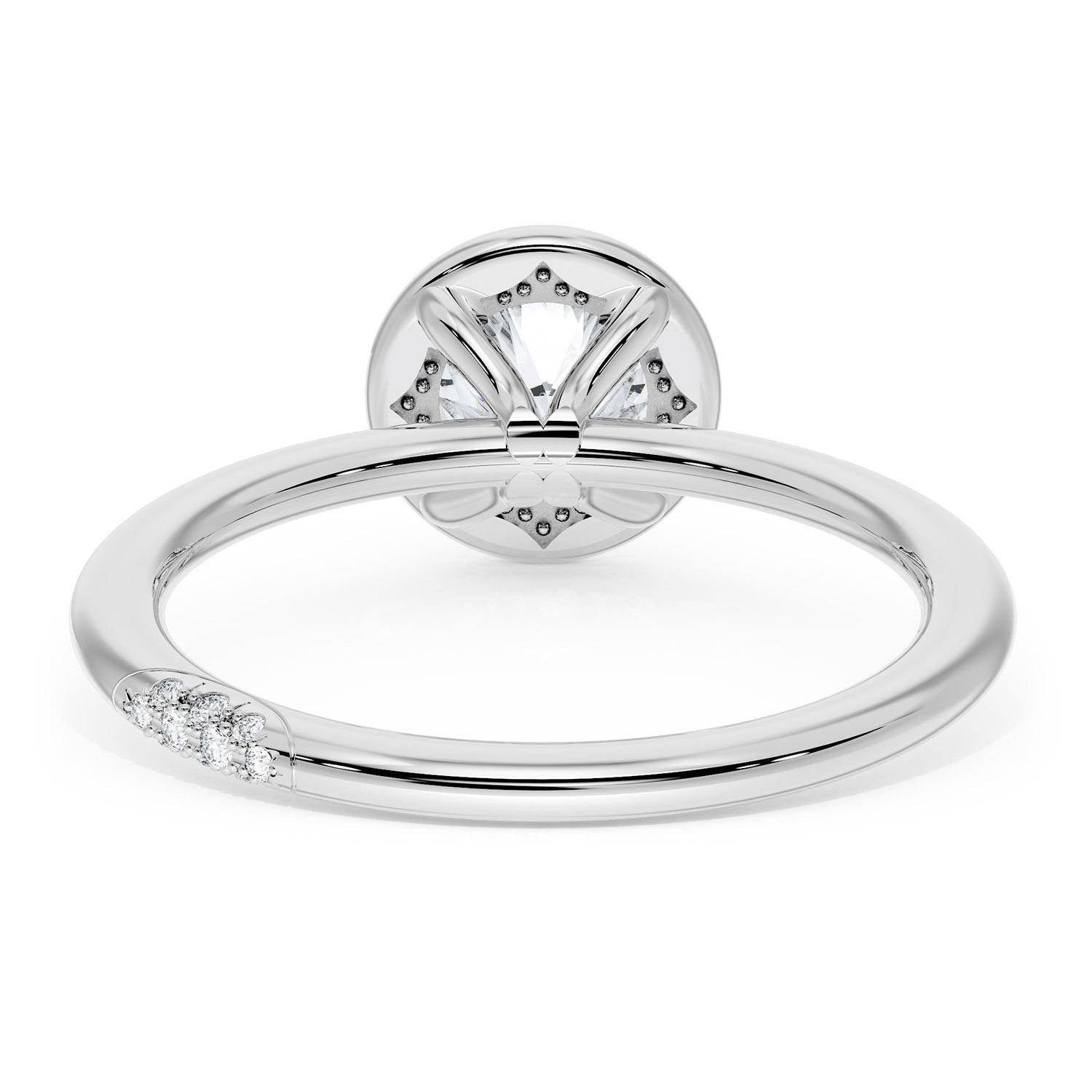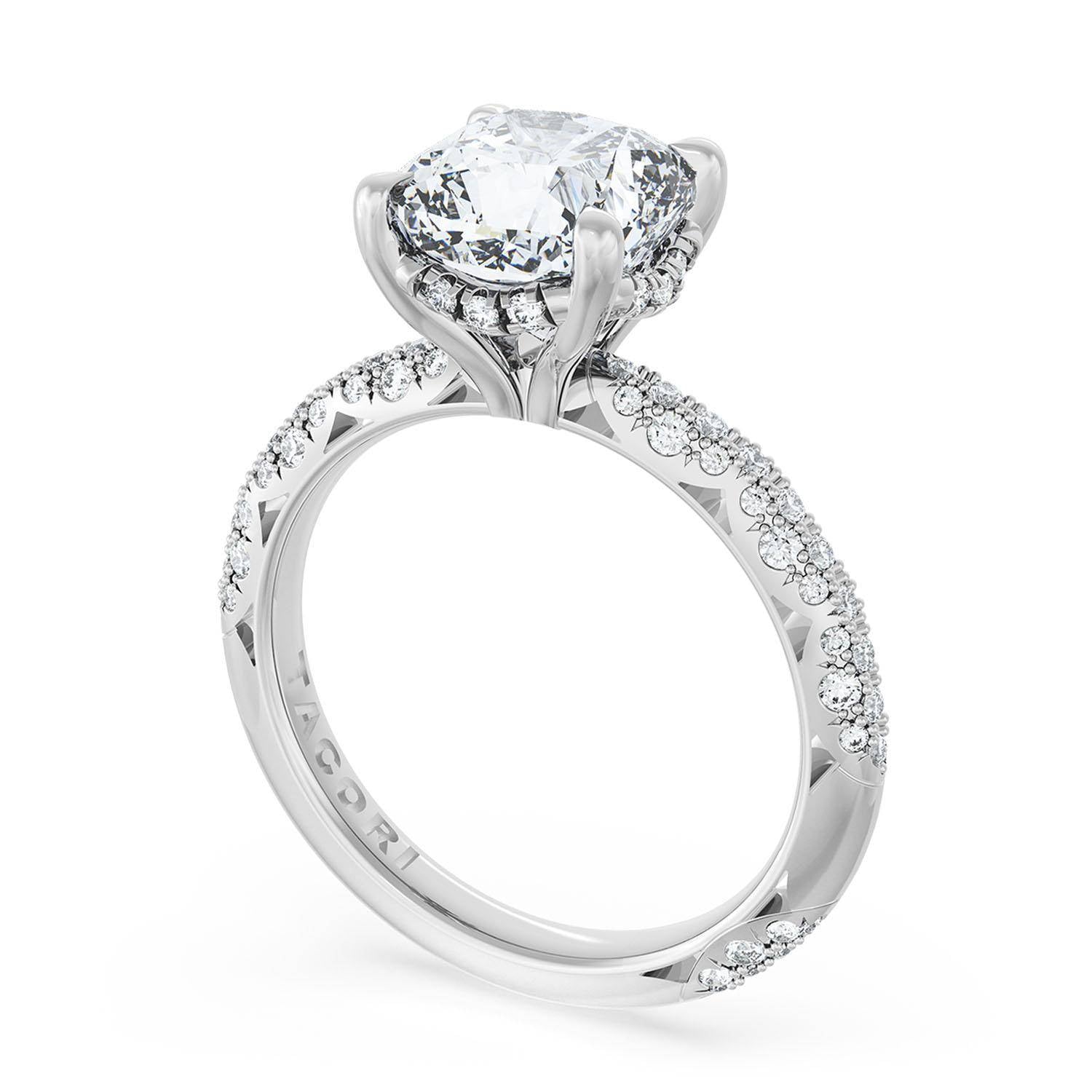 A Round solitaire is elevated by a modern bloom of round brilliant diamonds, and set into a high-polish 18kt White Gold foundation. TACORI Crescents add hidden detail to the underside of the crown.