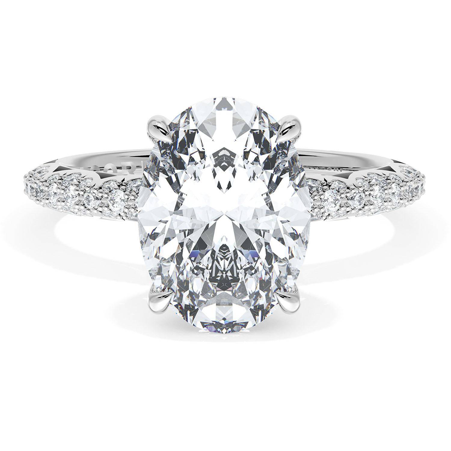 A Princess Solitaire is set into a unique corset-inspired crown on a Platinum foundation. Pavé-set diamonds decorate the ceiling and a diamond-studded Founder's Crescent marks the resting point.