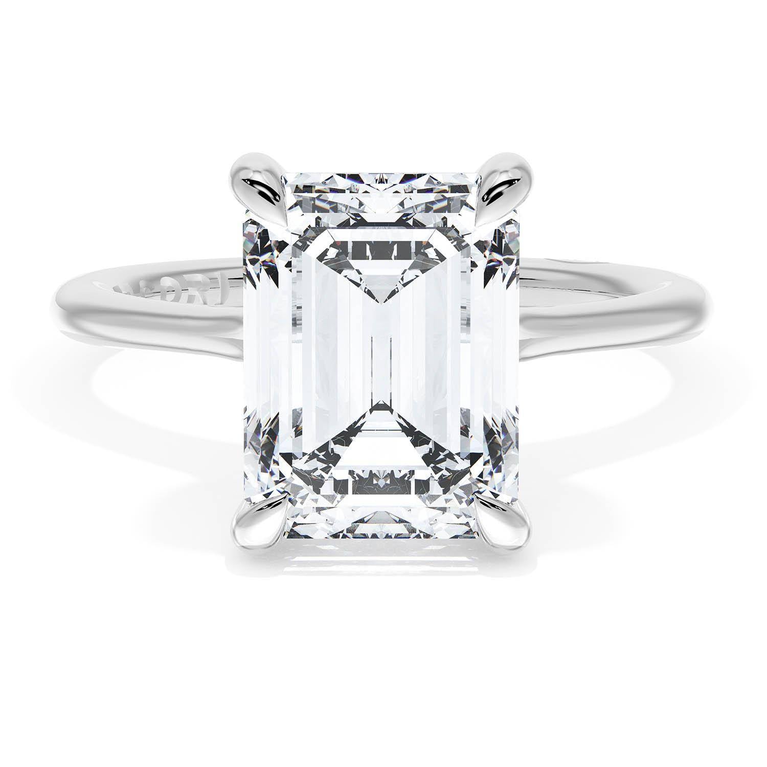 An Emerald Solitaire is set into a unique corset-inspired crown on a high-polish 18kt White Gold foundation. A diamond-studded Founder's Crescent marks the resting point.