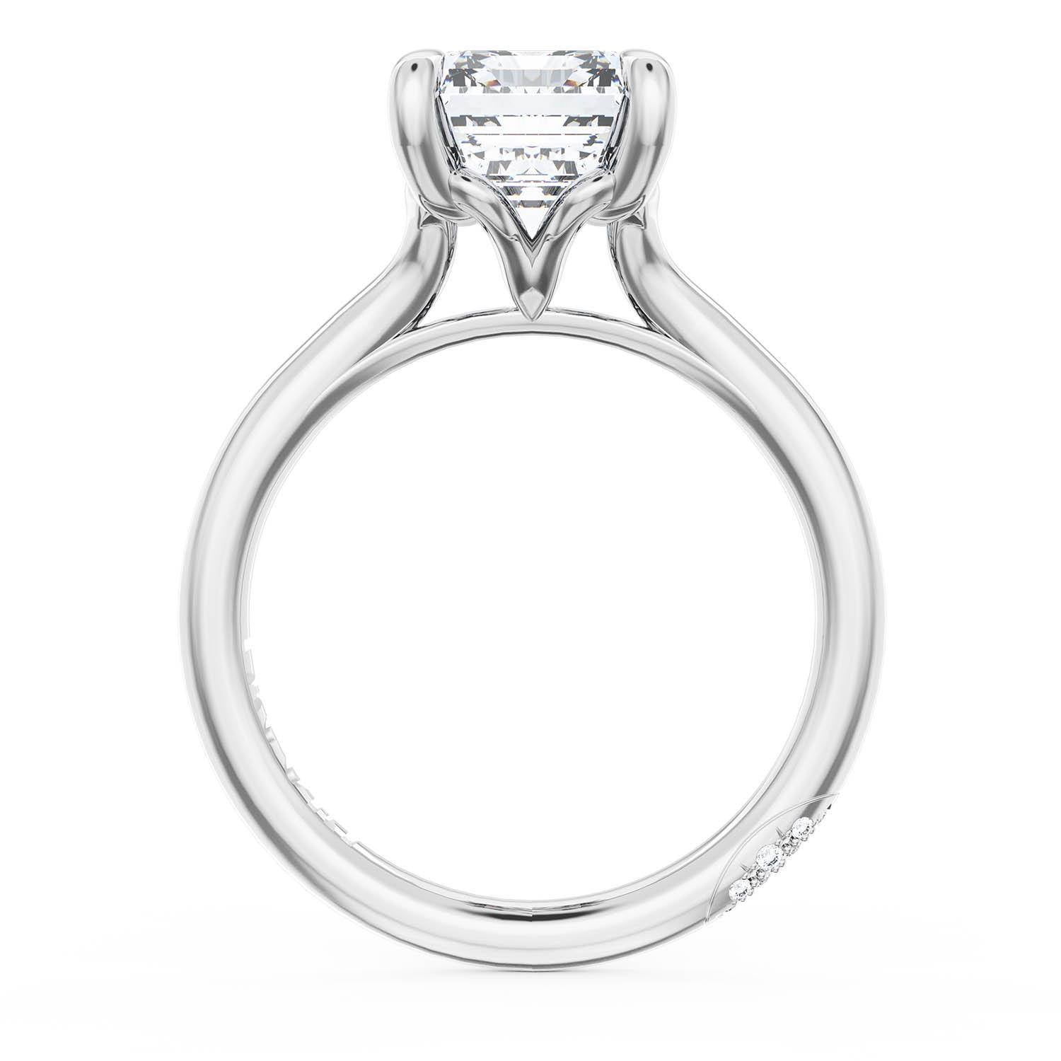 A Princess Solitaire is set into a unique corset-inspired crown on a high-polish 18kt White Gold foundation. A diamond-studded Founder's Crescent marks the resting point.