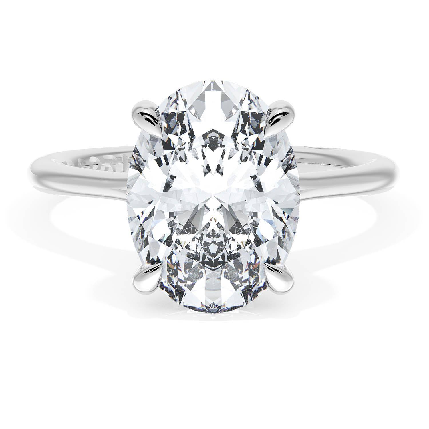 An Oval Solitaire is set into a unique corset-inspired crown on a high-polish 18kt White Gold foundation. A diamond-studded Founder's Crescent marks the resting point.