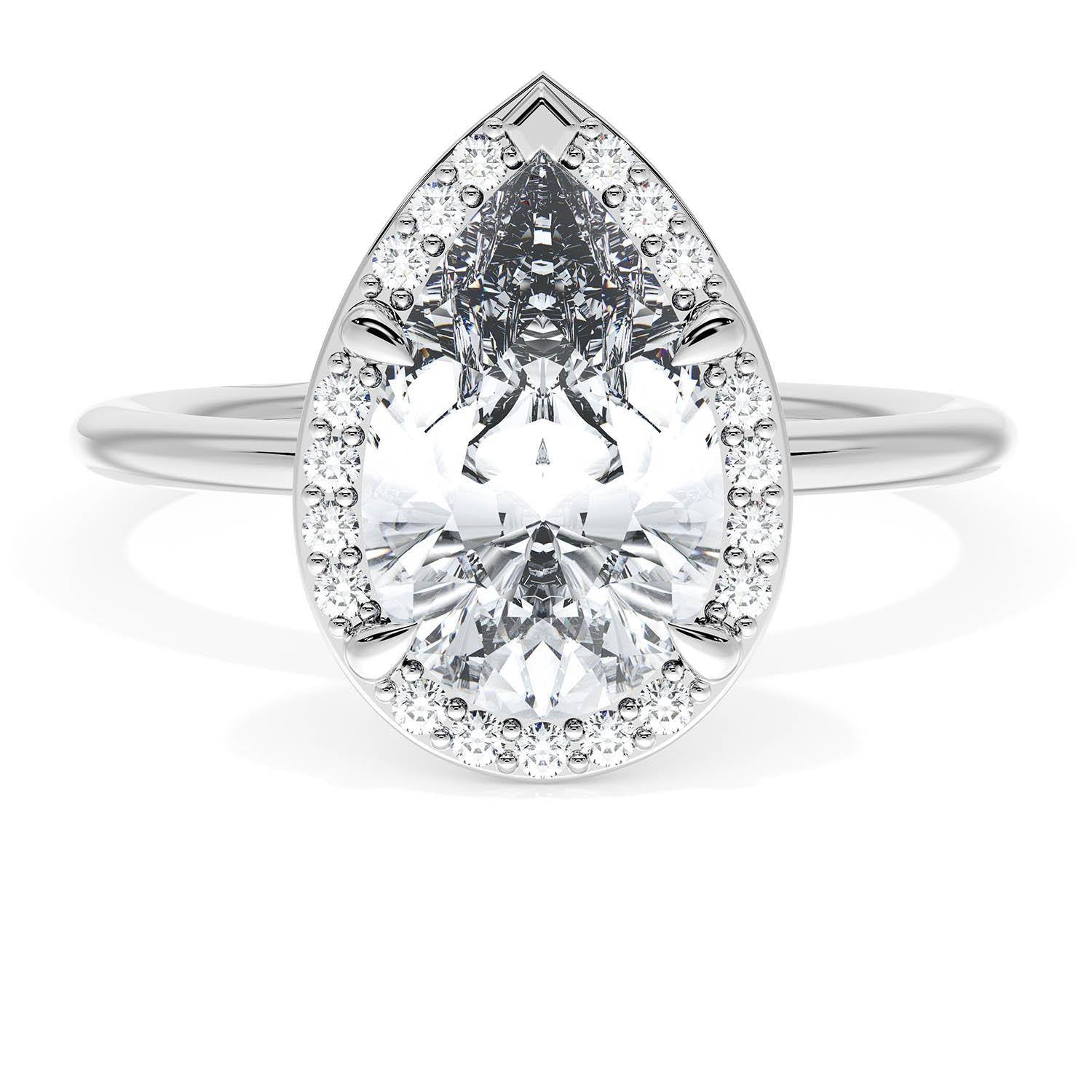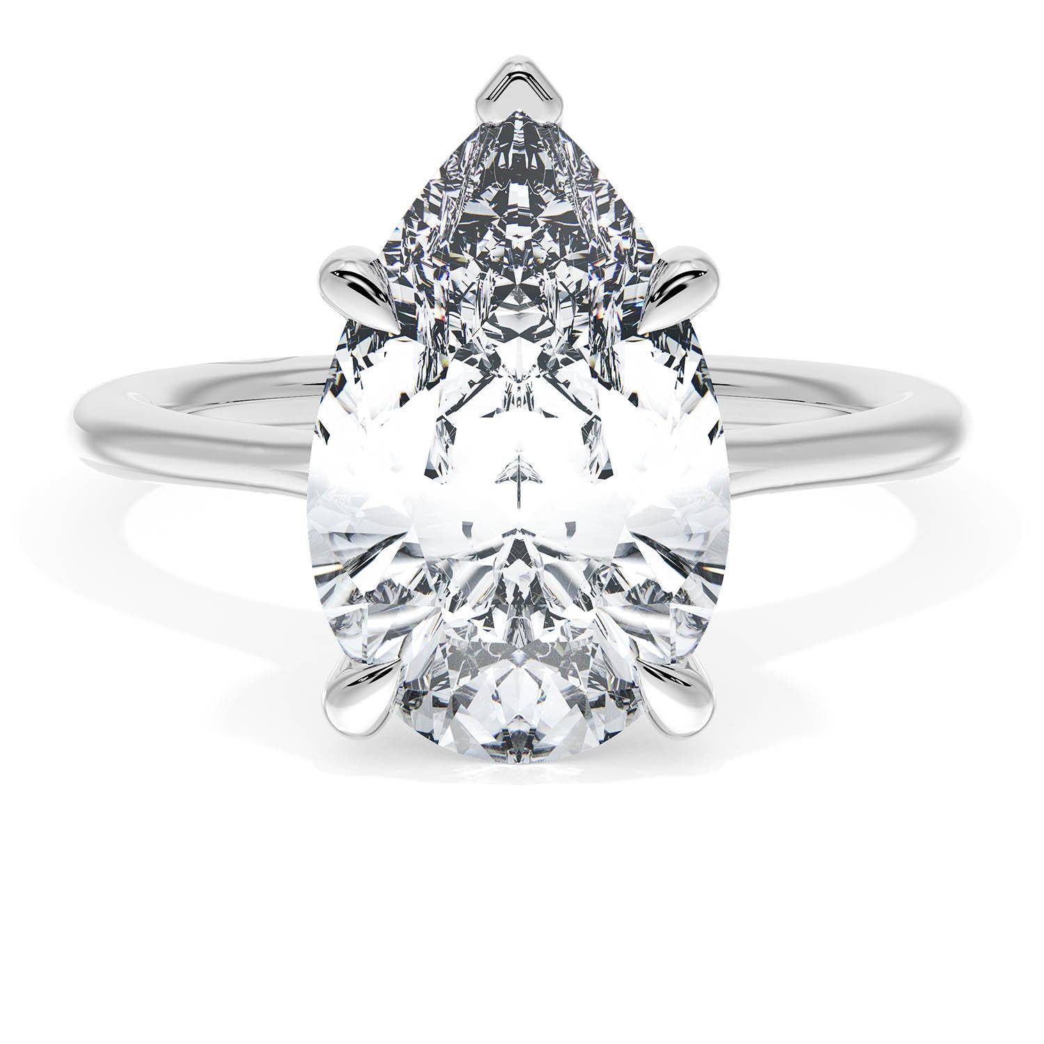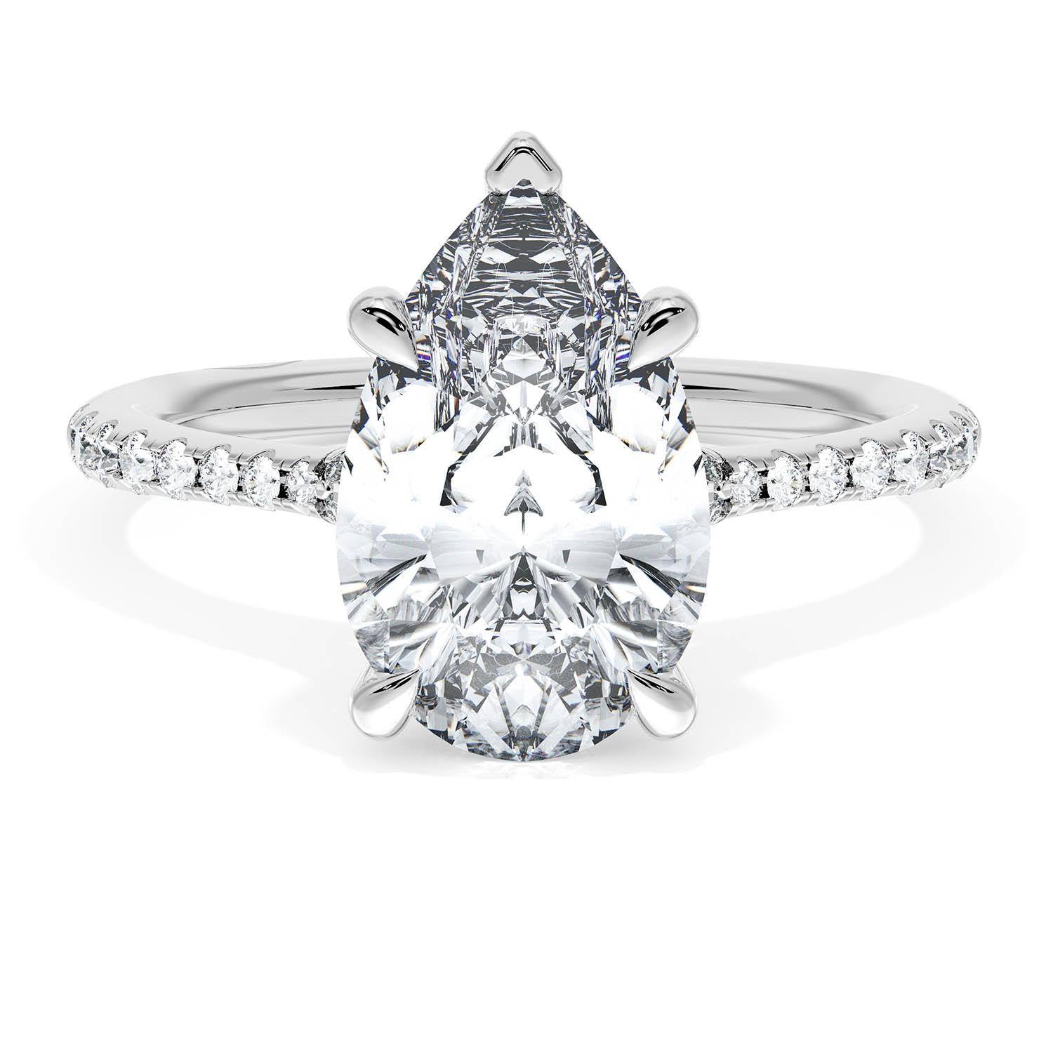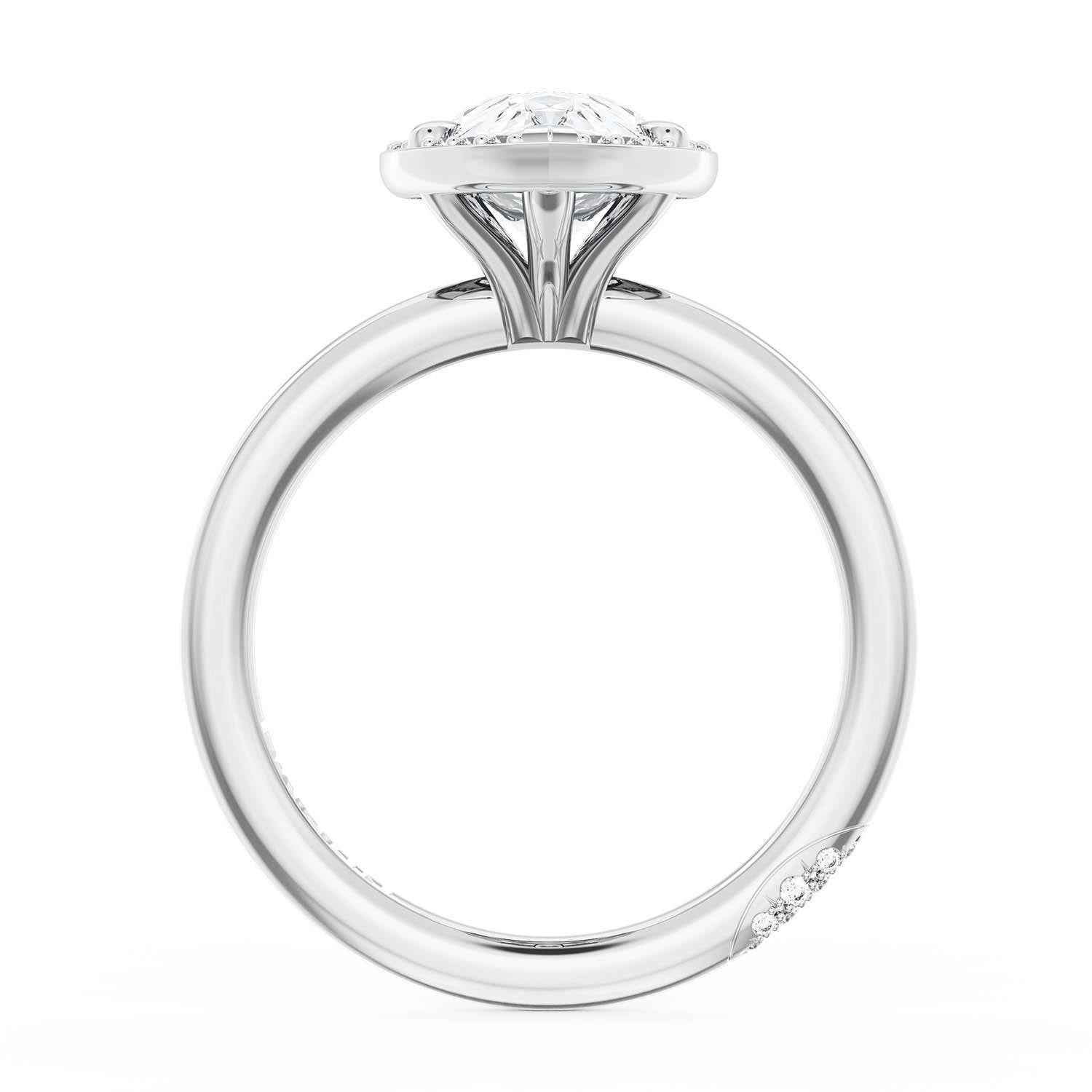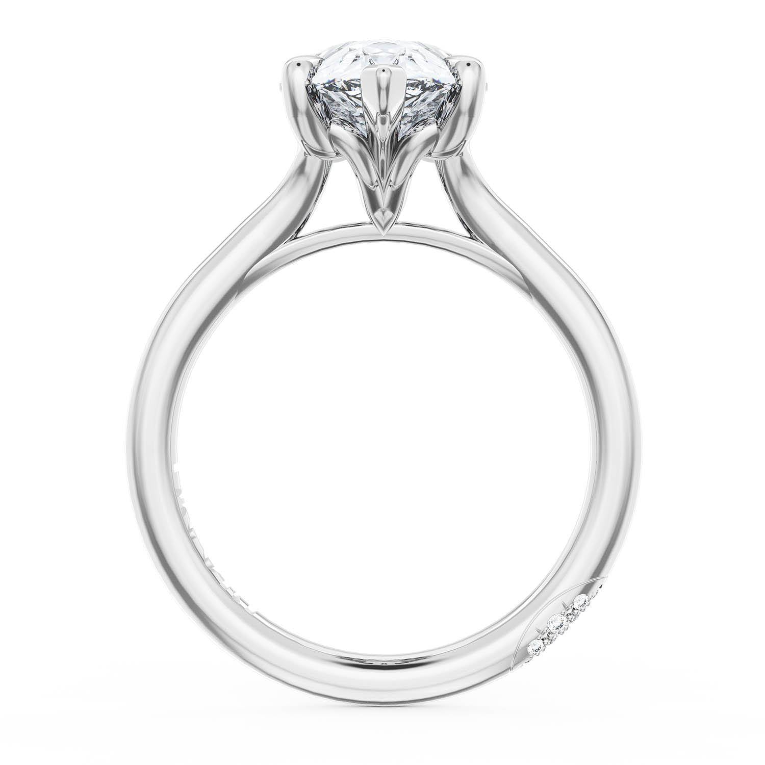 A Pear Solitaire is set into a unique corset-inspired crown on a high-polish 18kt White Gold foundation. A diamond-studded Founder's Crescent marks the resting point.