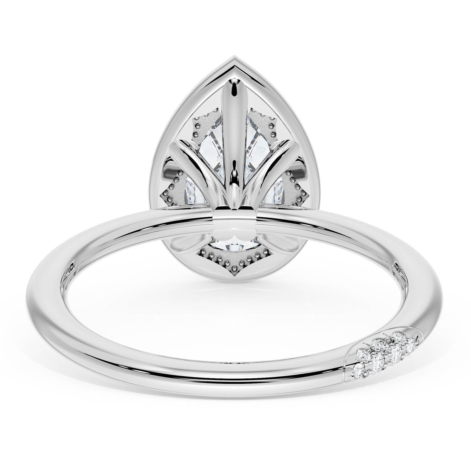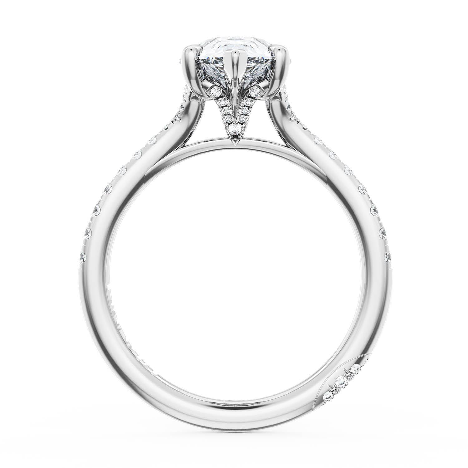 A Pear Solitaire is set into a unique corset-inspired crown on a 18kt White Gold foundation. Pavé-set diamonds decorate the ceiling and a diamond-studded Founder's Crescent marks the resting point.