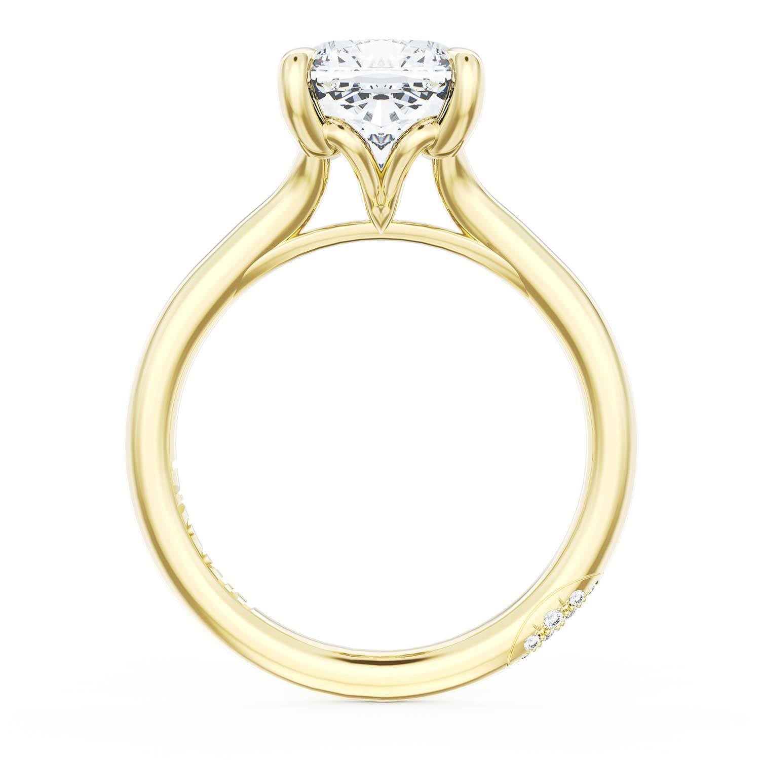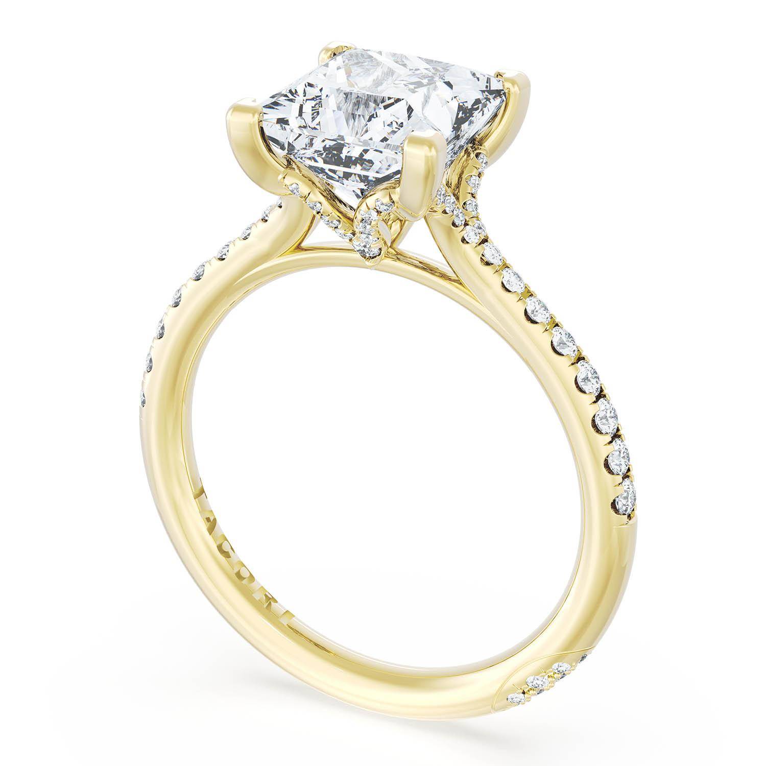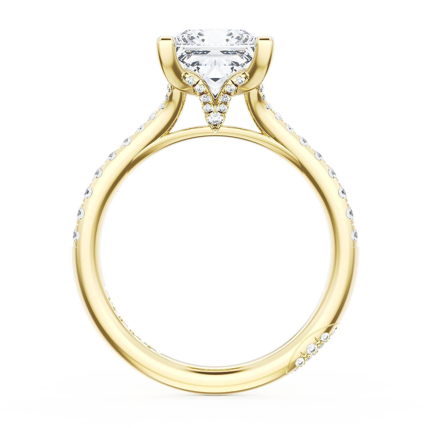 A Princess Solitaire is set into a unique corset-inspired crown on a 18kt Yellow Gold foundation. Pavé-set diamonds decorate the ceiling and a diamond-studded Founder's Crescent marks the resting point.