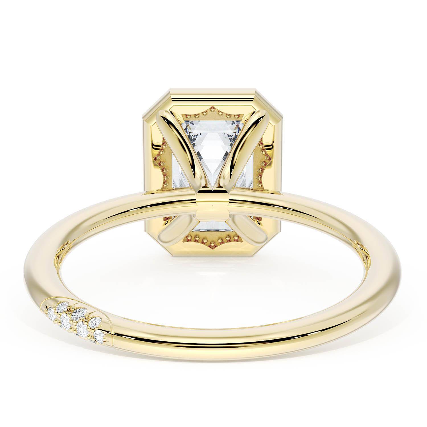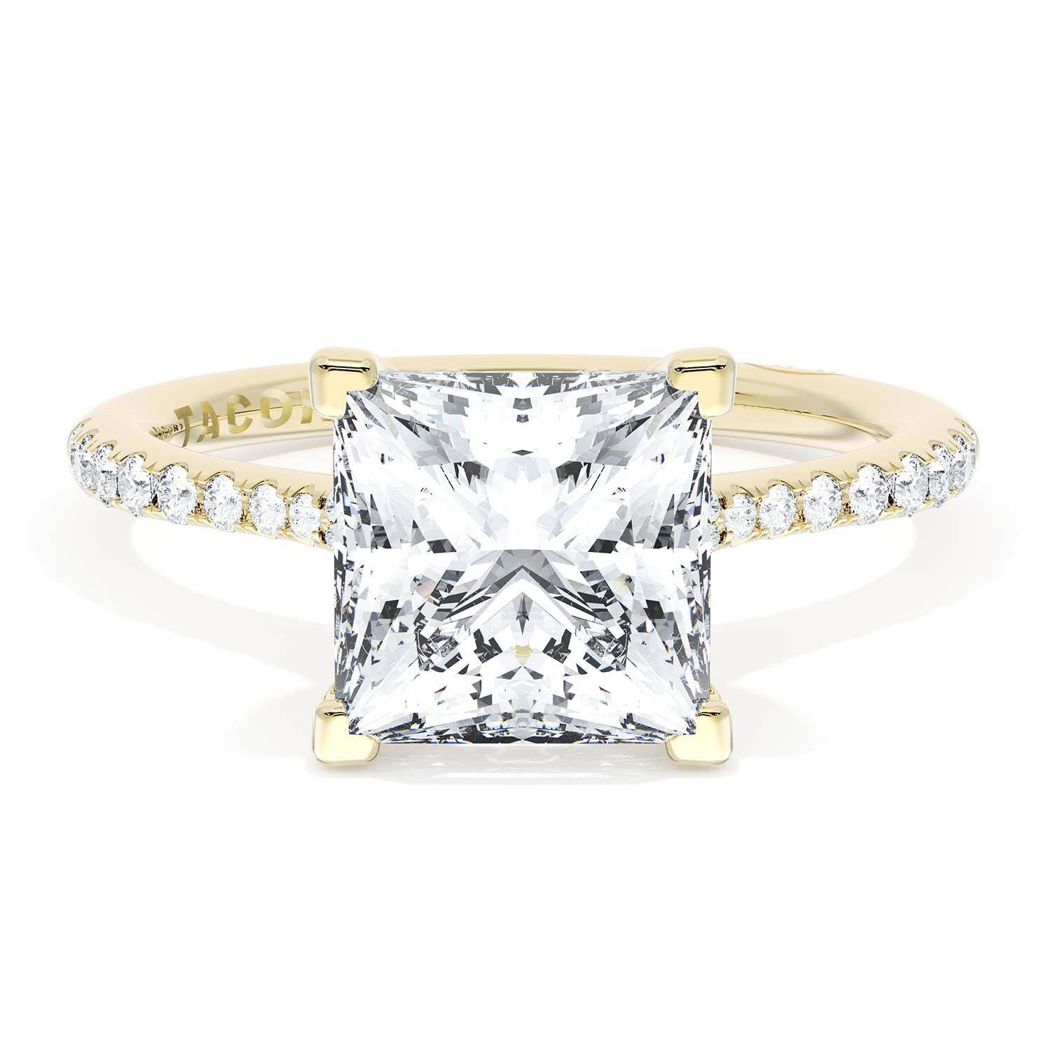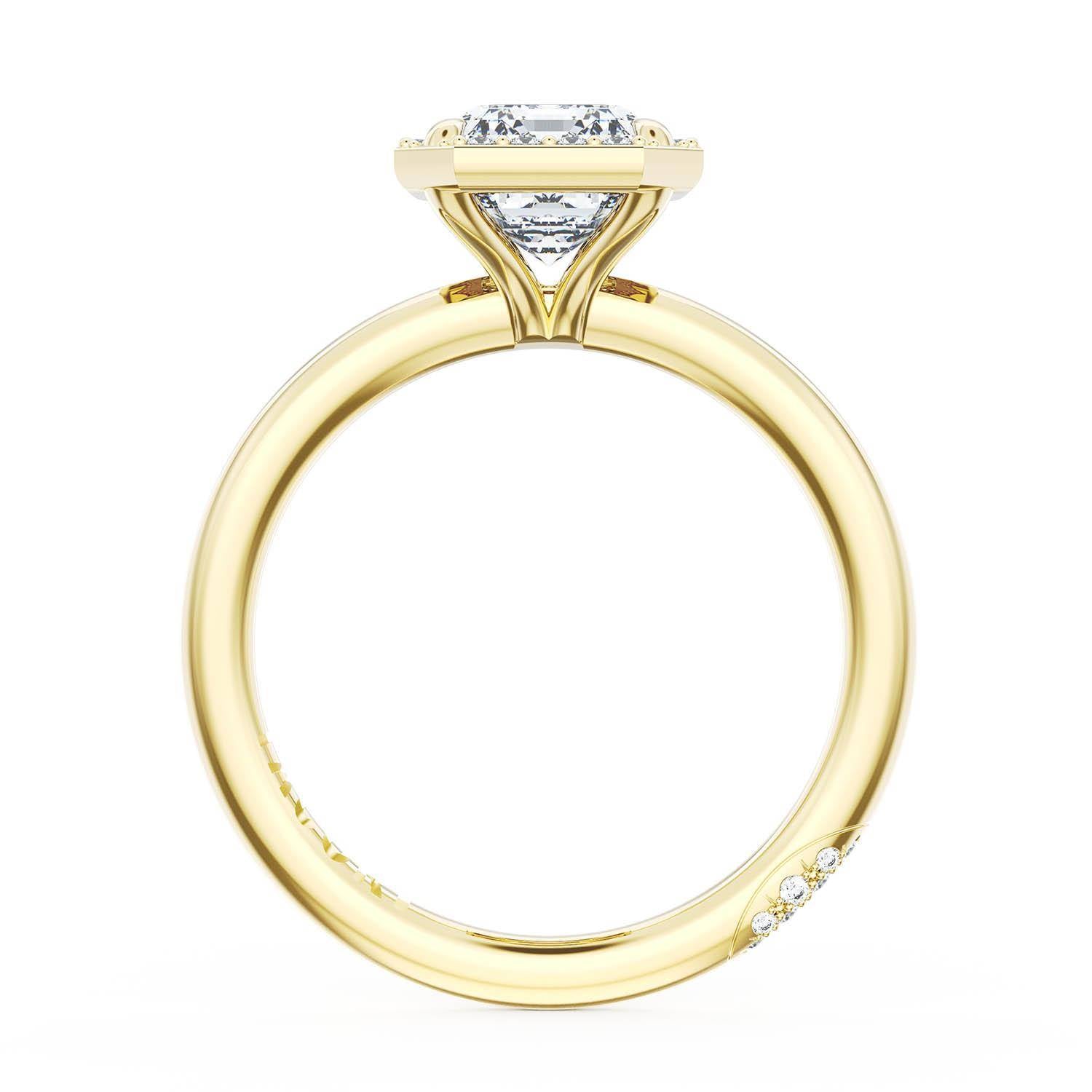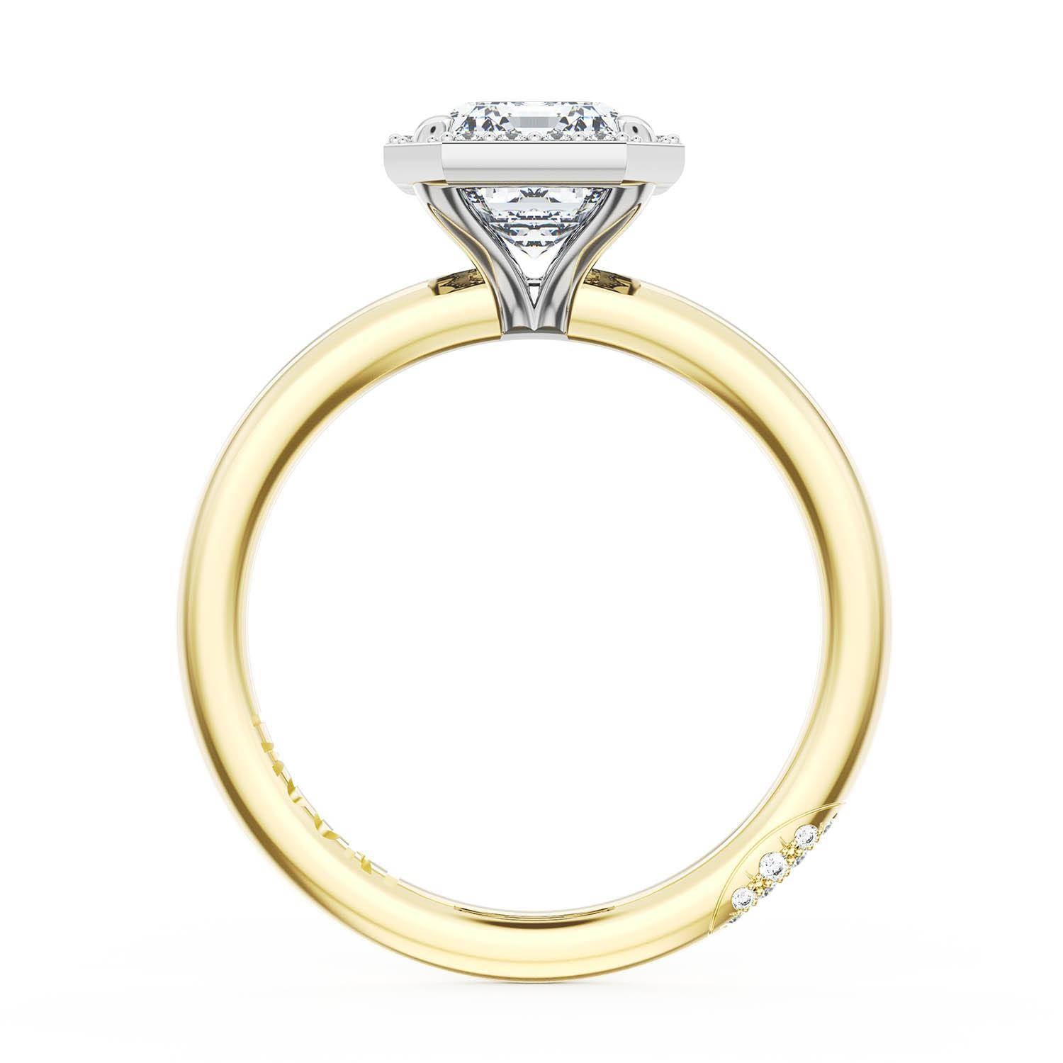 A Princess Solitaire is set into a unique corset-inspired crown on a 18kt Yellow Gold foundation. Pavé-set diamonds decorate the ceiling and a diamond-studded Founder's Crescent marks the resting point.