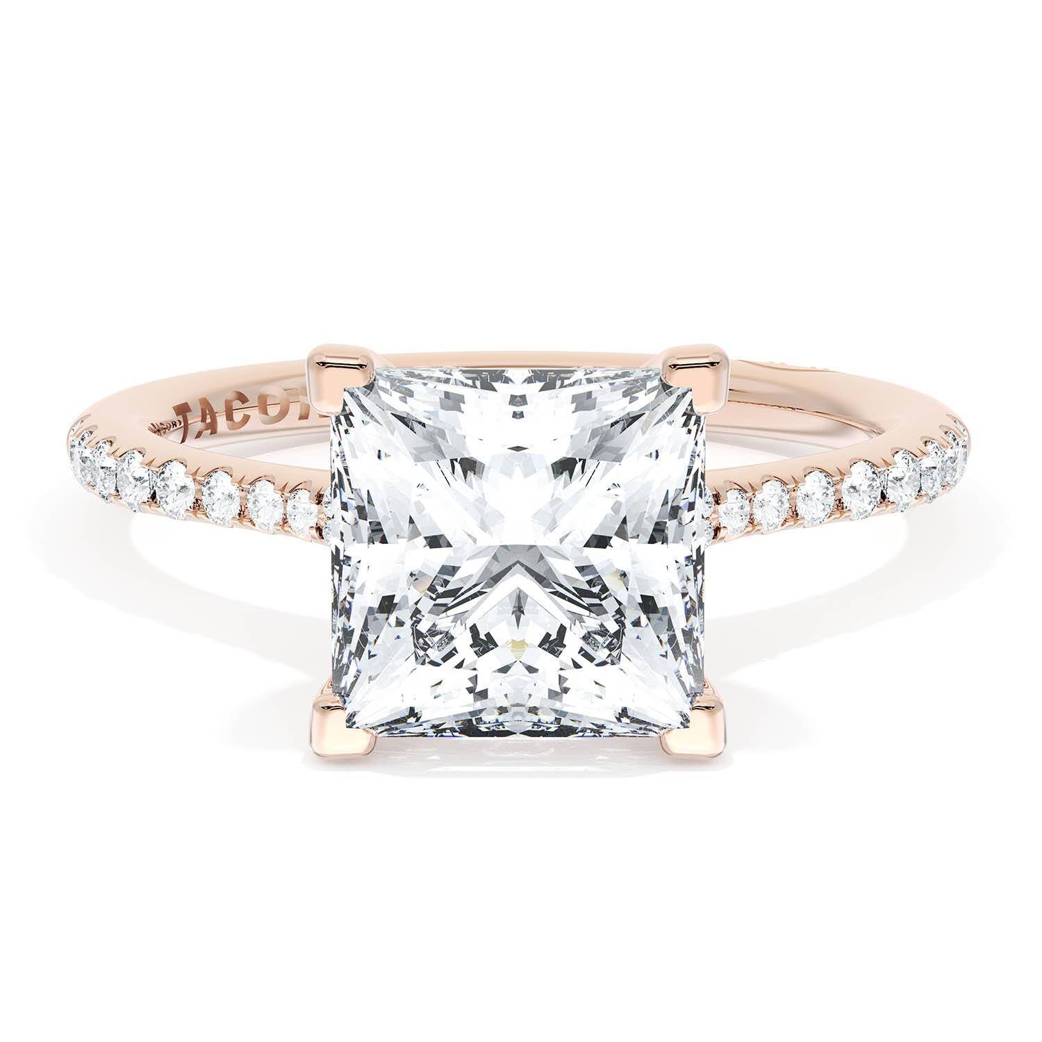 A Princess Solitaire is set into a unique corset-inspired crown on a 18kt Rose Gold foundation. Pavé-set diamonds decorate the ceiling and a diamond-studded Founder's Crescent marks the resting point.