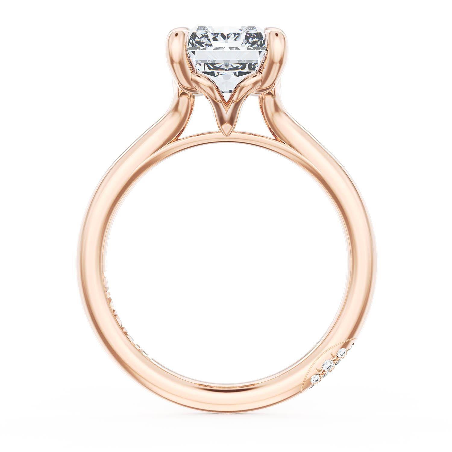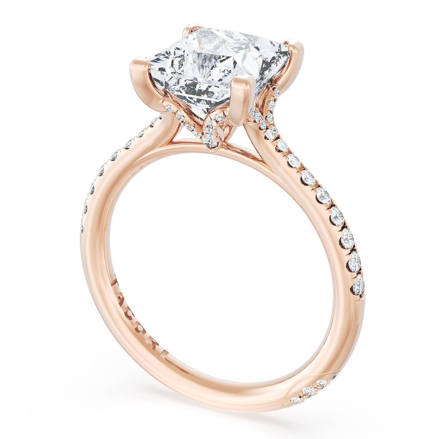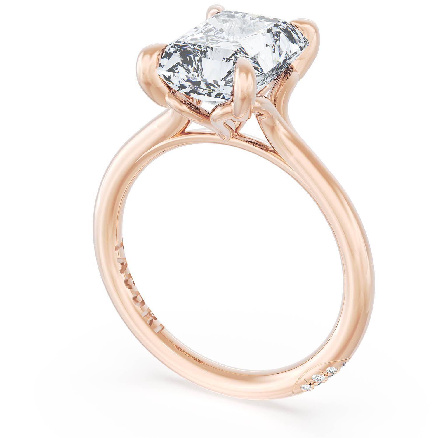 A Radiant Solitaire is set into a unique corset-inspired crown on a high-polish 18kt Rose Gold foundation. A diamond-studded Founder's Crescent marks the resting point.