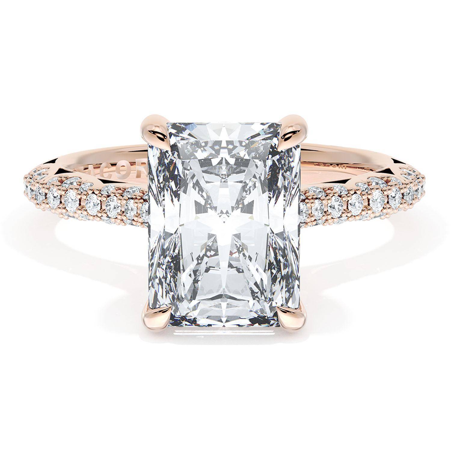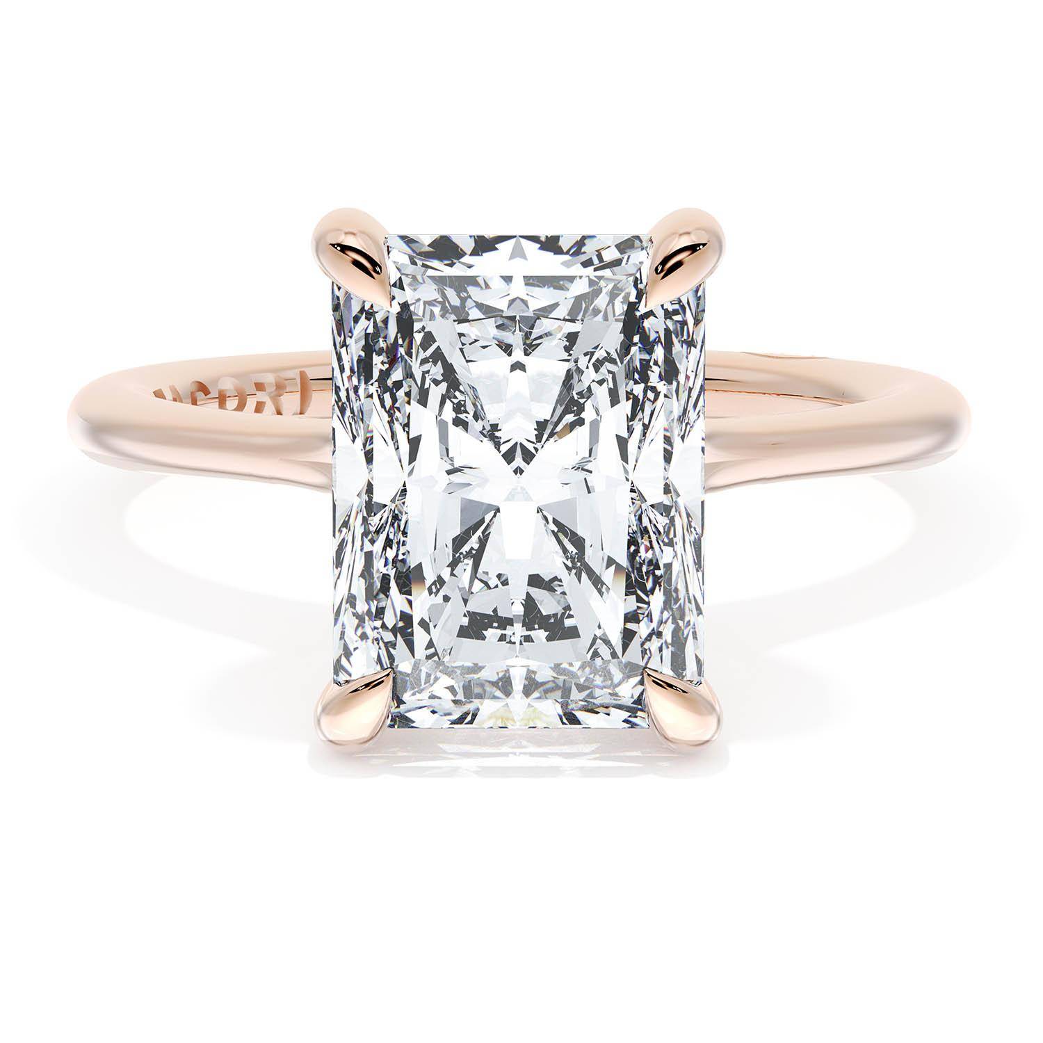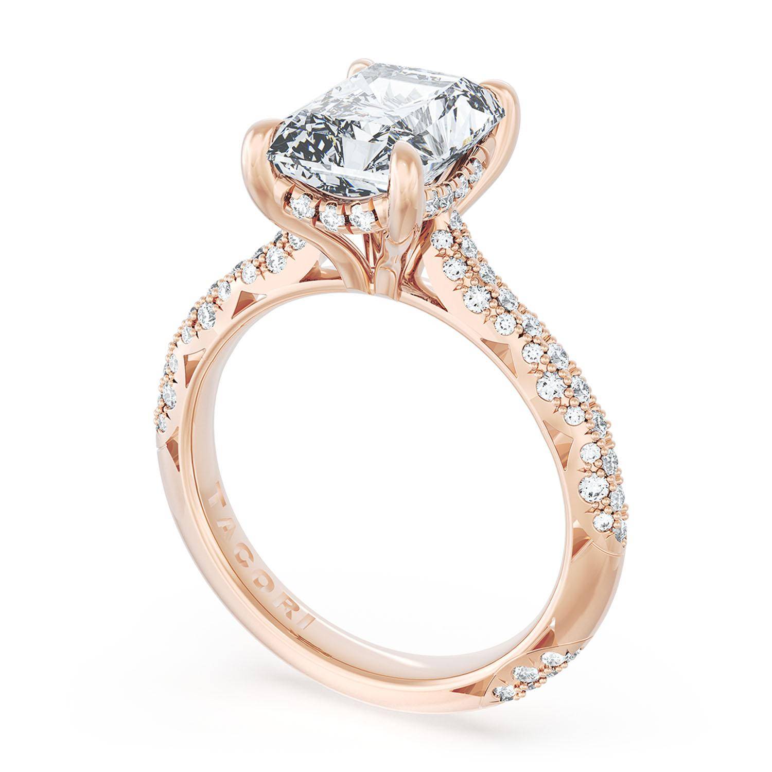 A Radiant Solitaire is set into a unique corset-inspired crown on a high-polish 18kt Rose Gold foundation. A diamond-studded Founder's Crescent marks the resting point.