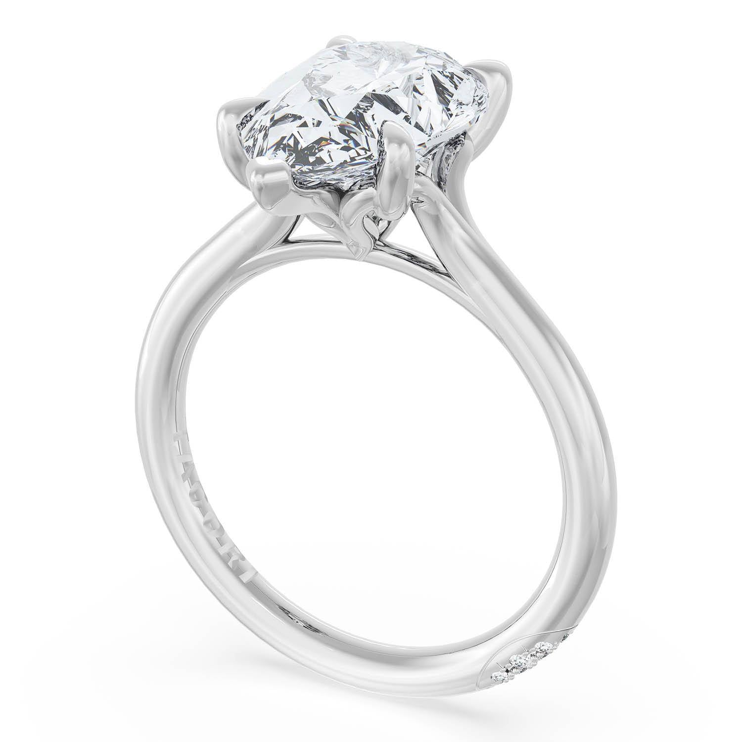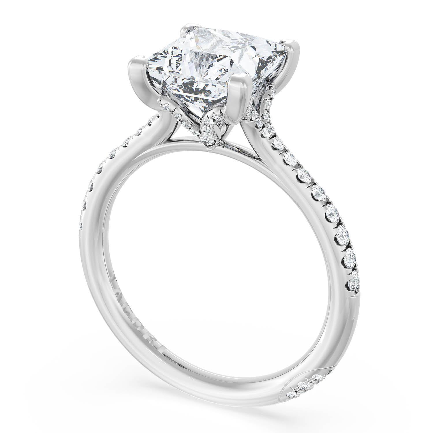A Radiant Solitaire is set into a unique corset-inspired crown on a high-polish 18kt White Gold foundation. A diamond-studded Founder's Crescent marks the resting point.