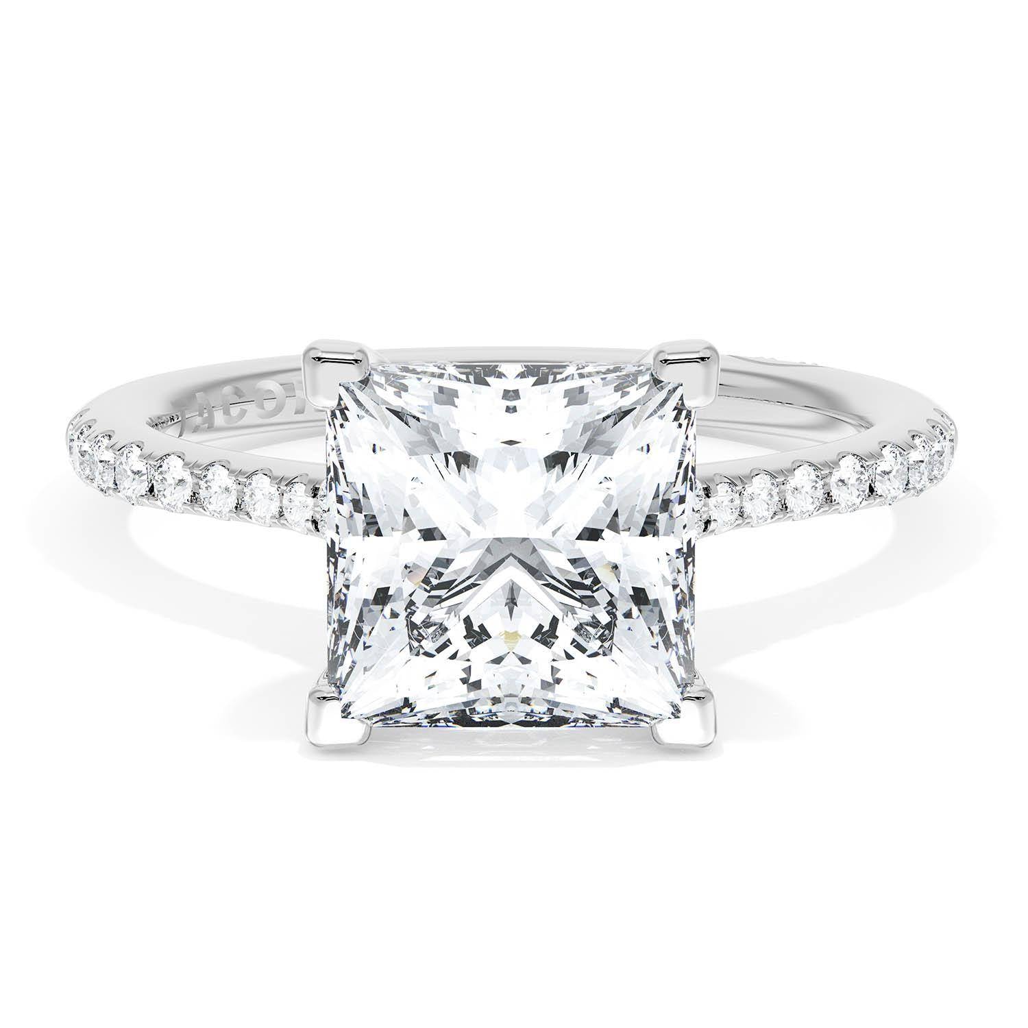 A Princess Solitaire is set into a unique corset-inspired crown on a 18kt White Gold foundation. Pavé-set diamonds decorate the ceiling and a diamond-studded Founder's Crescent marks the resting point.