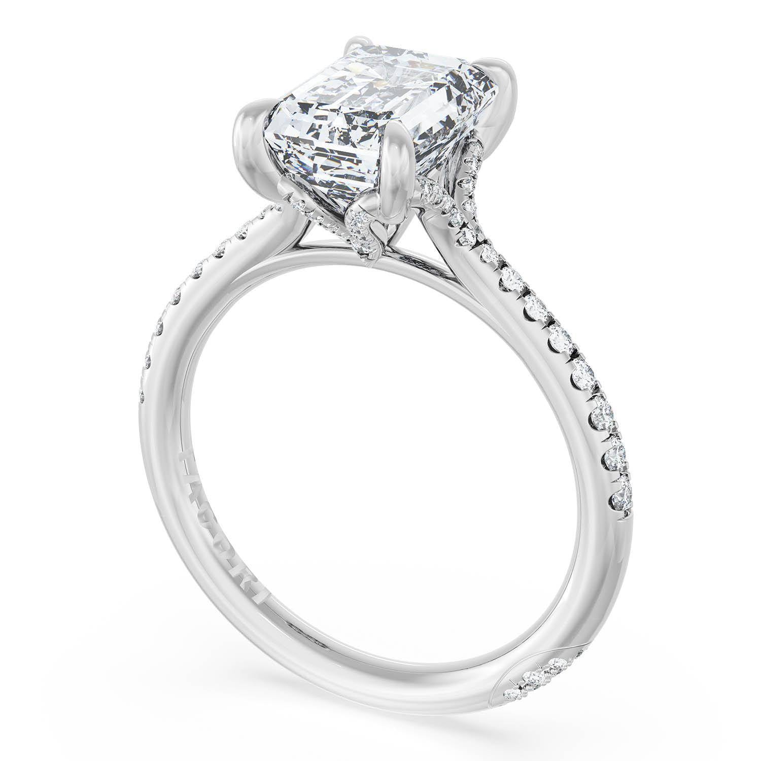 An Emerald Solitaire is set into a unique corset-inspired crown on a Platinum foundation. Pavé-set diamonds decorate the ceiling and a diamond-studded Founder's Crescent marks the resting point.