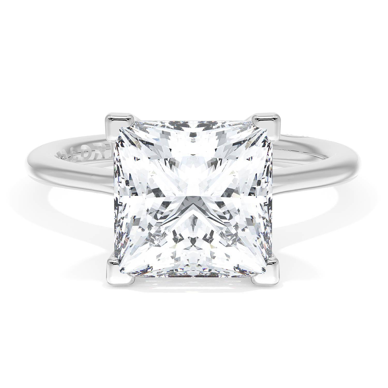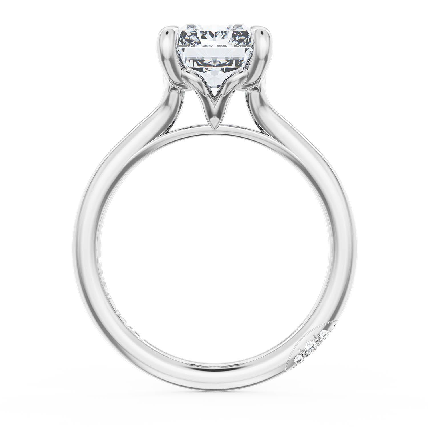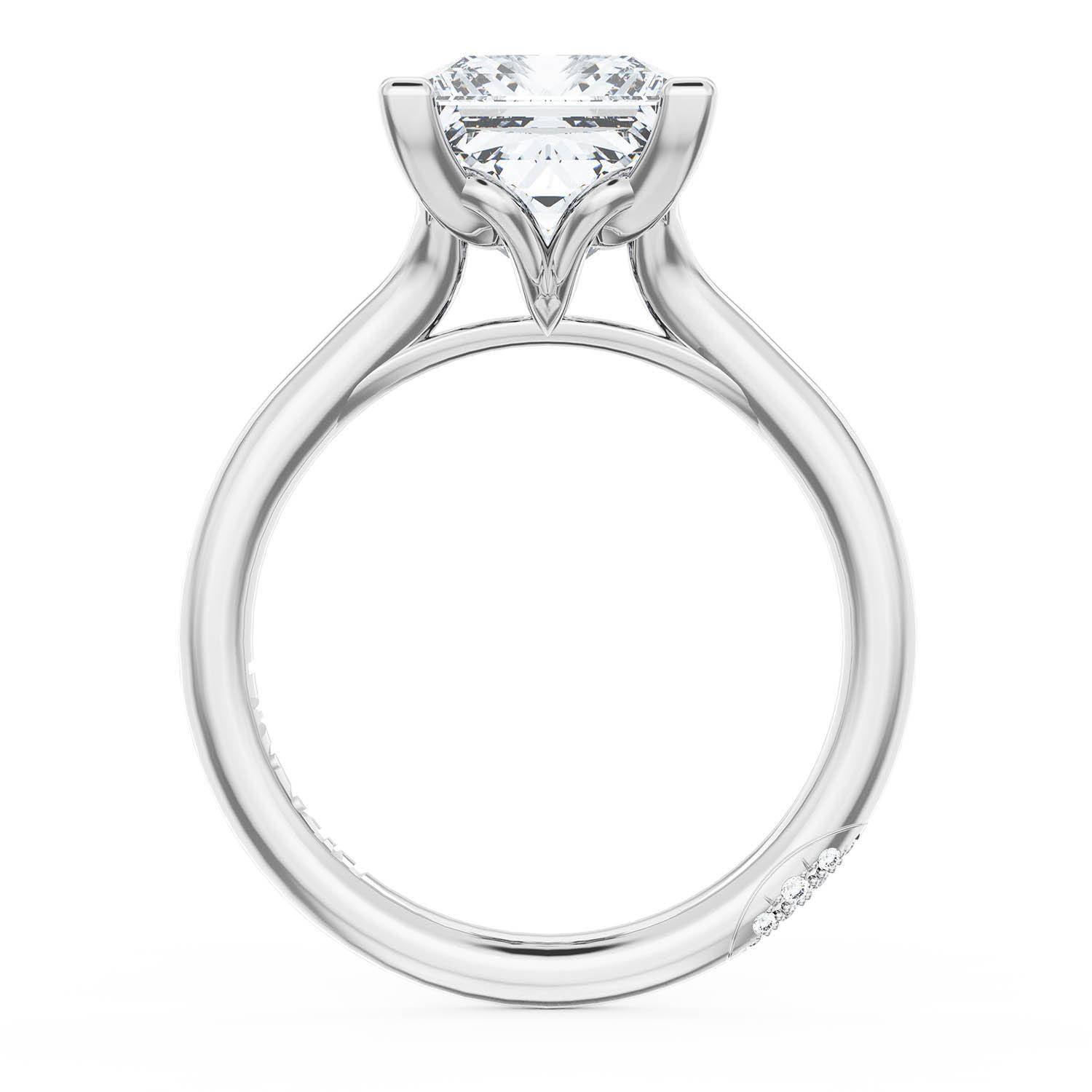 A Princess Solitaire is set into a unique corset-inspired crown on a high-polish Platinum foundation. A diamond-studded Founder's Crescent marks the resting point.