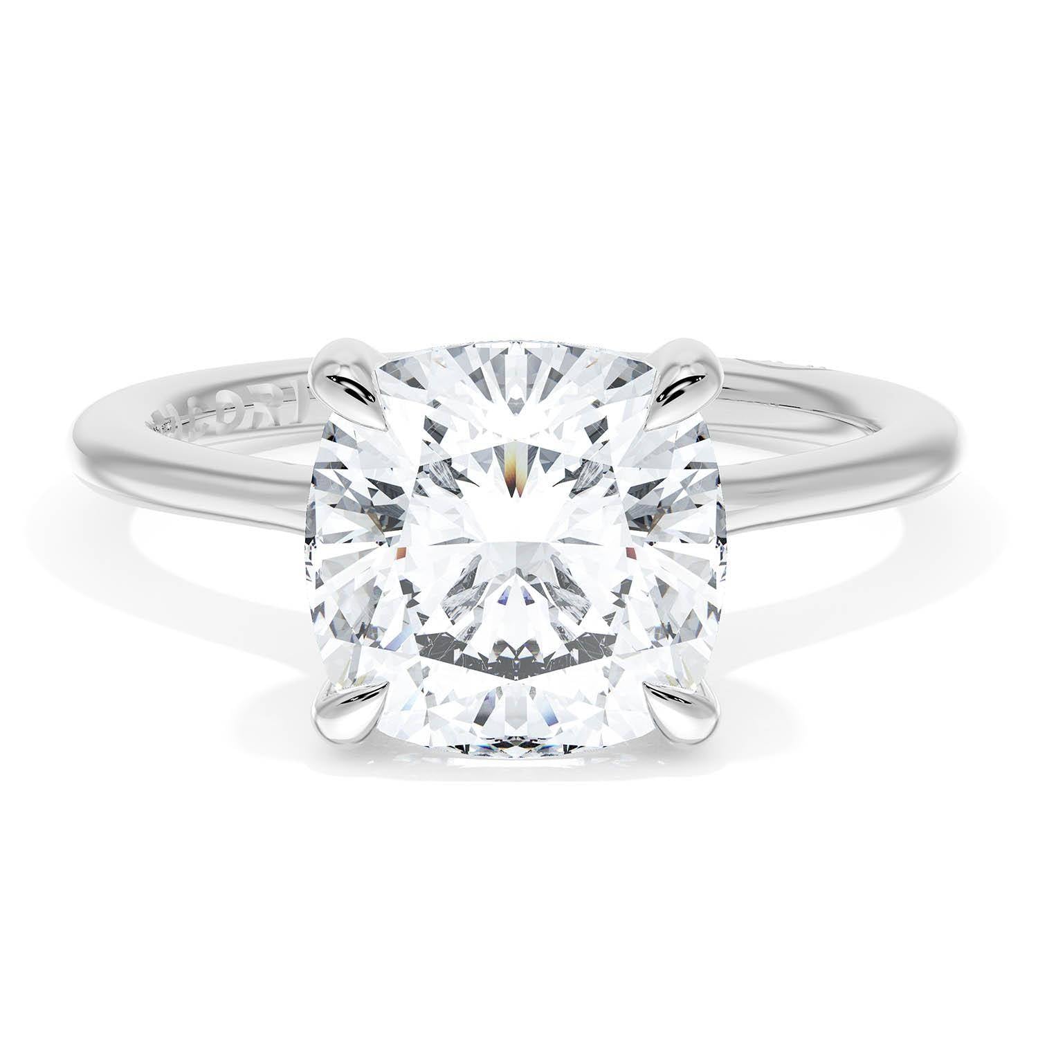 A Cushion Solitaire is set into a unique corset-inspired crown on a high-polish 18kt White Gold foundation. A diamond-studded Founder's Crescent marks the resting point.