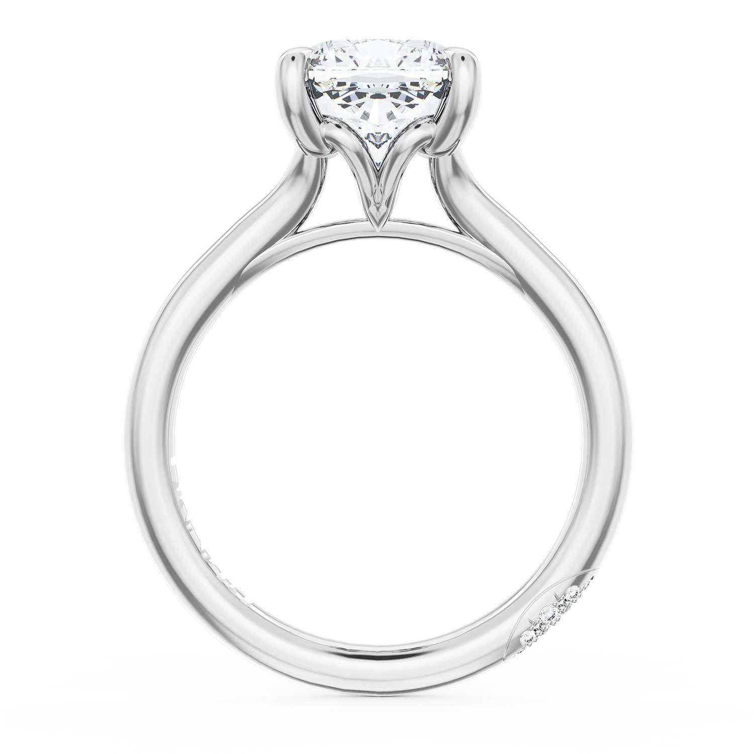 A Cushion Solitaire is set into a unique corset-inspired crown on a high-polish Platinum foundation. A diamond-studded Founder's Crescent marks the resting point.