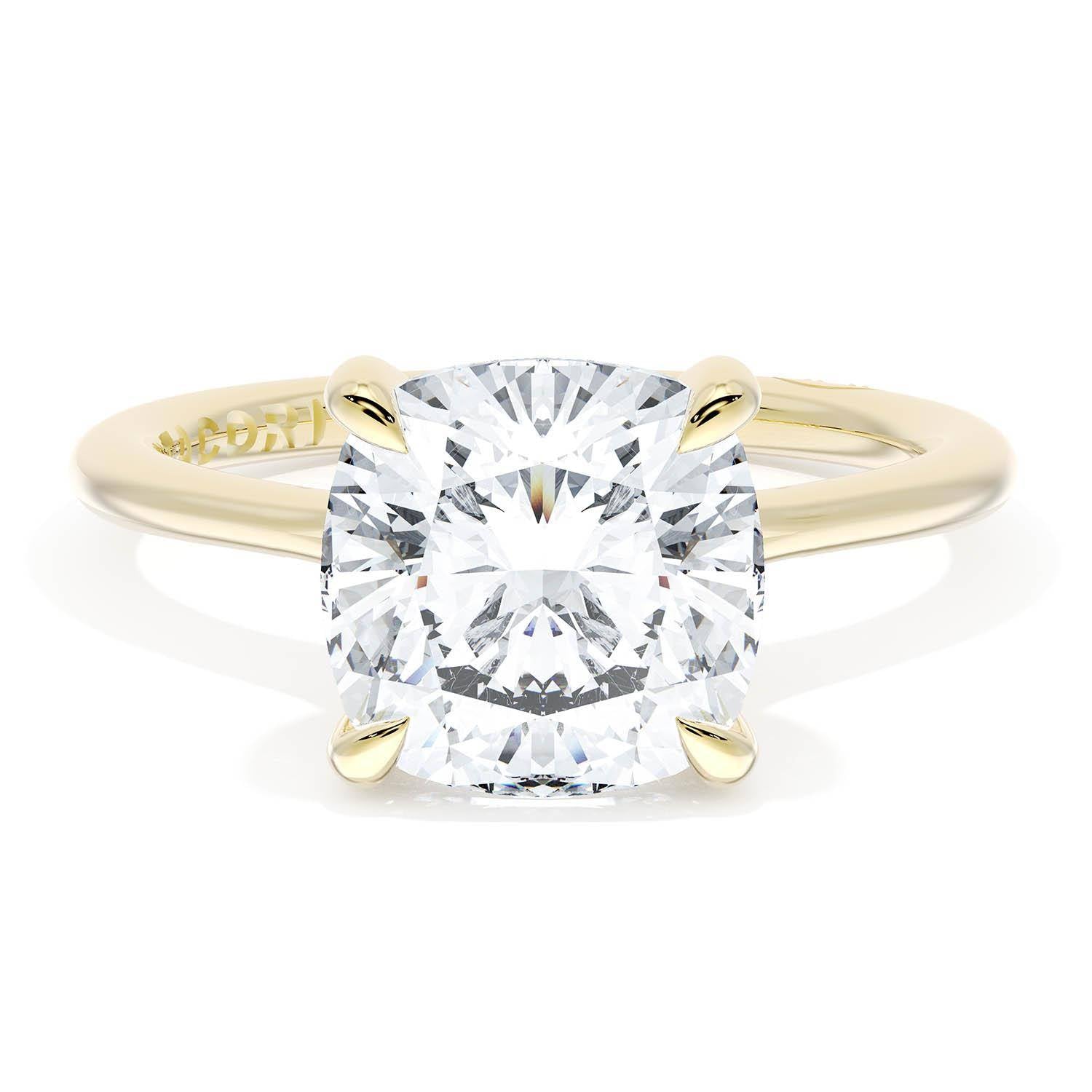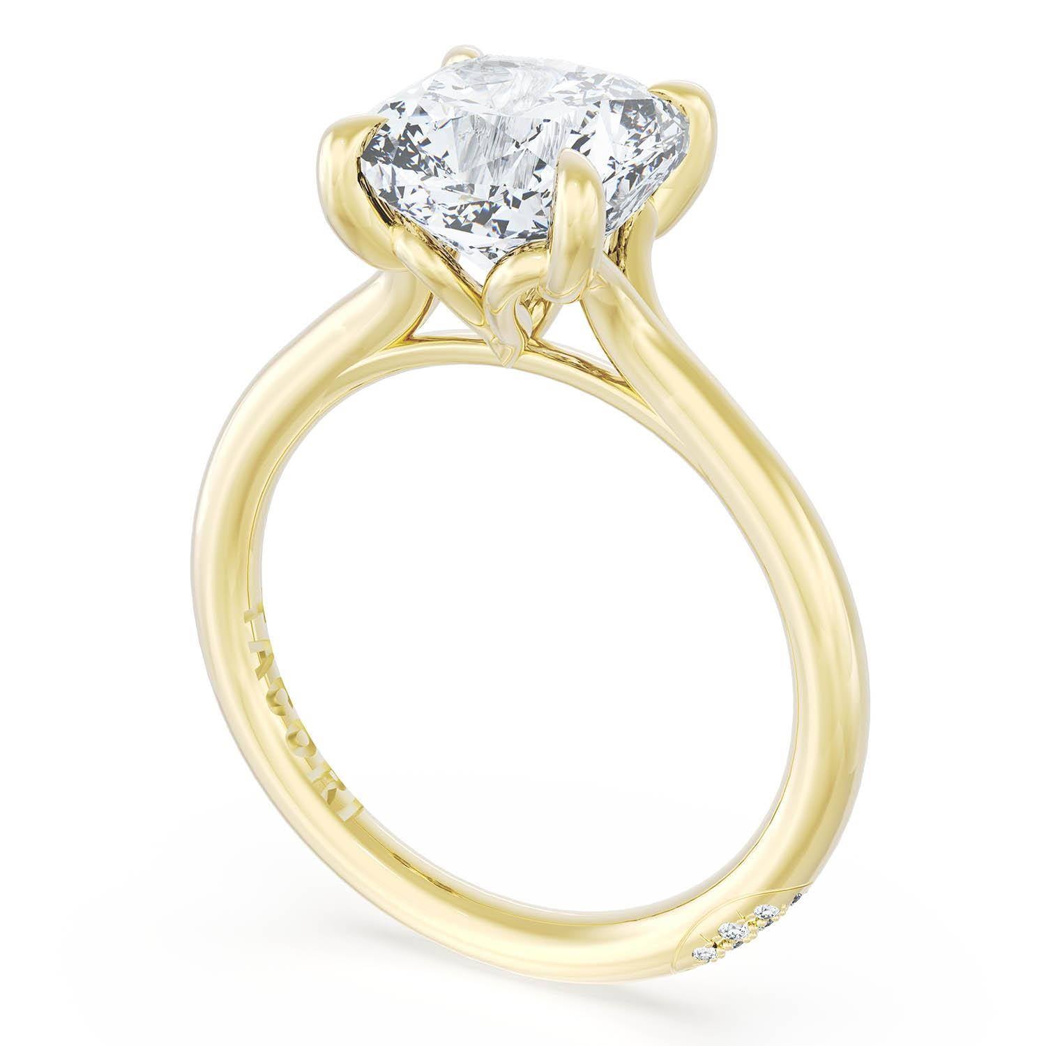 A Cushion Solitaire is set into a unique corset-inspired crown on a high-polish 18kt Yellow Gold foundation. A diamond-studded Founder's Crescent marks the resting point.