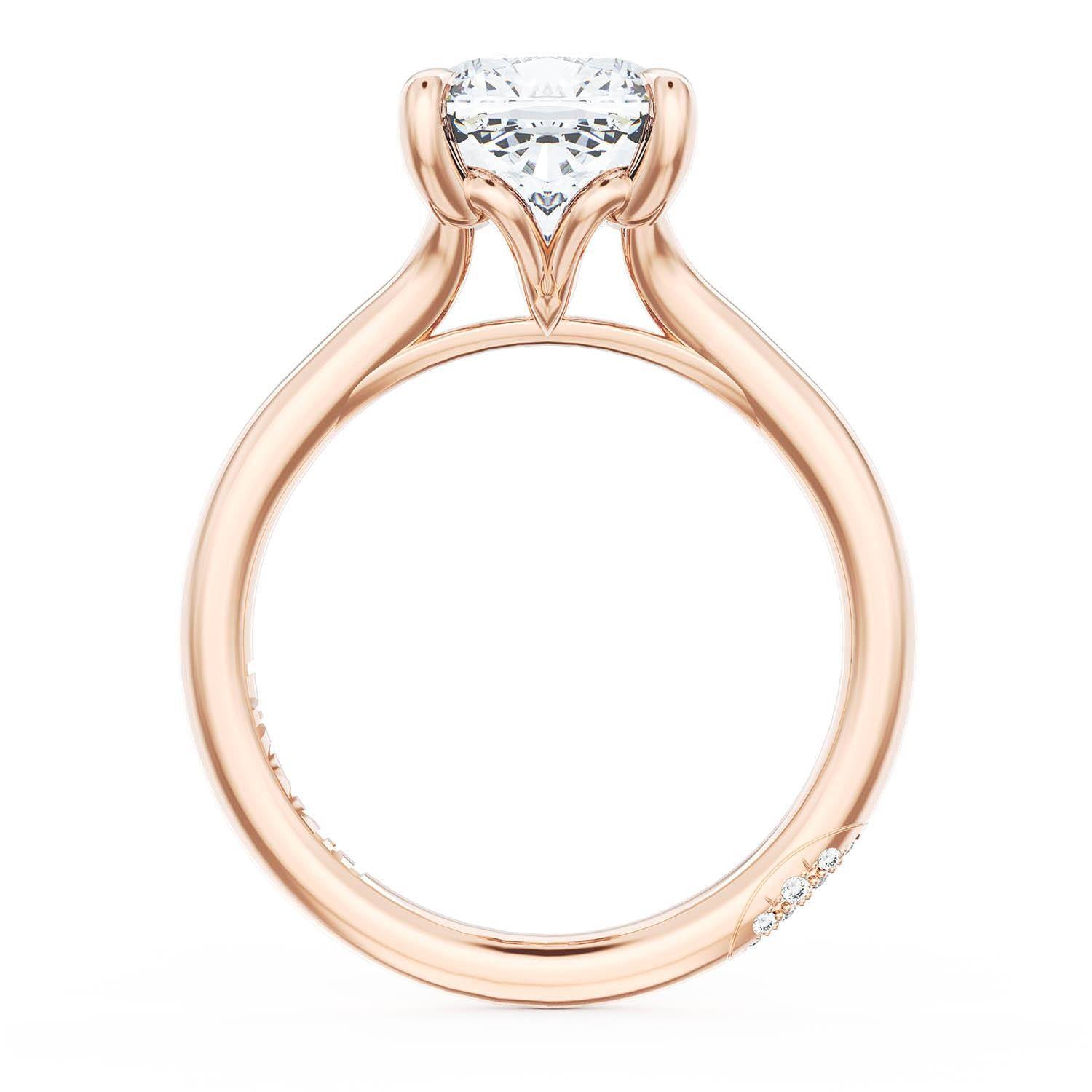 A Cushion Solitaire is set into a unique corset-inspired crown on a high-polish 18kt Rose Gold foundation. A diamond-studded Founder's Crescent marks the resting point.