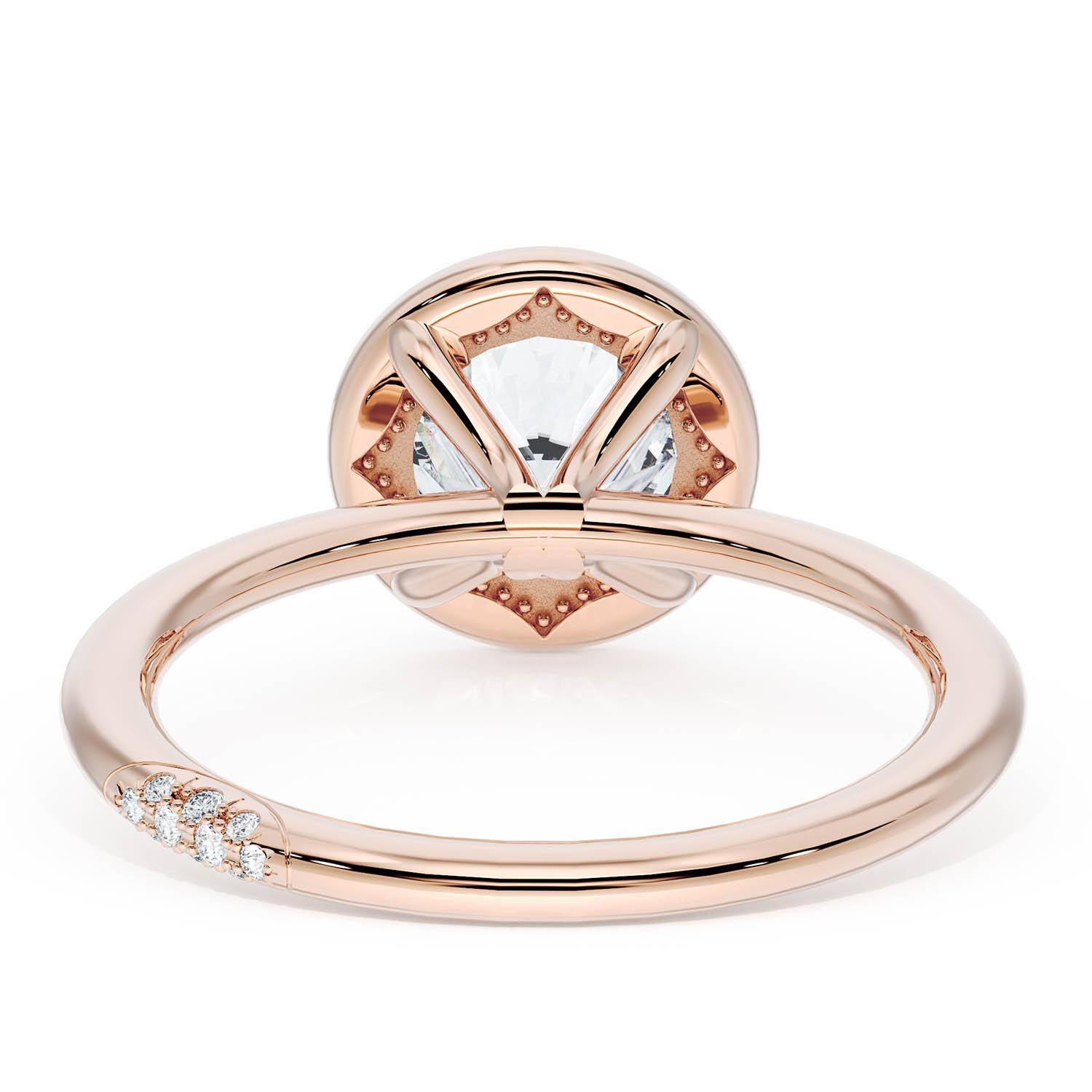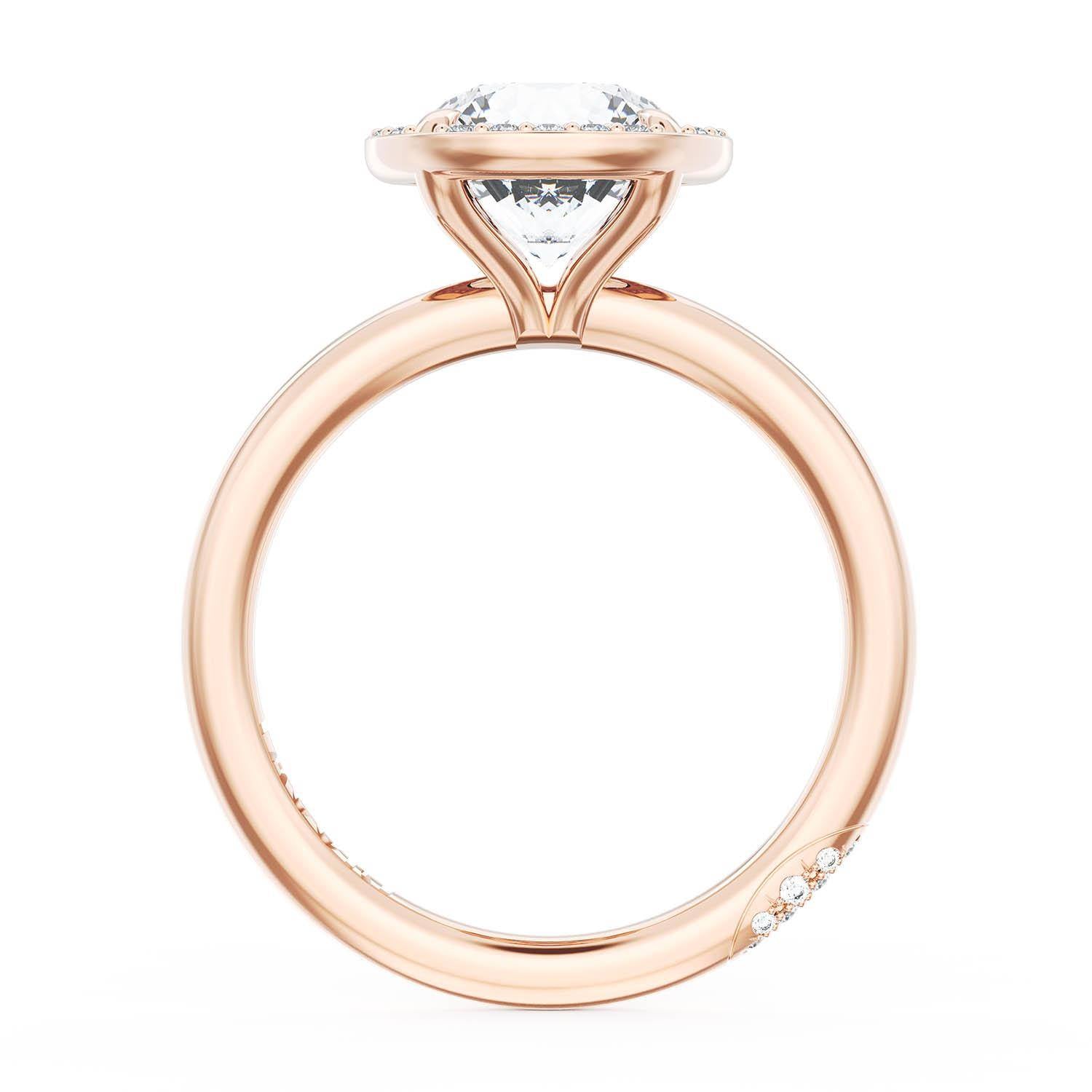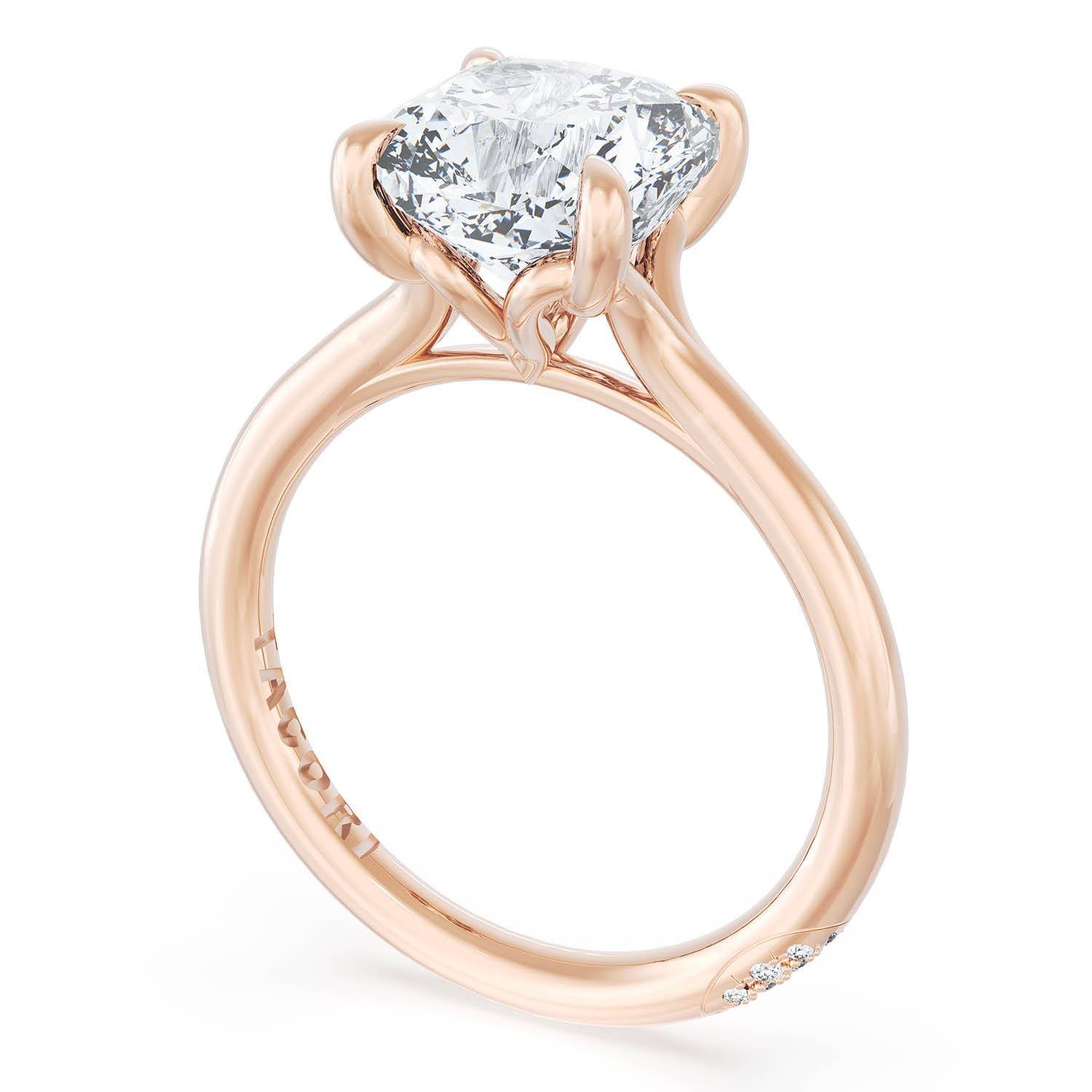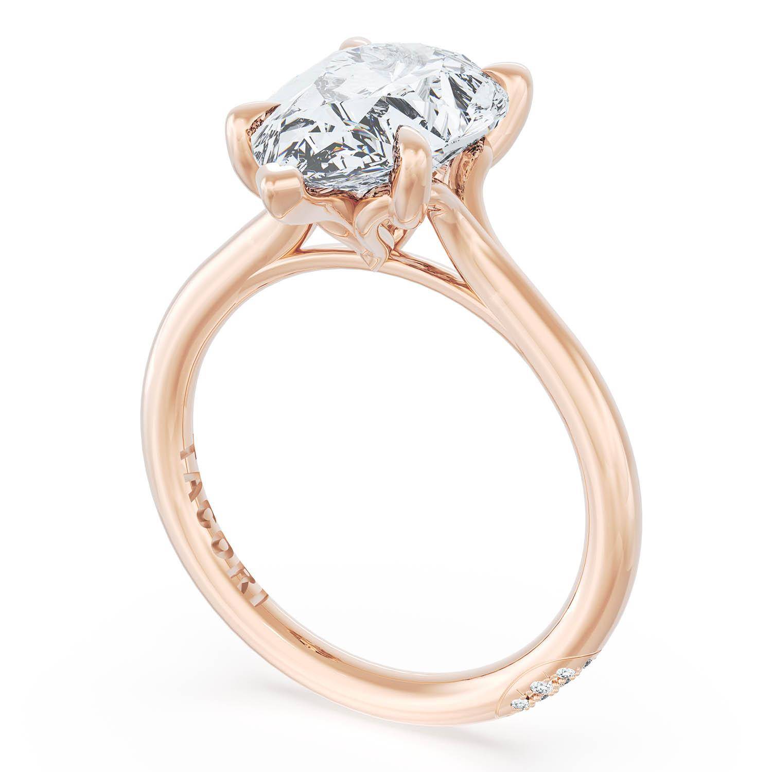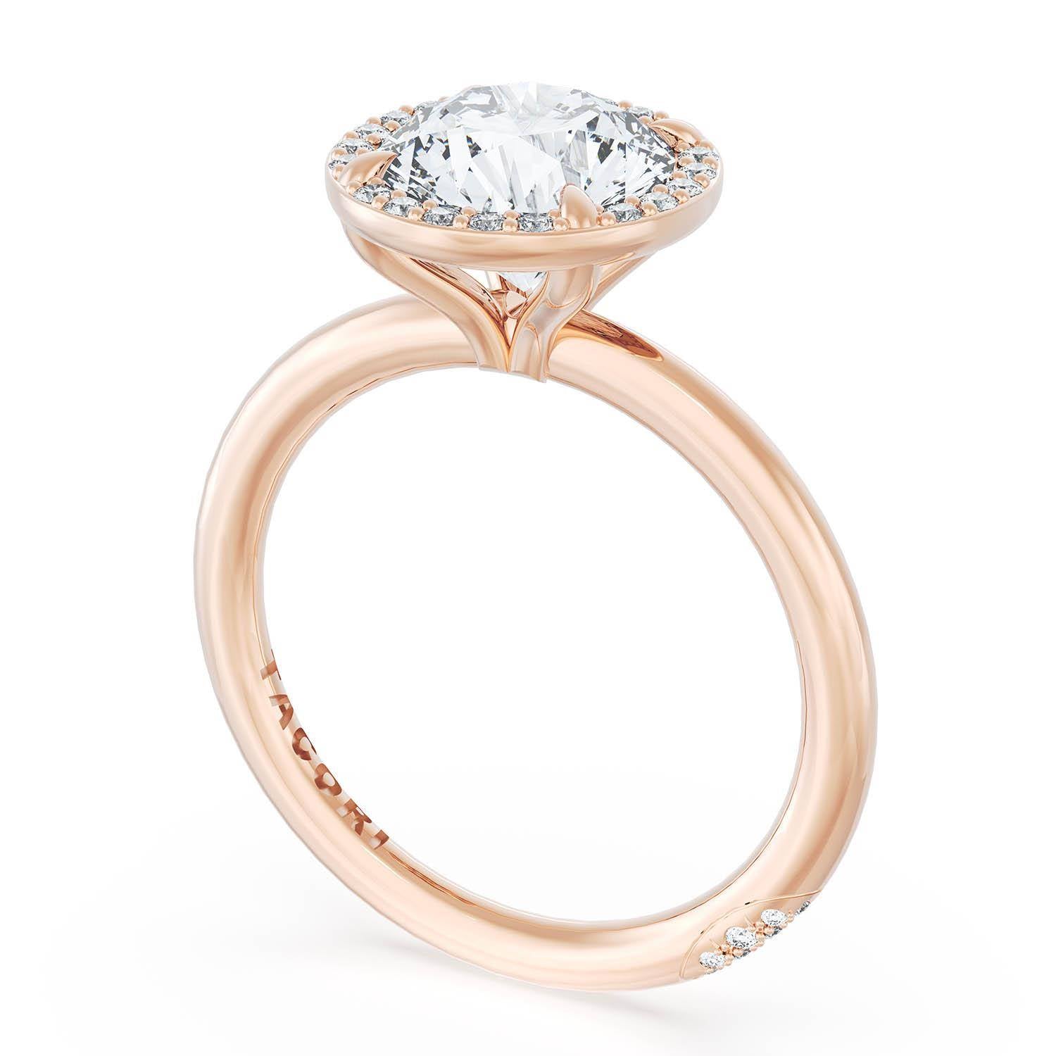 A Round solitaire is elevated by a modern bloom of round brilliant diamonds, and set into a high-polish 18kt Rose Gold foundation. TACORI Crescents add hidden detail to the underside of the crown.