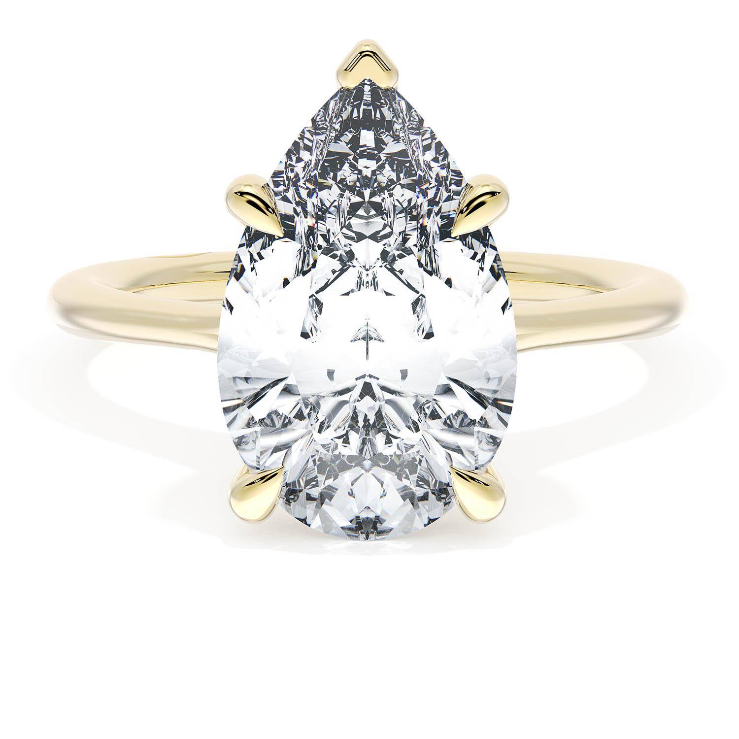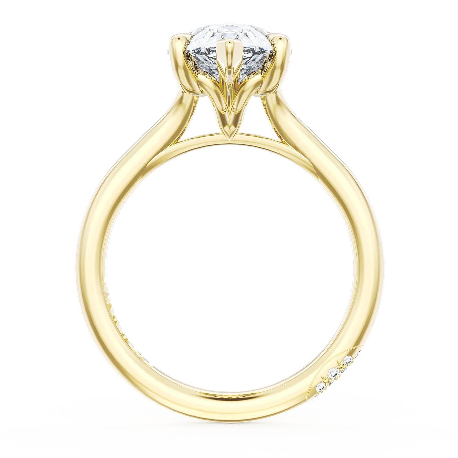 A Pear Solitaire is set into a unique corset-inspired crown on a high-polish 18kt Yellow Gold foundation. A diamond-studded Founder's Crescent marks the resting point.