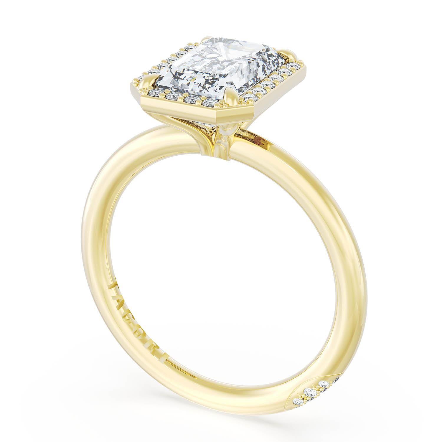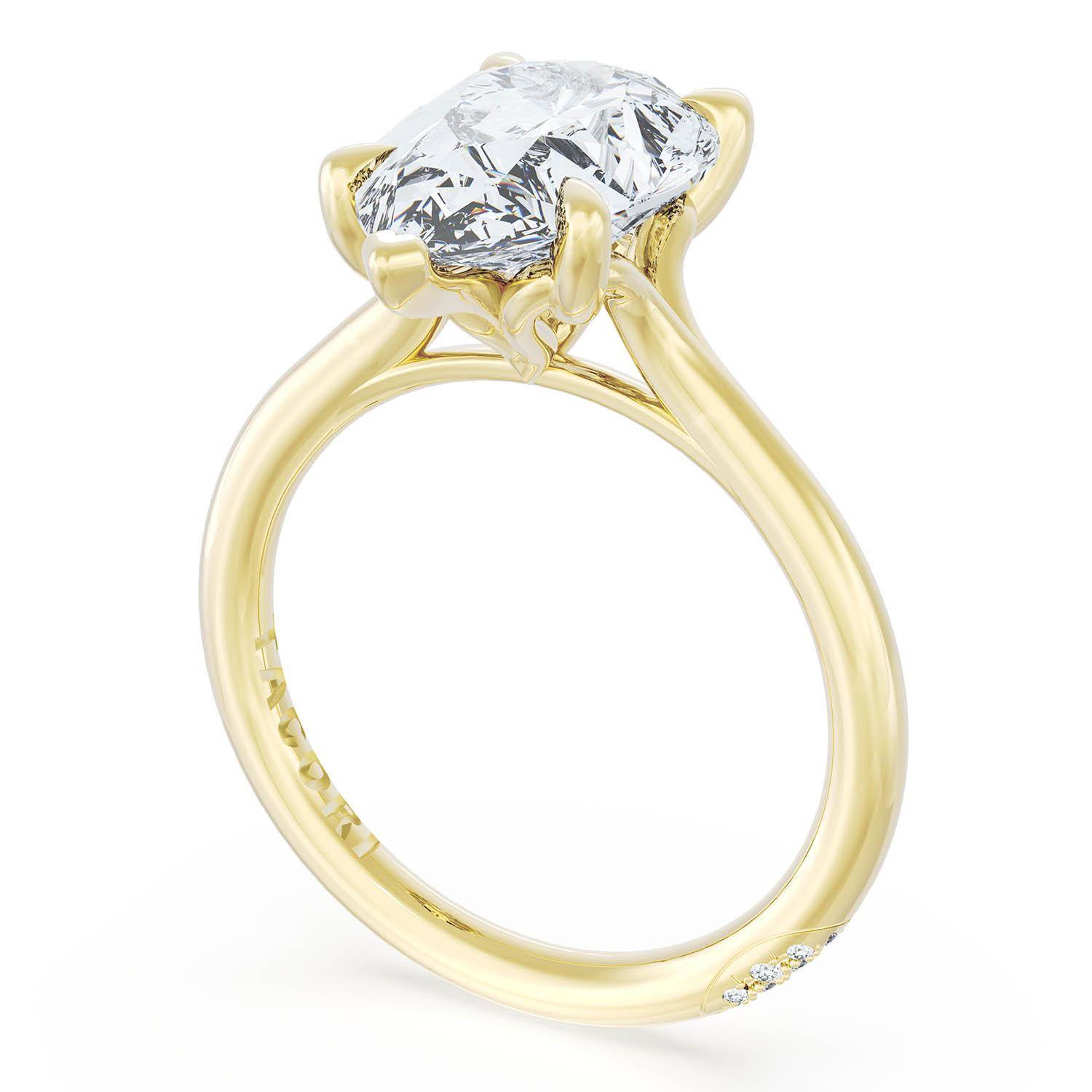 An Emerald solitaire is elevated by a modern bloom of round brilliant diamonds, and set into a high-polish 18kt Yellow Gold foundation. TACORI Crescents add hidden detail to the underside of the crown.
