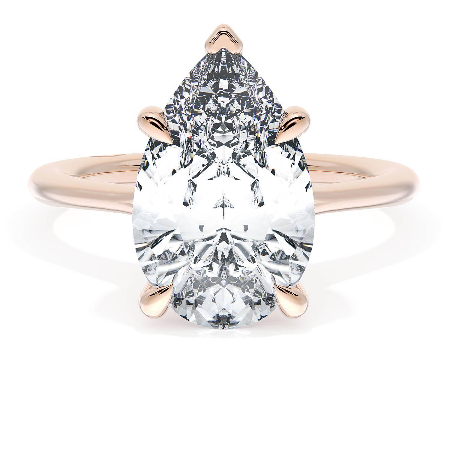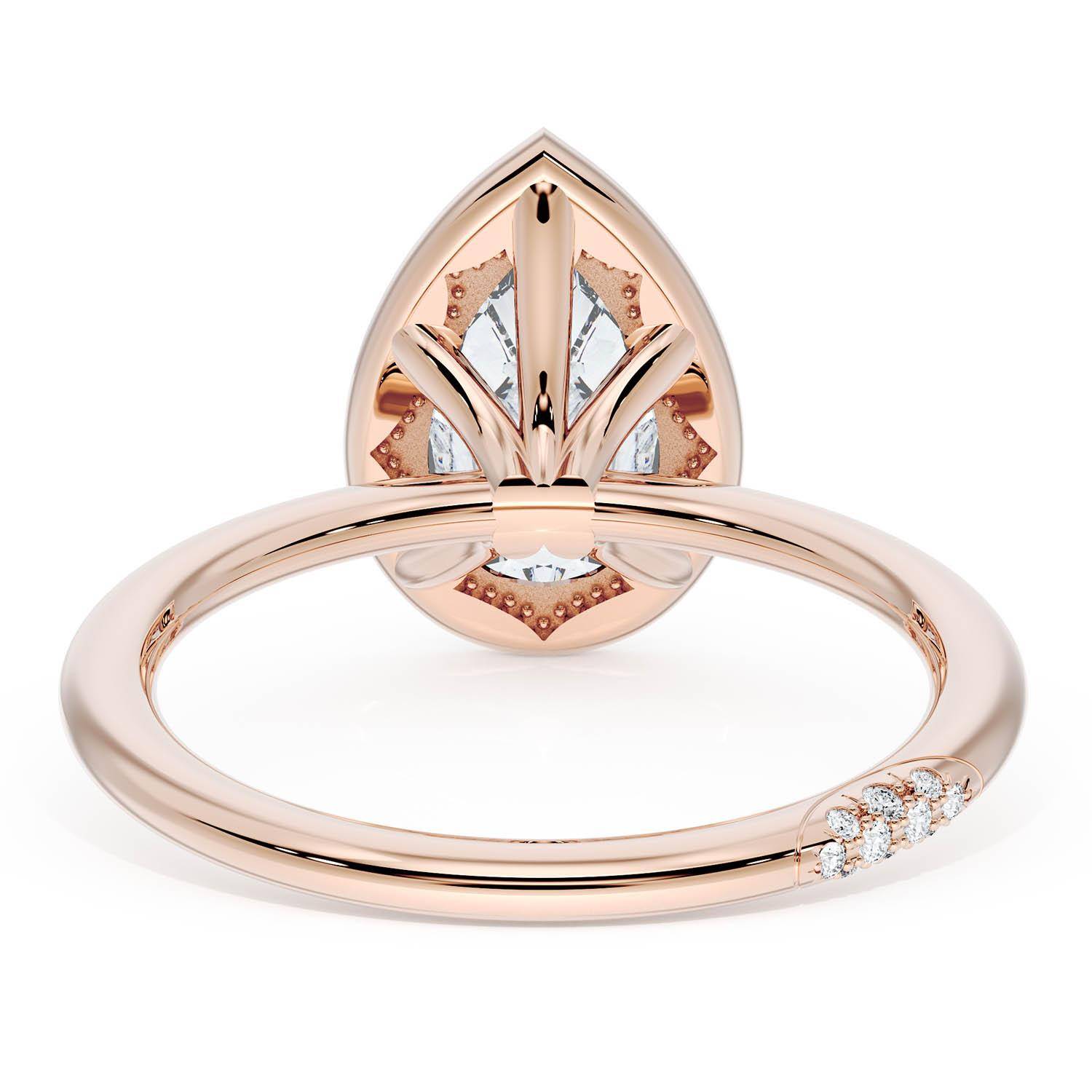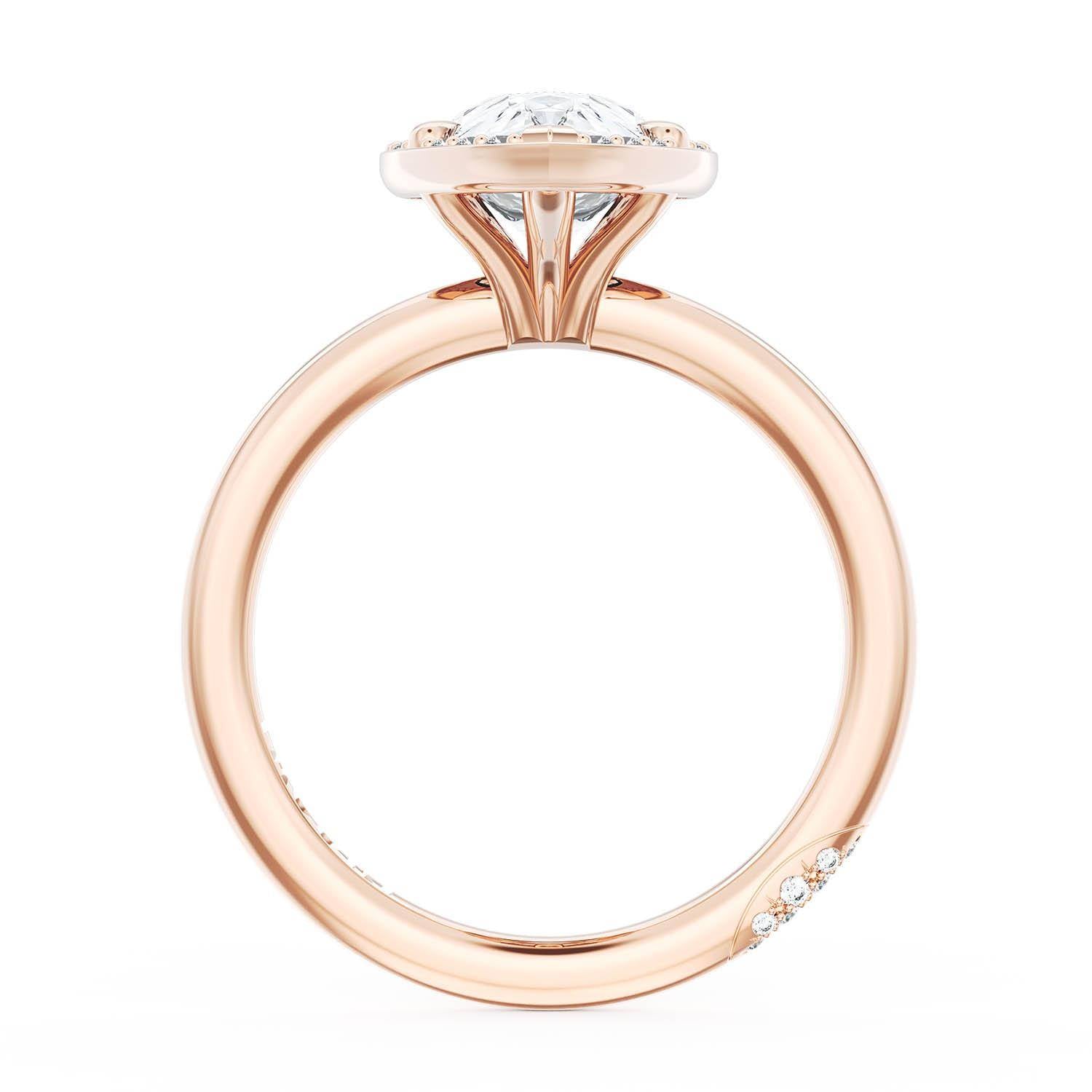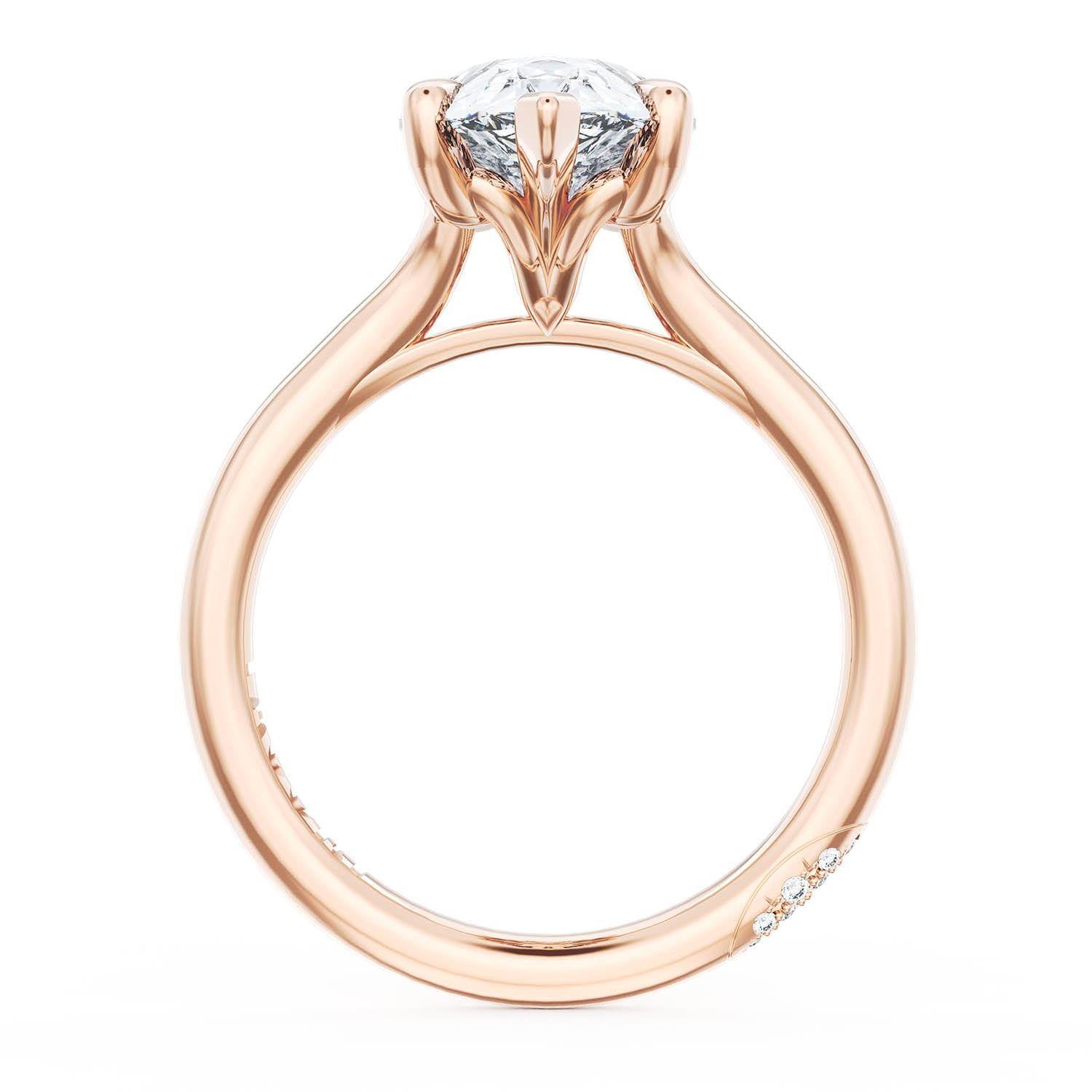 A Pear Solitaire is set into a unique corset-inspired crown on a high-polish 18kt Rose Gold foundation. A diamond-studded Founder's Crescent marks the resting point.
