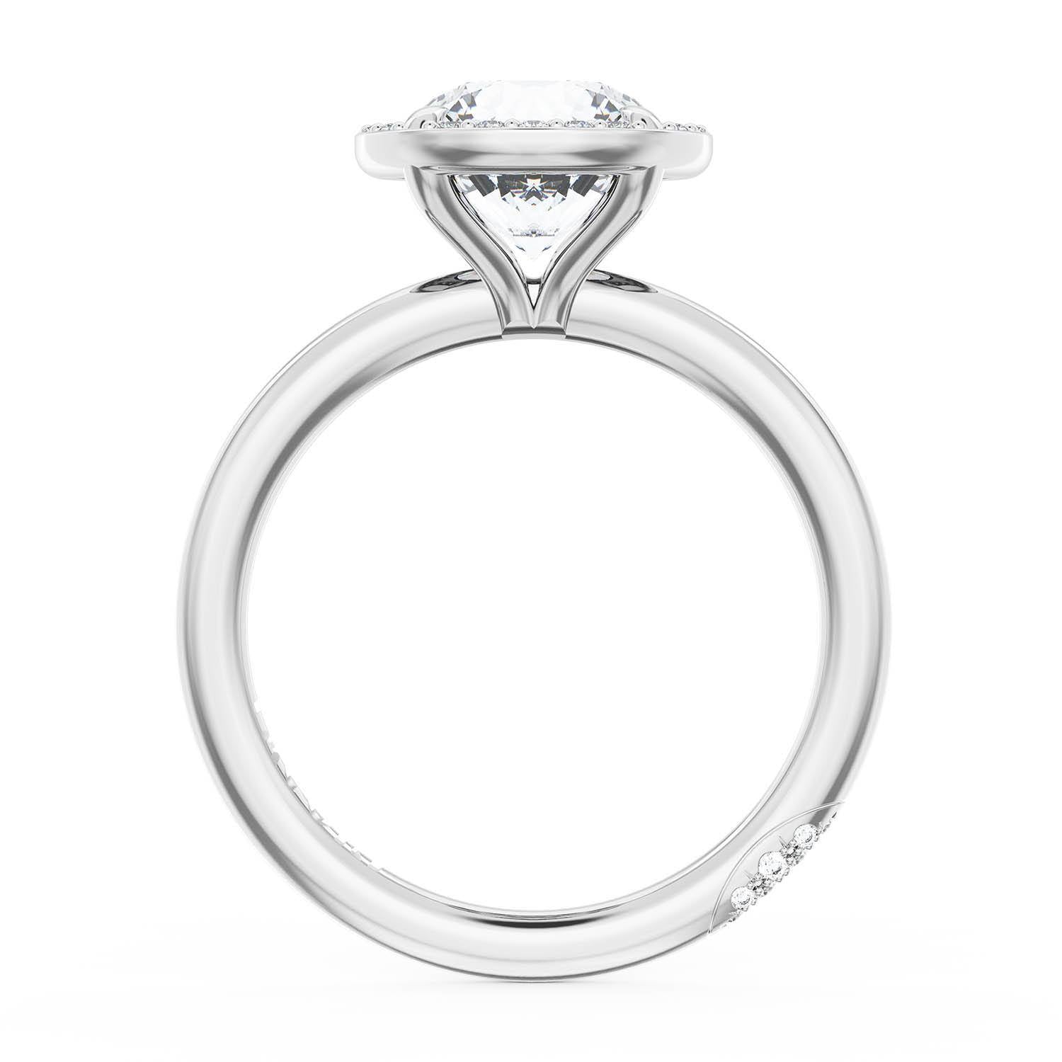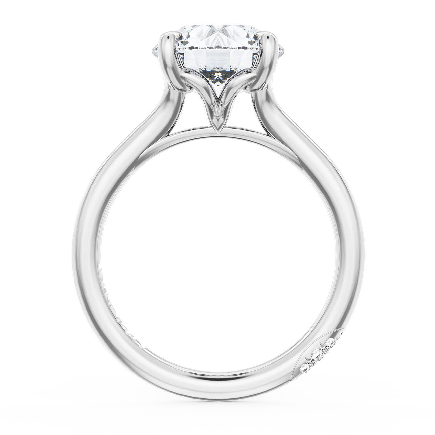 A Round Solitaire is set into a unique corset-inspired crown on a high-polish 18kt White Gold foundation. A diamond-studded Founder's Crescent marks the resting point.