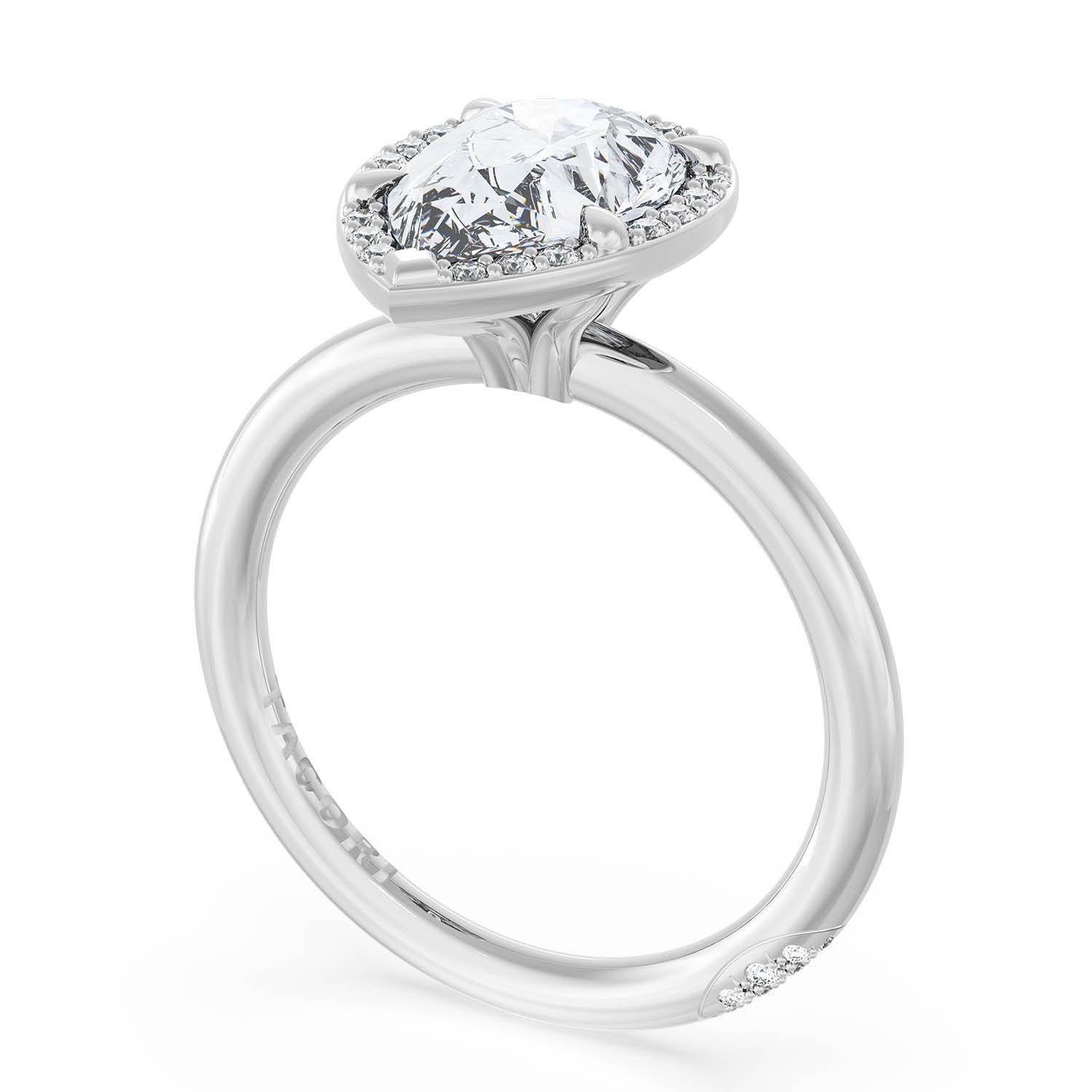 A Pear solitaire is elevated by a modern bloom of round brilliant diamonds, and set into a high-polish 18kt White Gold foundation. TACORI Crescents add hidden detail to the underside of the crown.