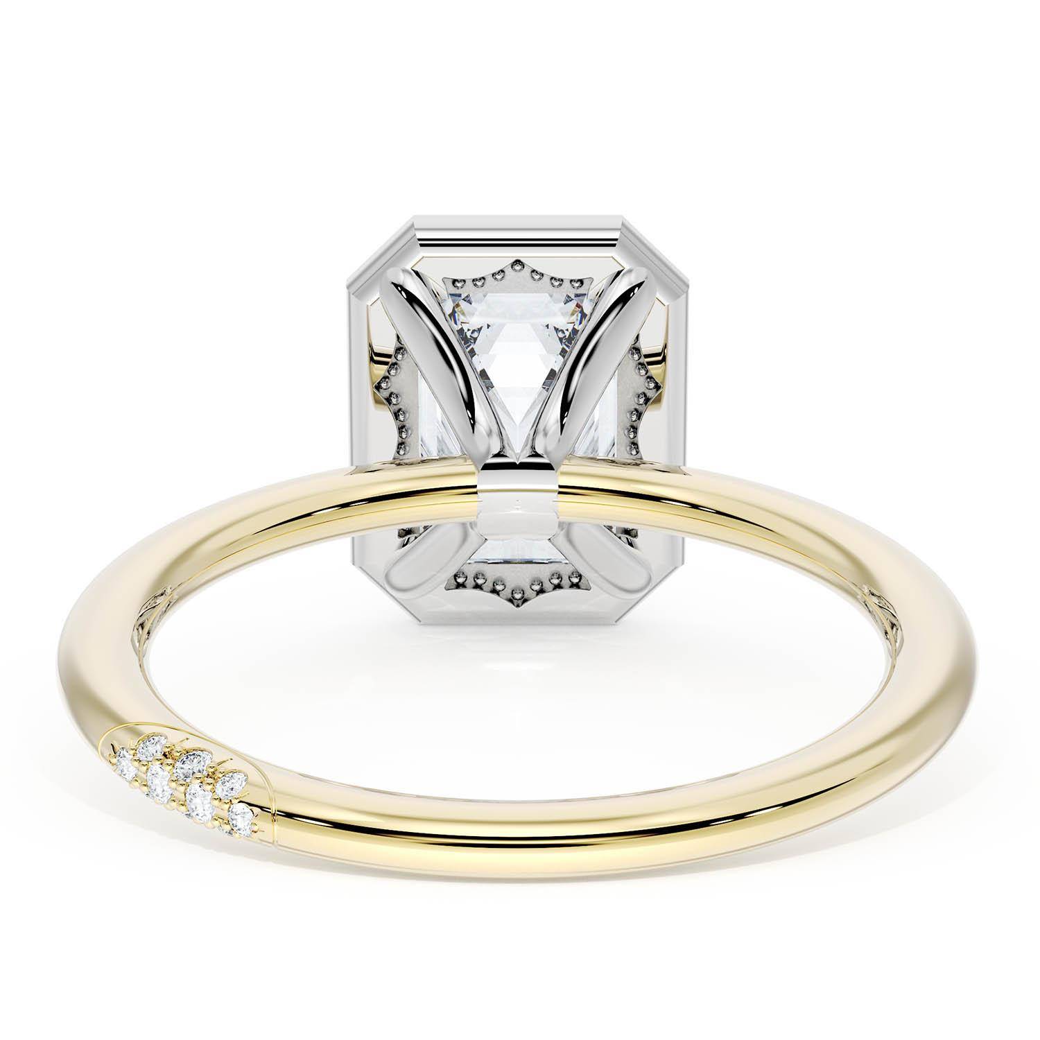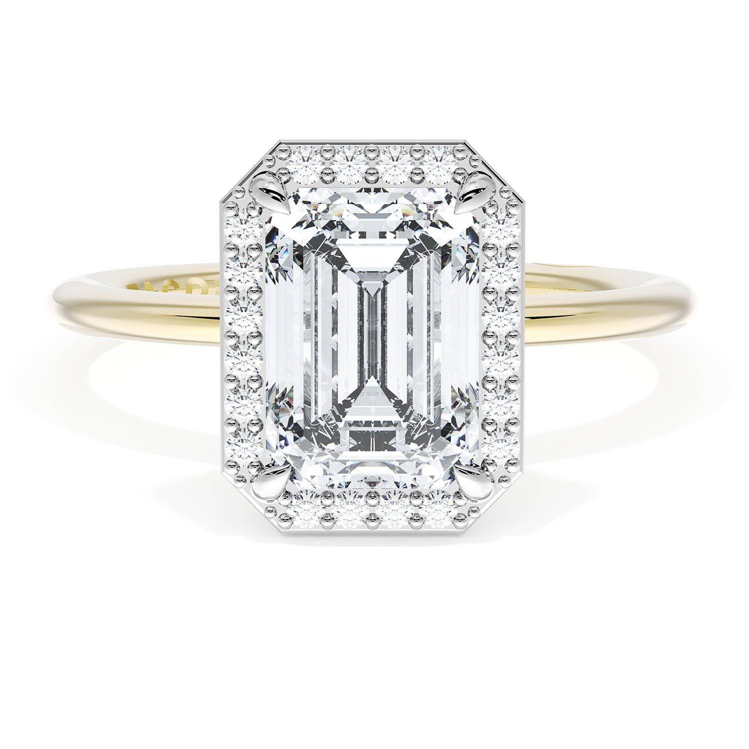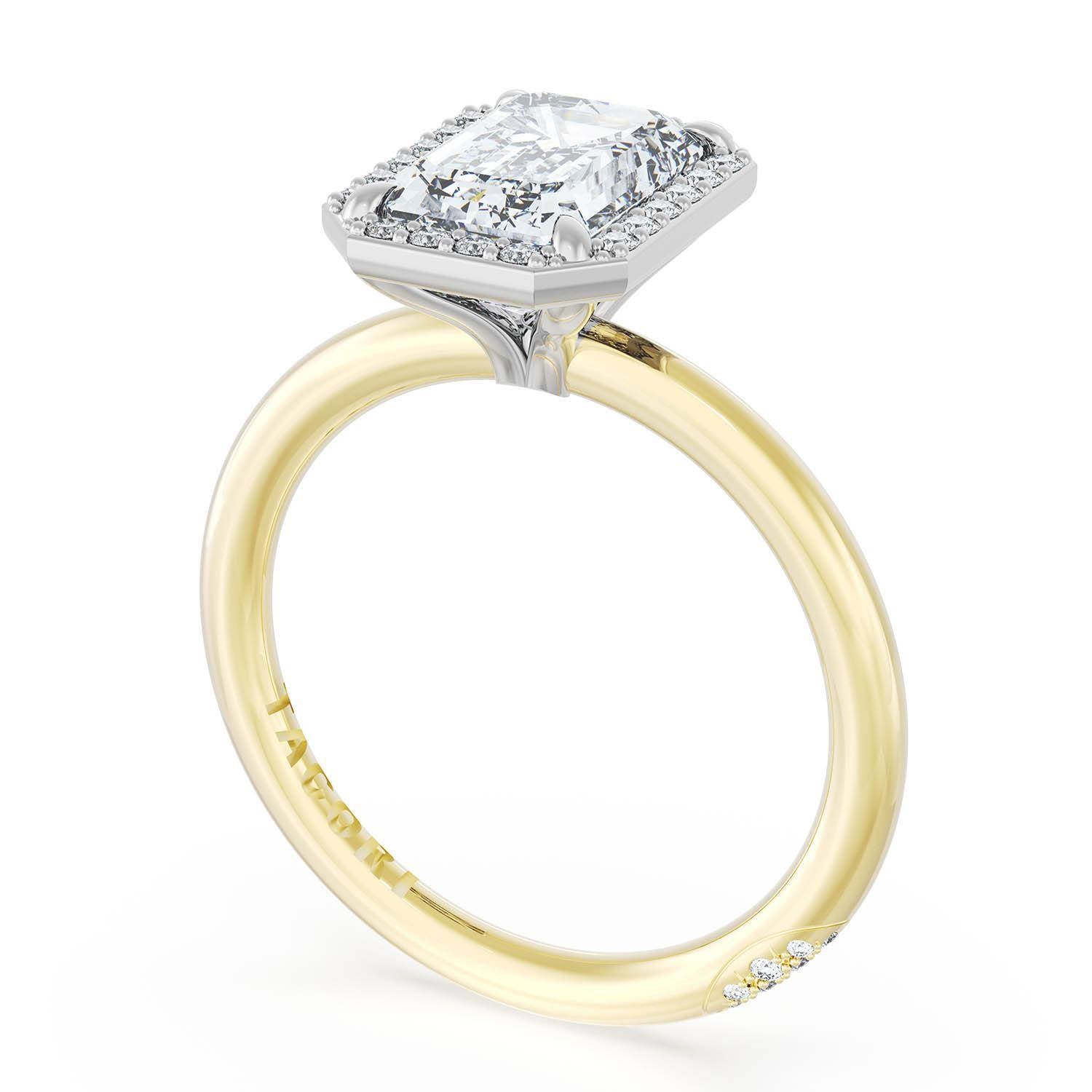 An Emerald solitaire is elevated by a modern bloom of round brilliant diamonds, and set into a two-tone foundation of 18kt Yellow Gold and Platinum foundation. TACORI Crescents add hidden detail to the underside of the crown.