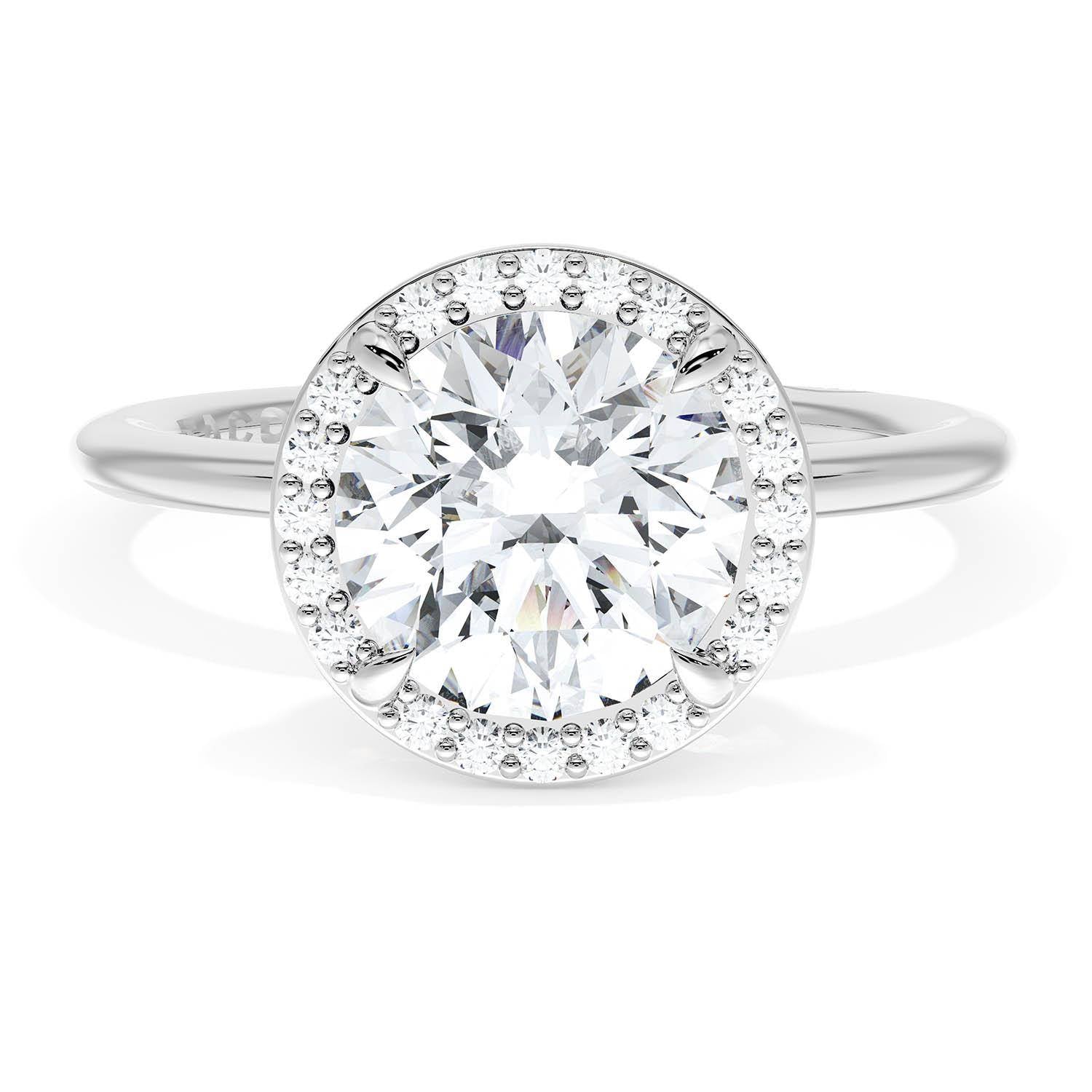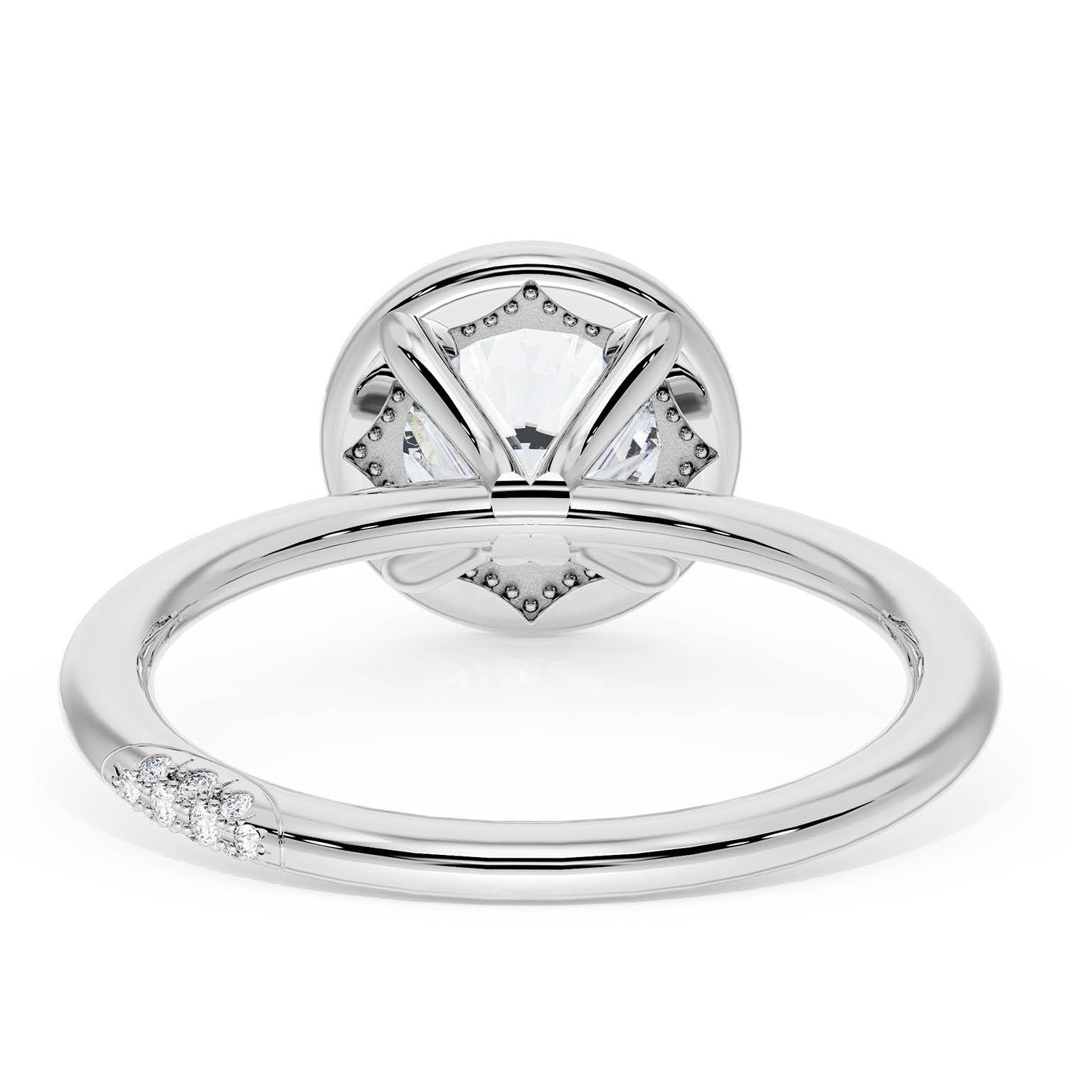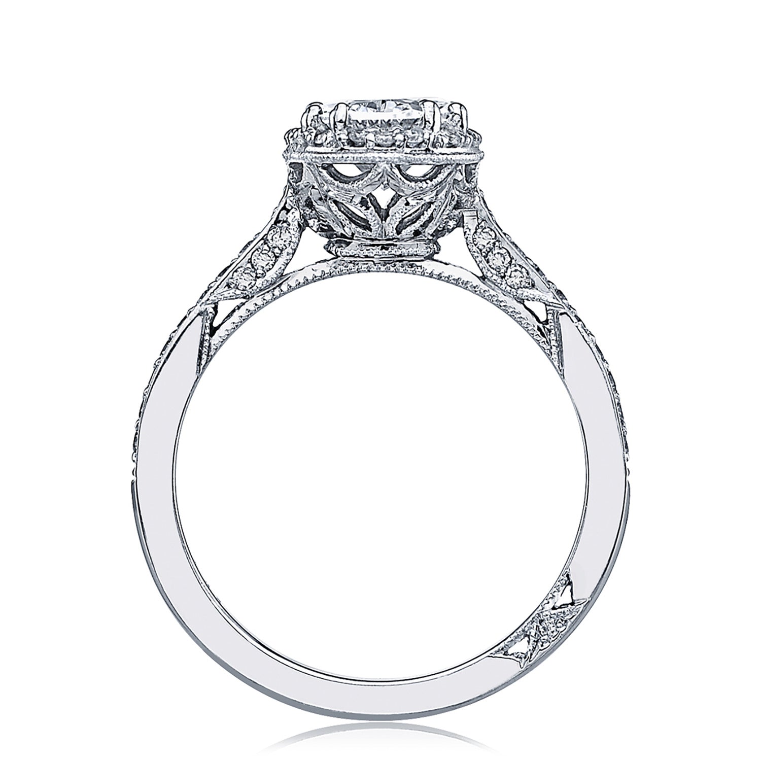 A Round solitaire is elevated by a modern bloom of round brilliant diamonds, and set into a high-polish 18kt White Gold foundation. TACORI Crescents add hidden detail to the underside of the crown.