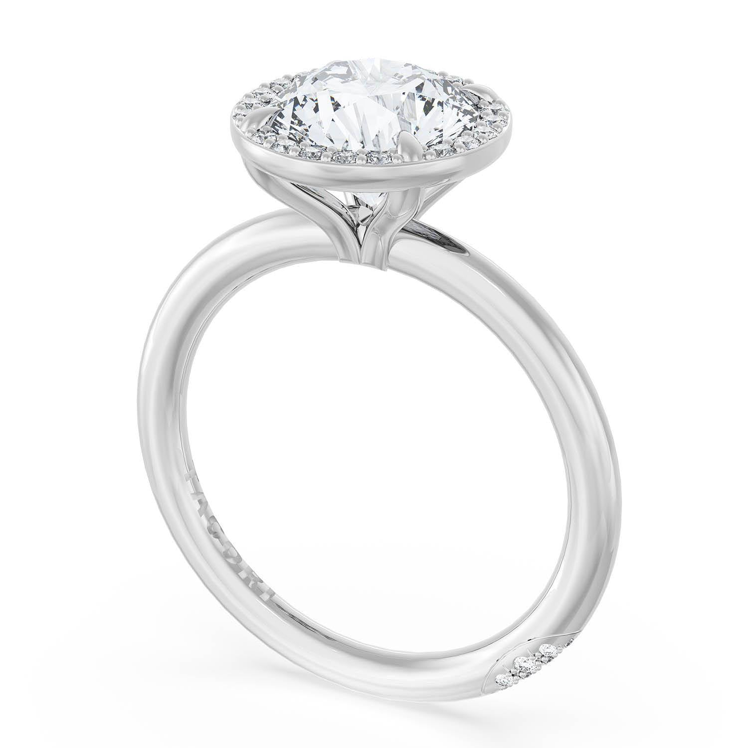 A Round solitaire is elevated by a modern bloom of round brilliant diamonds, and set into a high-polish Platinum foundation. TACORI Crescents add hidden detail to the underside of the crown.