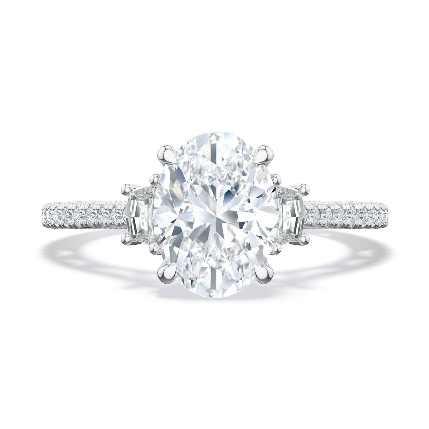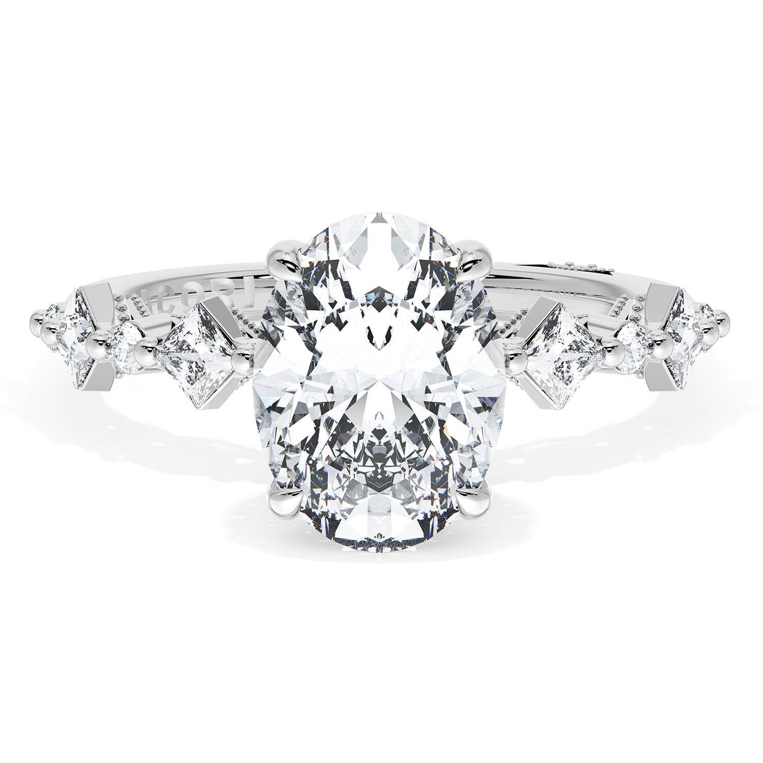 An Oval Solitaire is set into a Platinum foundation. Alternating carré and round brilliant diamonds trace up the ceiling and hand-hewn beading adds texture to the silhouette.