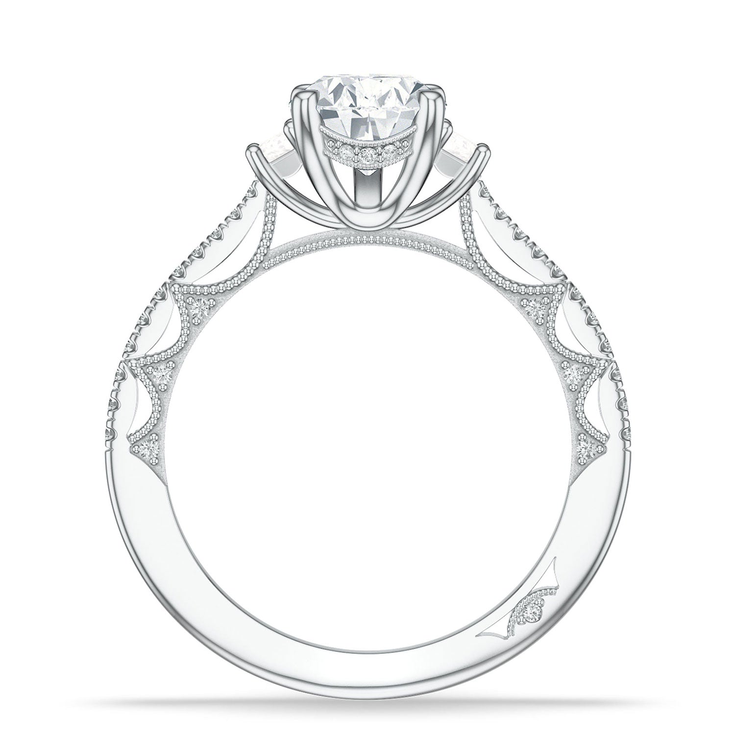 Milgrain-edged Crescents create radiant windows of light, while round-brilliant diamonds at each Crescent junction are hand-set with triple beading. A pave ceiling leads towards the three-stone crown with a hidden bloom.