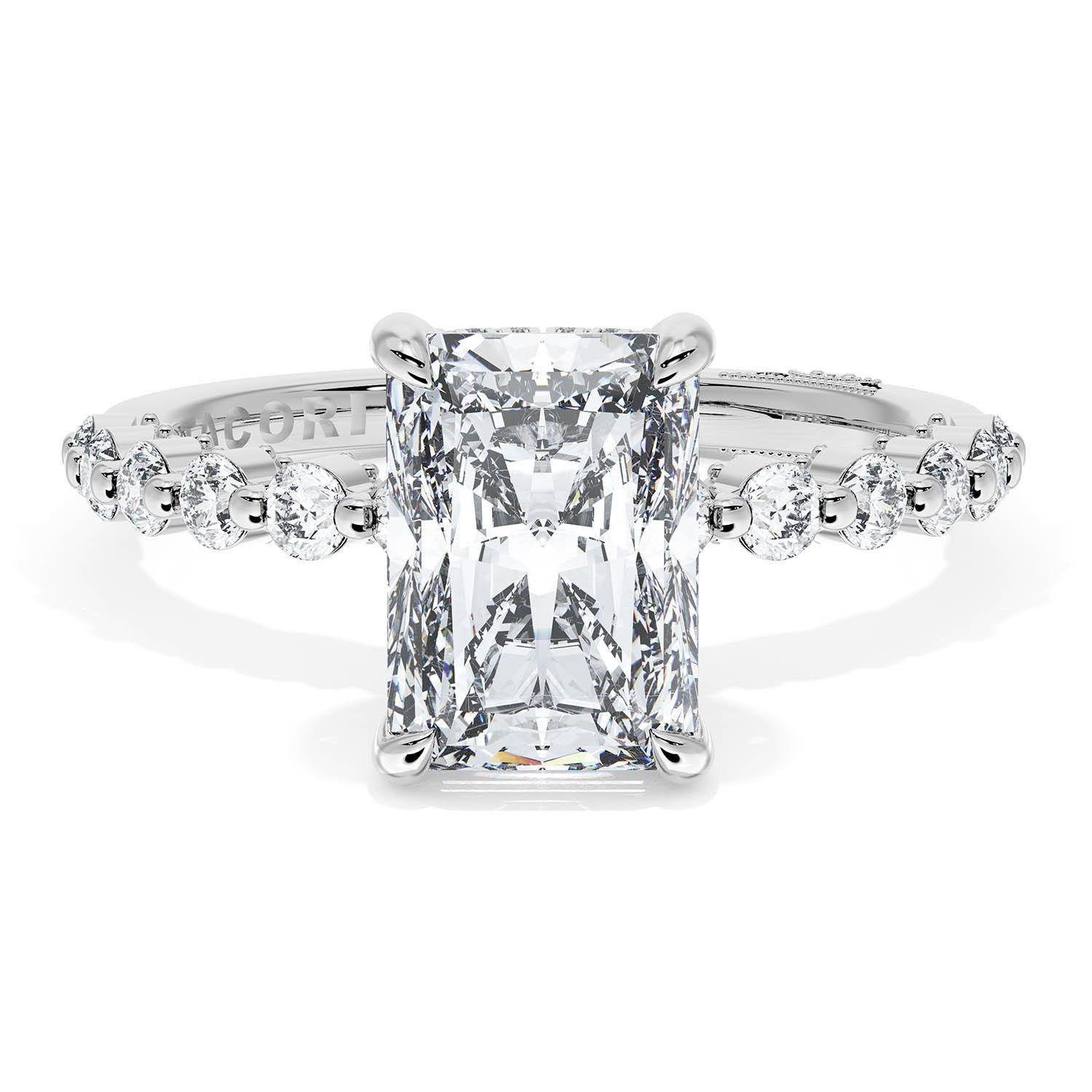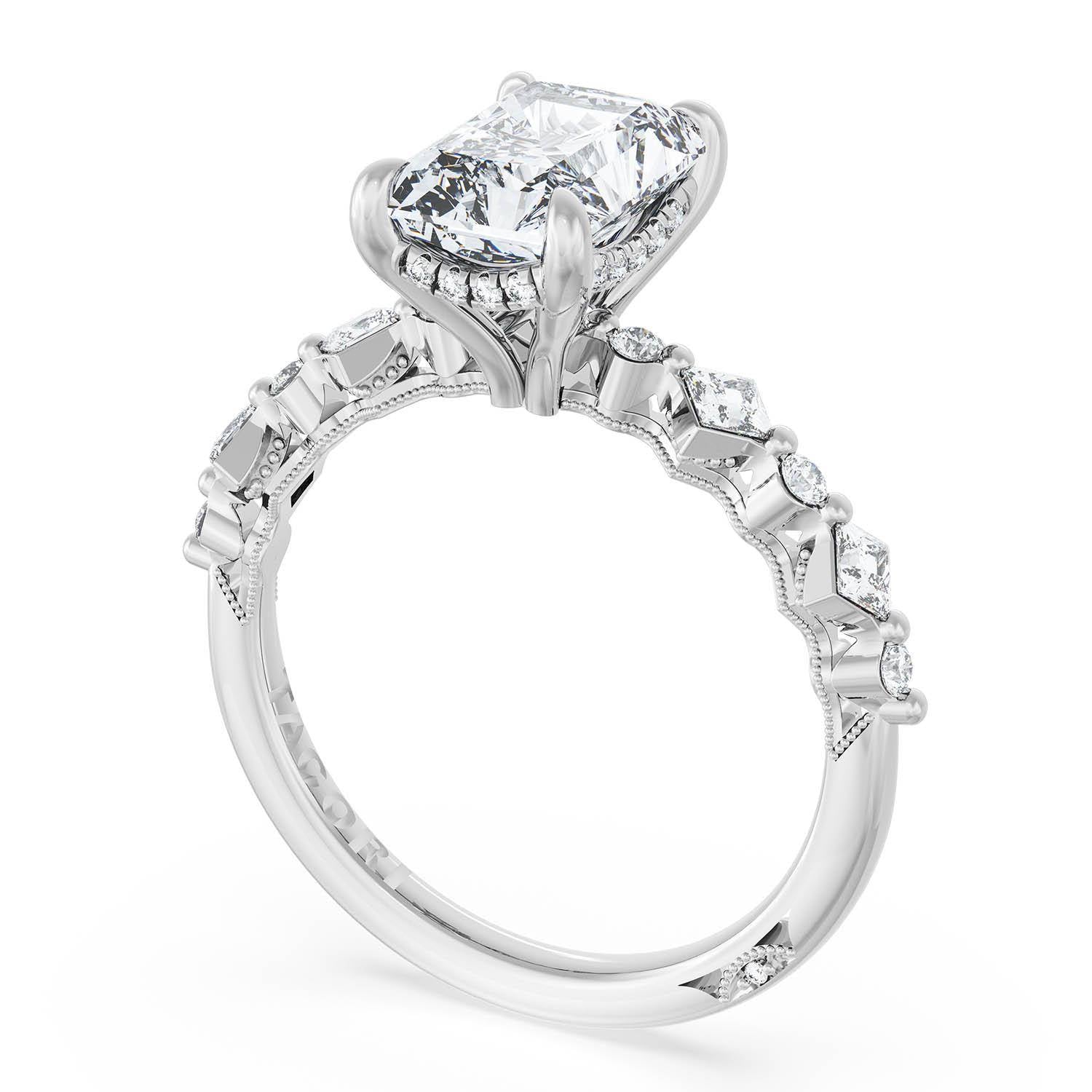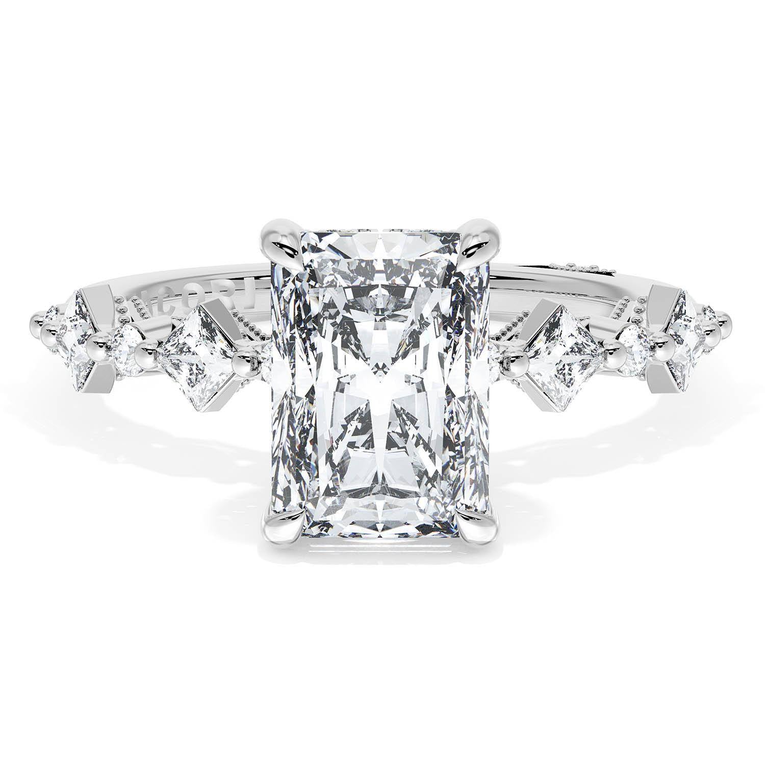 A Radiant Solitaire is set into a Platinum foundation. Alternating carré and round brilliant diamonds trace up the ceiling and hand-hewn beading adds texture to the silhouette.