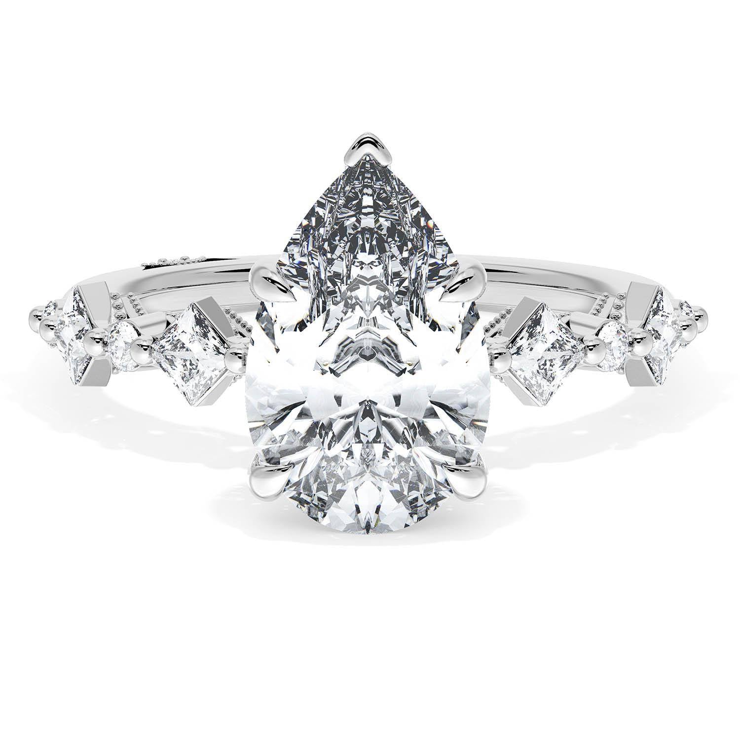 A Pear Solitaire is set into an 18kt White Gold foundation. Alternating carré and round brilliant diamonds trace up the ceiling and hand-hewn beading adds texture to the silhouette.
