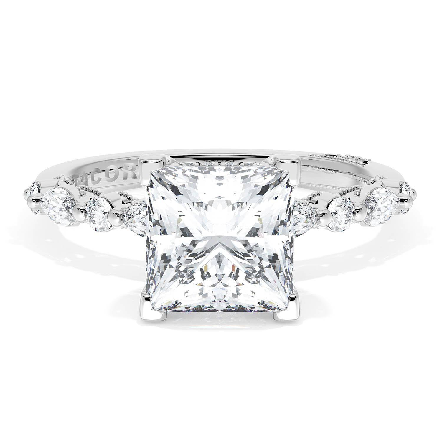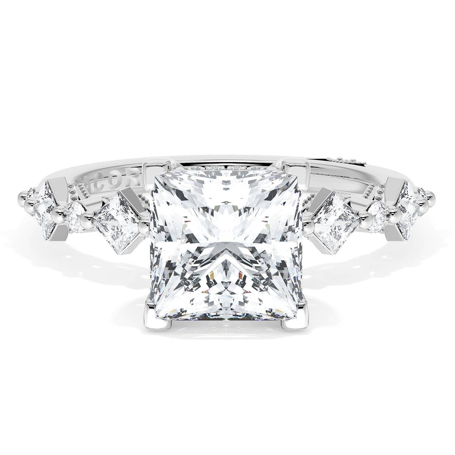 A Princess Solitaire is set into a Platinum foundation. Alternating carré and round brilliant diamonds trace up the ceiling and hand-hewn beading adds texture to the silhouette.