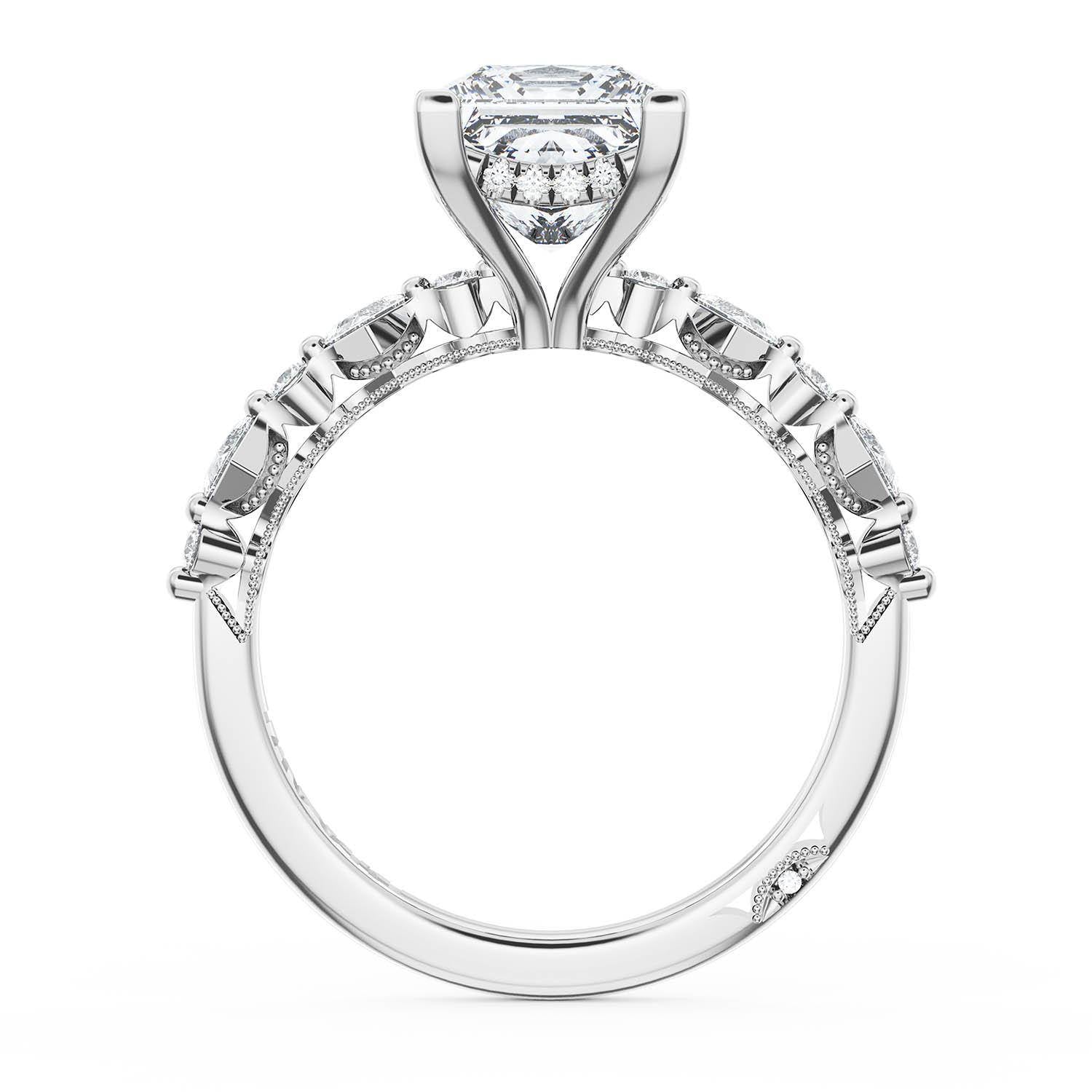 A Radiant Solitaire is set into an 18kt White Gold foundation. Alternating carré and round brilliant diamonds trace up the ceiling and hand-hewn beading adds texture to the silhouette.