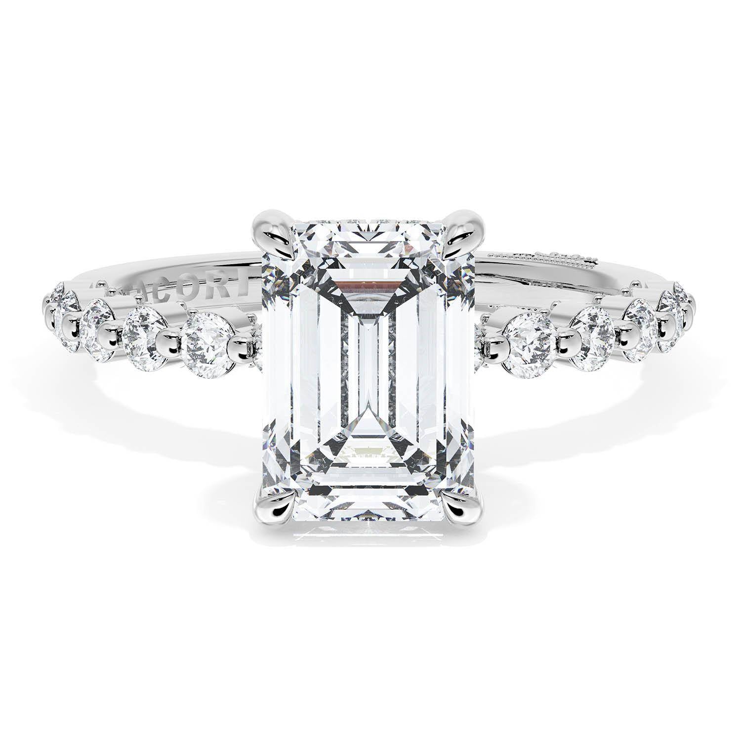 An Emerald Solitaire is set into an 18kt White Gold foundation. Masterfully set round brilliant diamonds trace up the ceiling and hand-hewn beading adds texture to the silhouette.