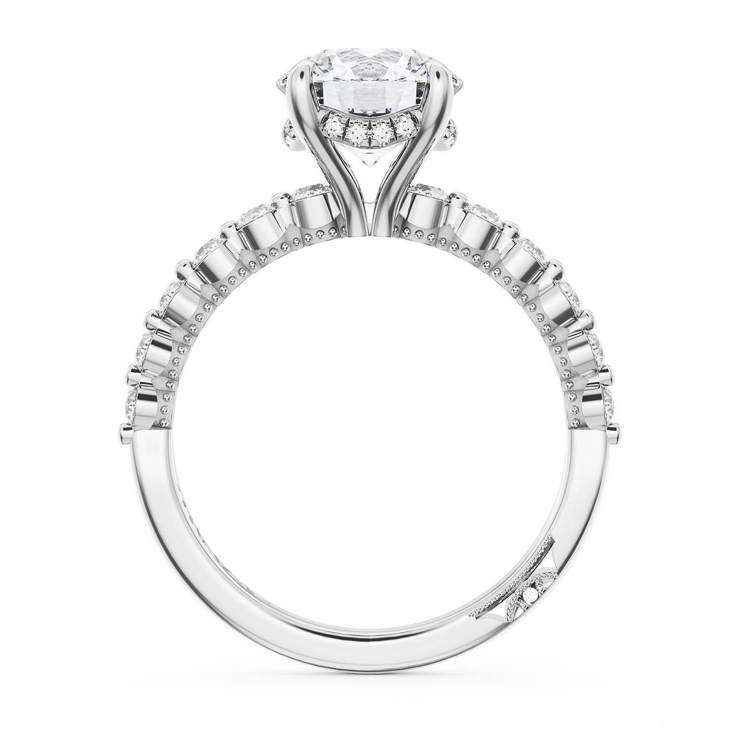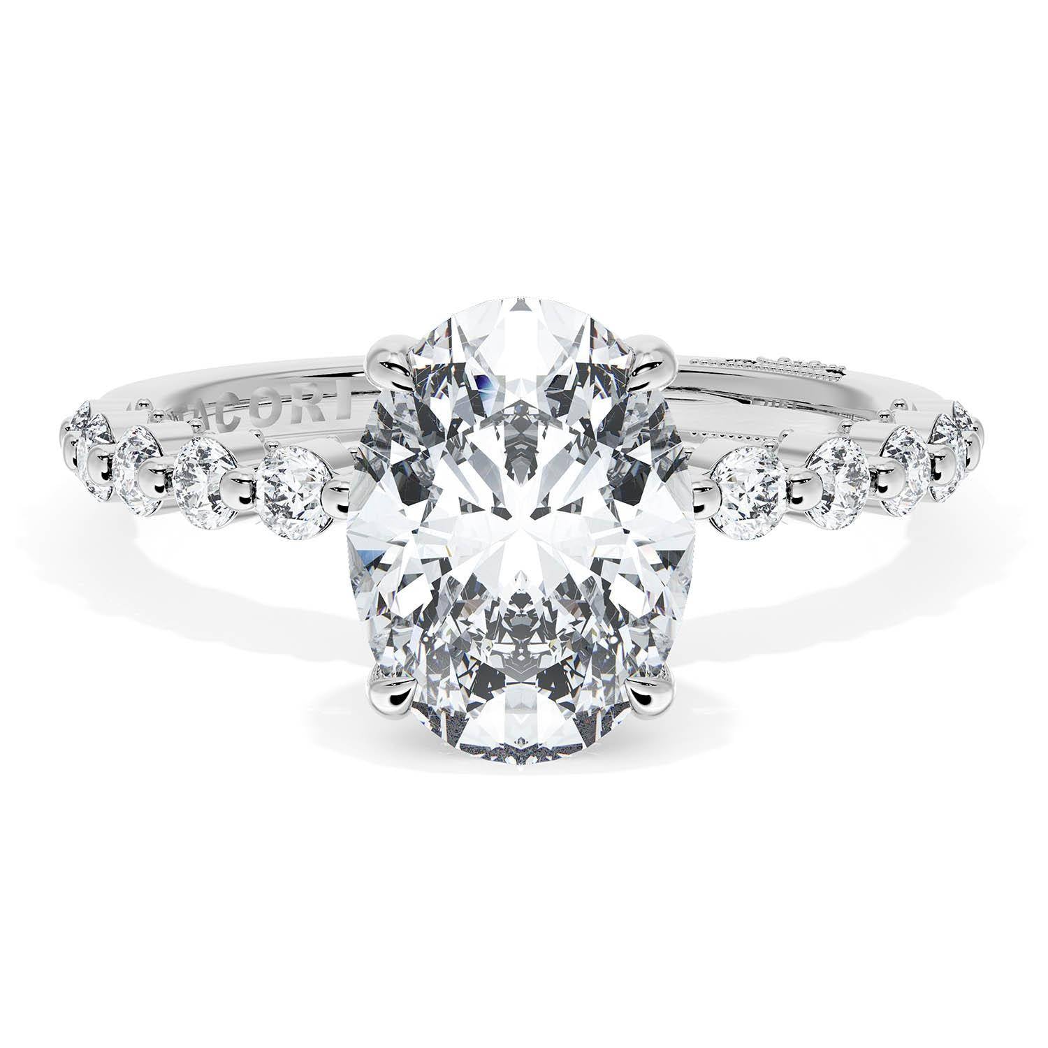 An Oval Solitaire is set into an 18kt White Gold foundation. Masterfully set round brilliant diamonds trace up the ceiling and hand-hewn beading adds texture to the silhouette.