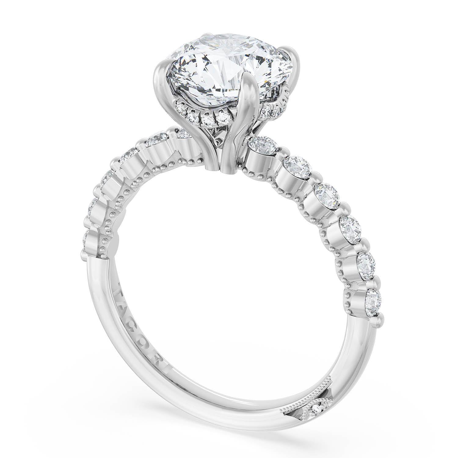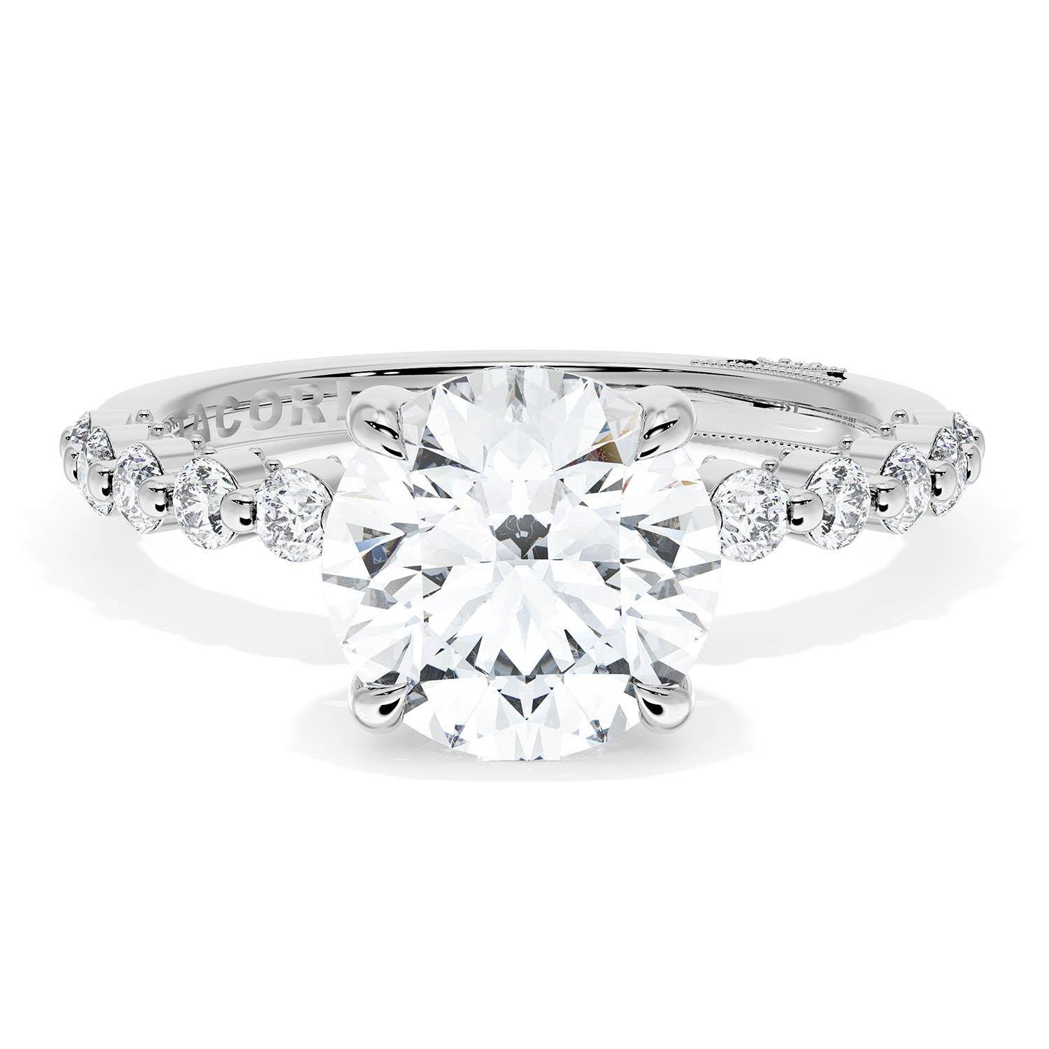 A Round Solitaire is set into an 18kt White Gold foundation. Masterfully set round brilliant diamonds trace up the ceiling and hand-hewn beading adds texture to the silhouette.