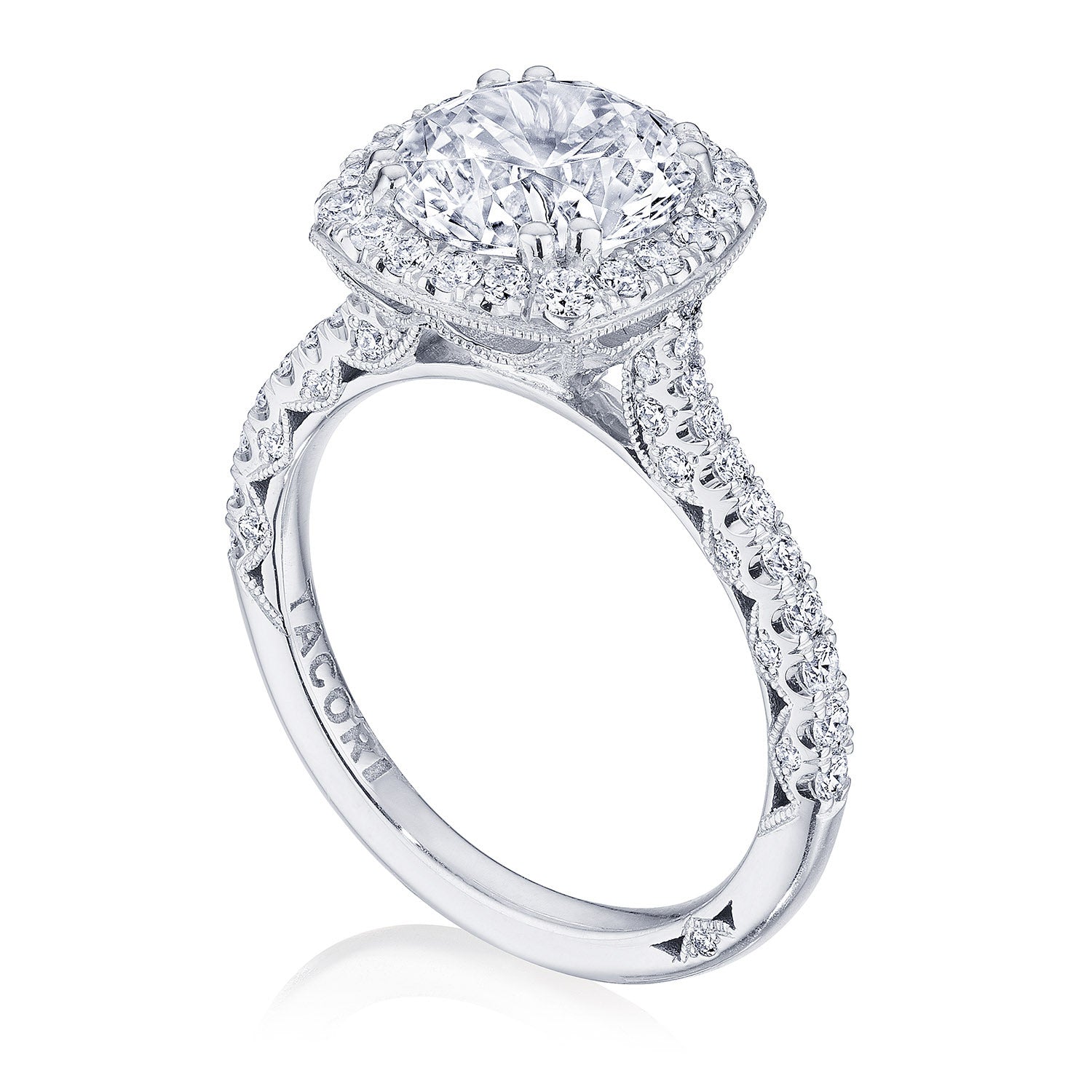 Pave diamonds decorate the ceiling, while a cushion bloom adds dimension to the center stone. The crown is set on a Cathedral foundation, above a band of Petite Crescent with more diamond detailing. A Signature Crescent marks the resting point.