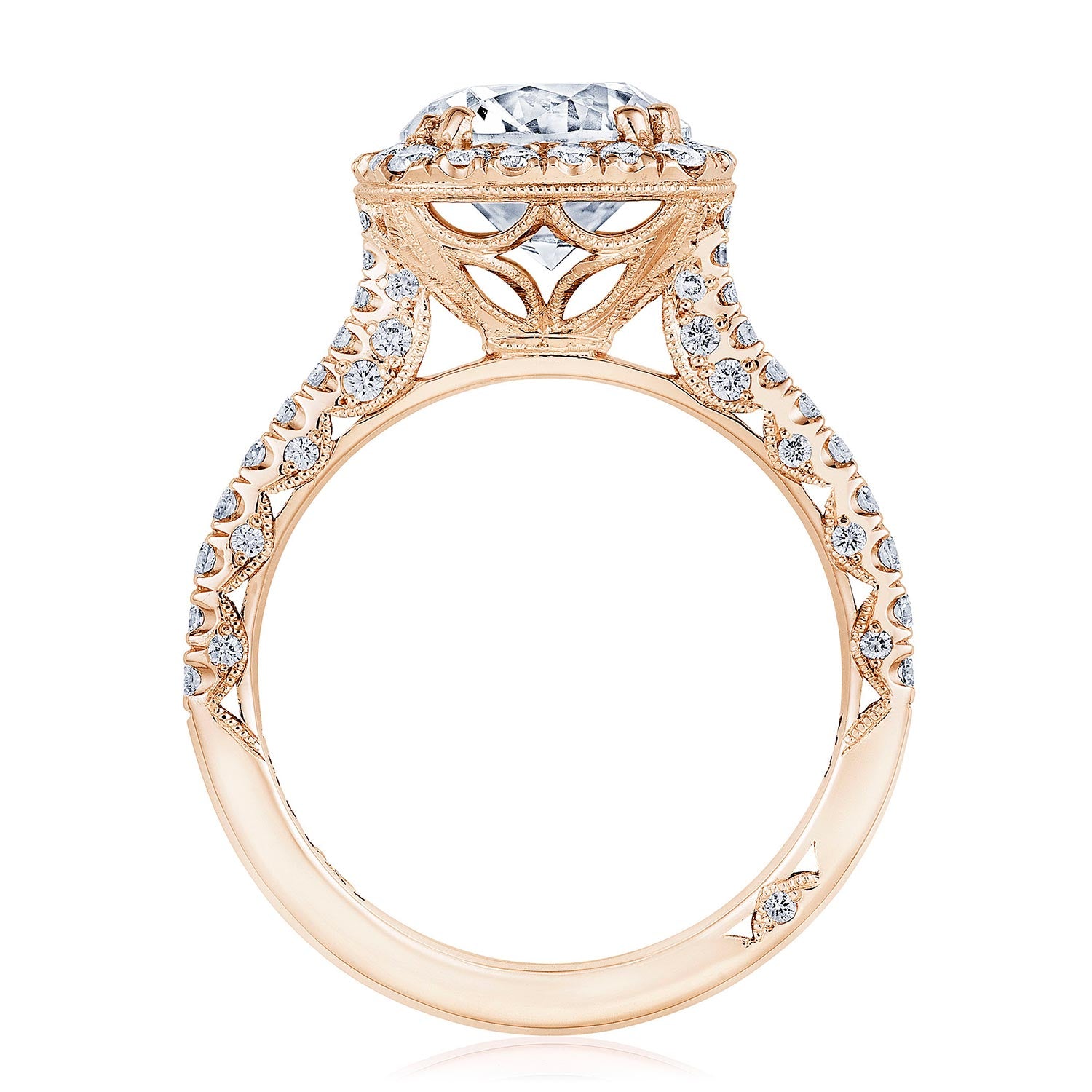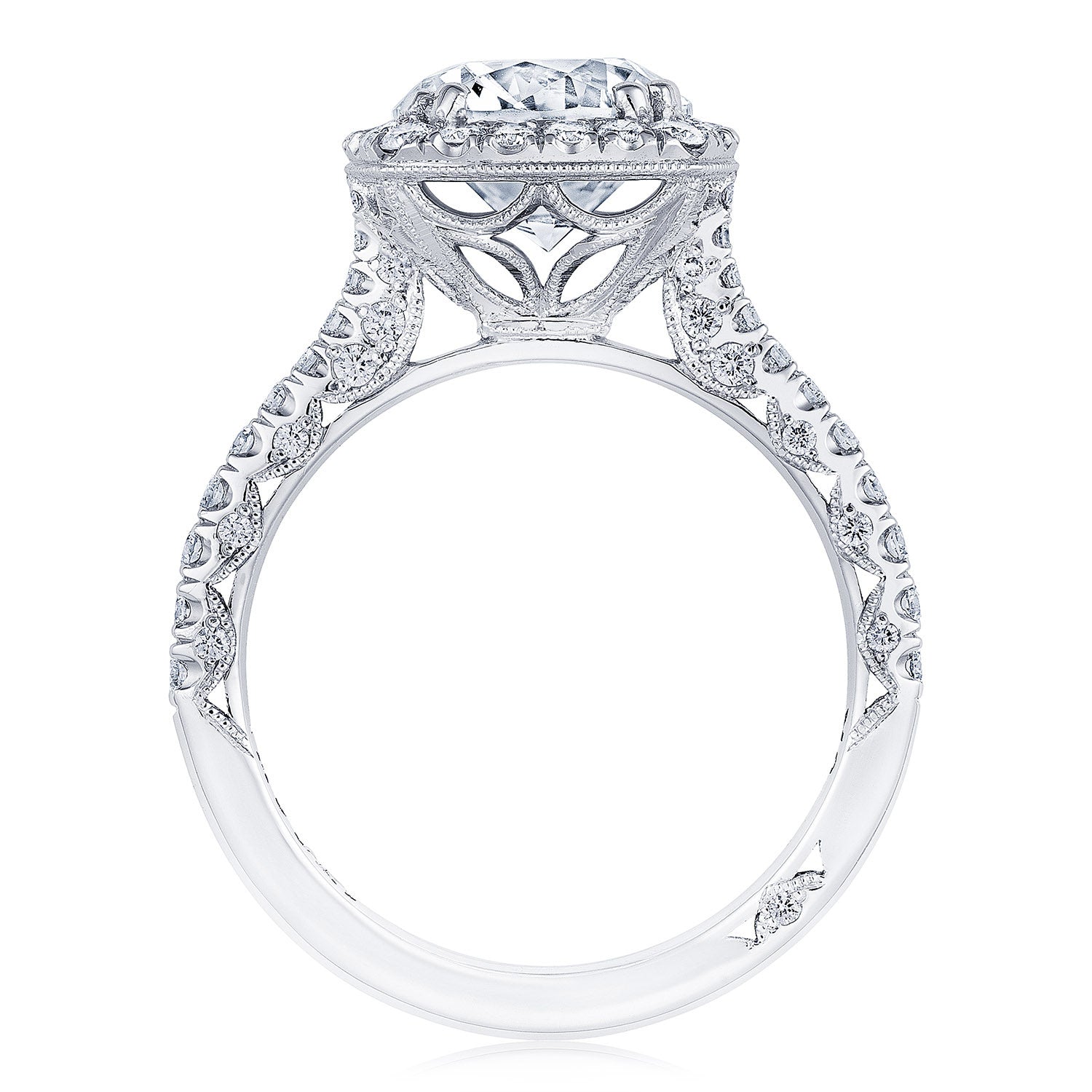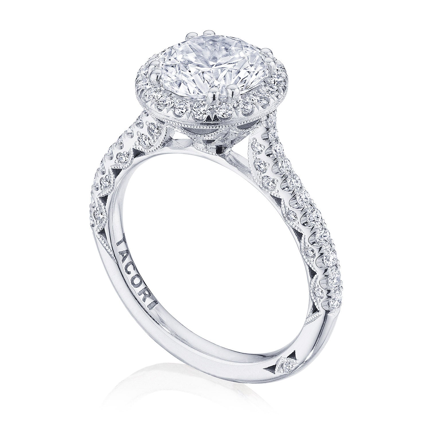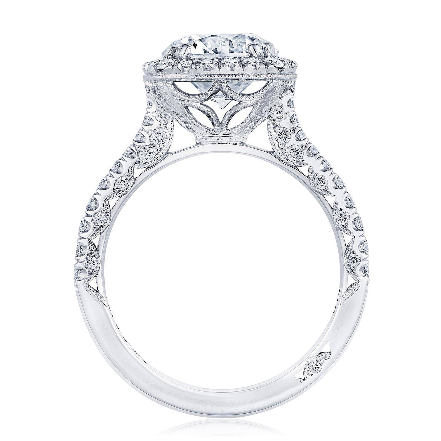 Pave-set diamonds decorate the ceiling, while a round bloom adds dimension to the center stone. The crown floats on a Classic 360 foundation above a band of Petite Crescent with more diamond details. A Signature Crescent marks the resting point.