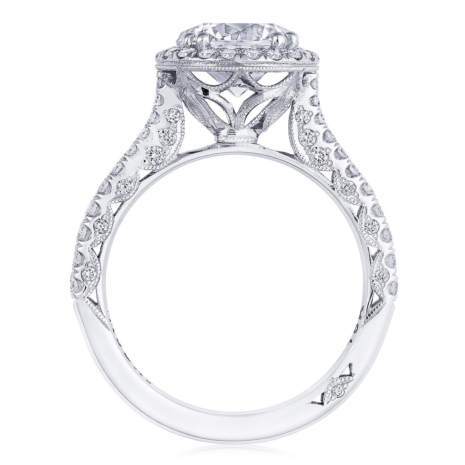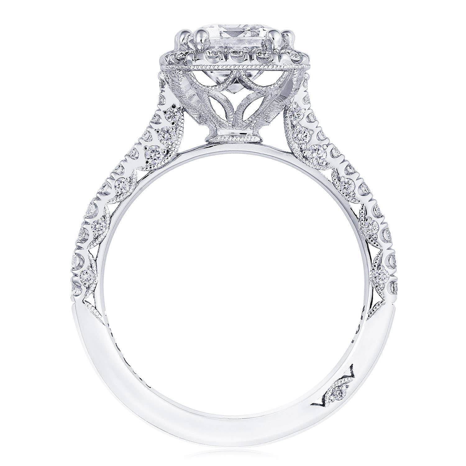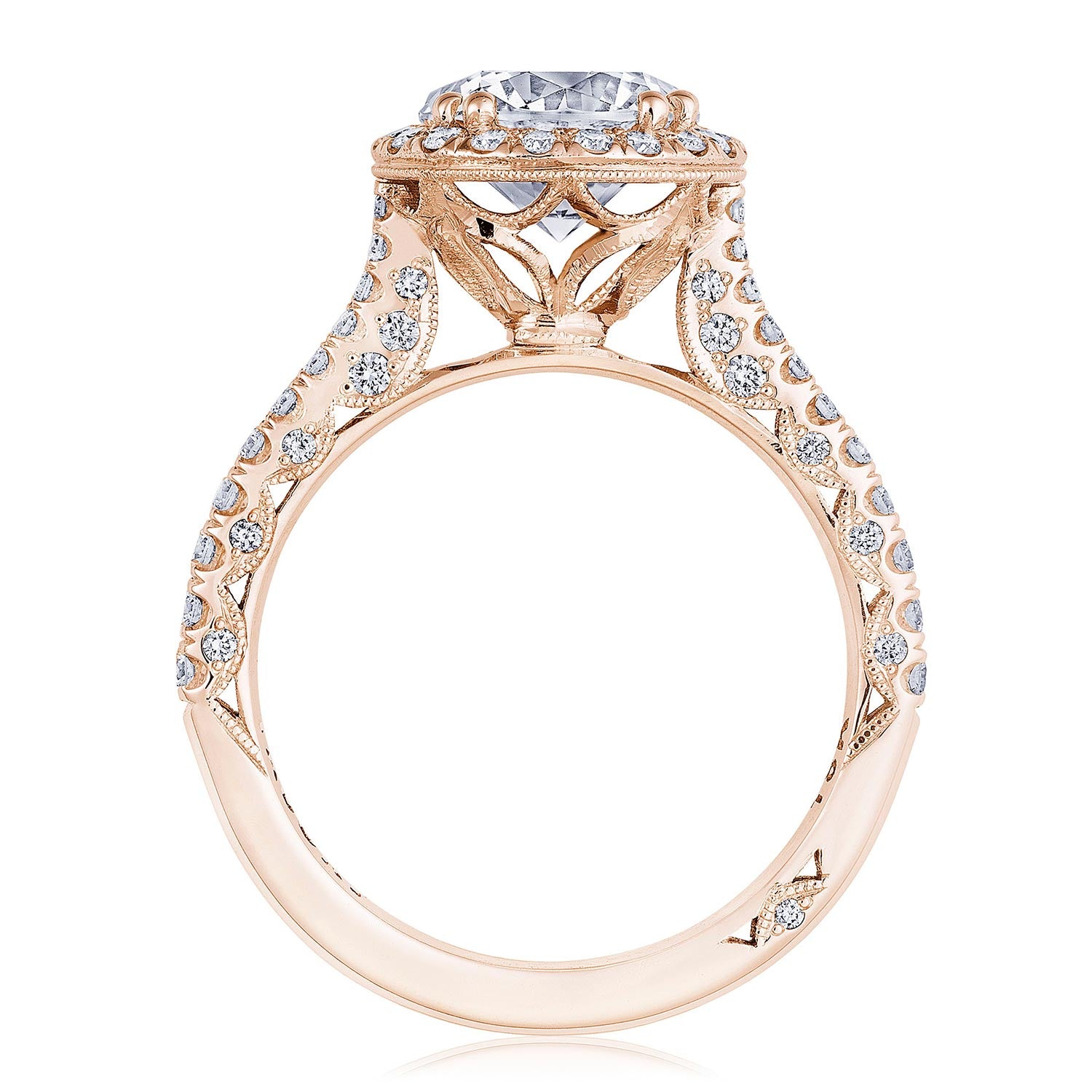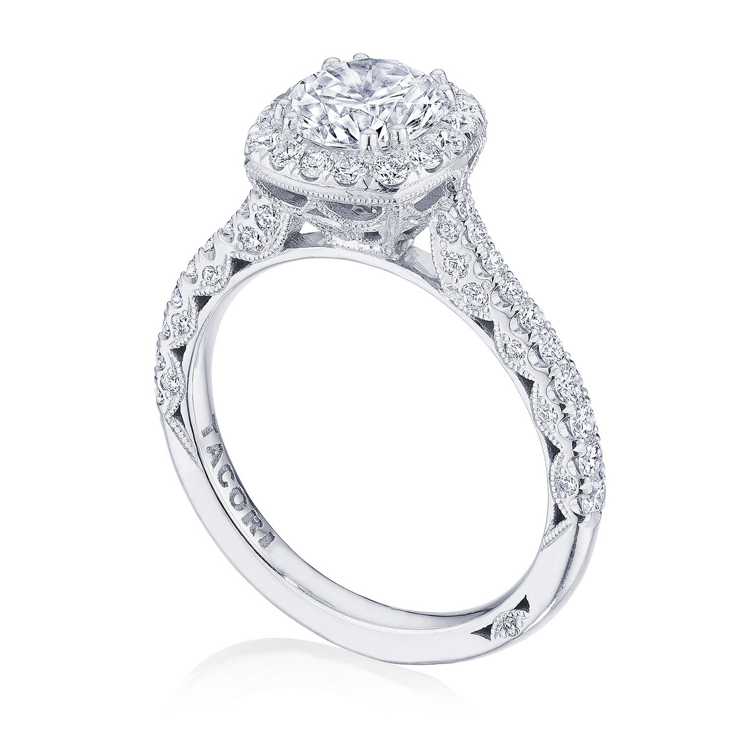 Pave-set diamonds decorate the ceiling, while a round bloom adds dimension to the center stone. The crown floats on a Classic 360 foundation above a band of Petite Crescent with more diamond details. A Signature Crescent marks the resting point.