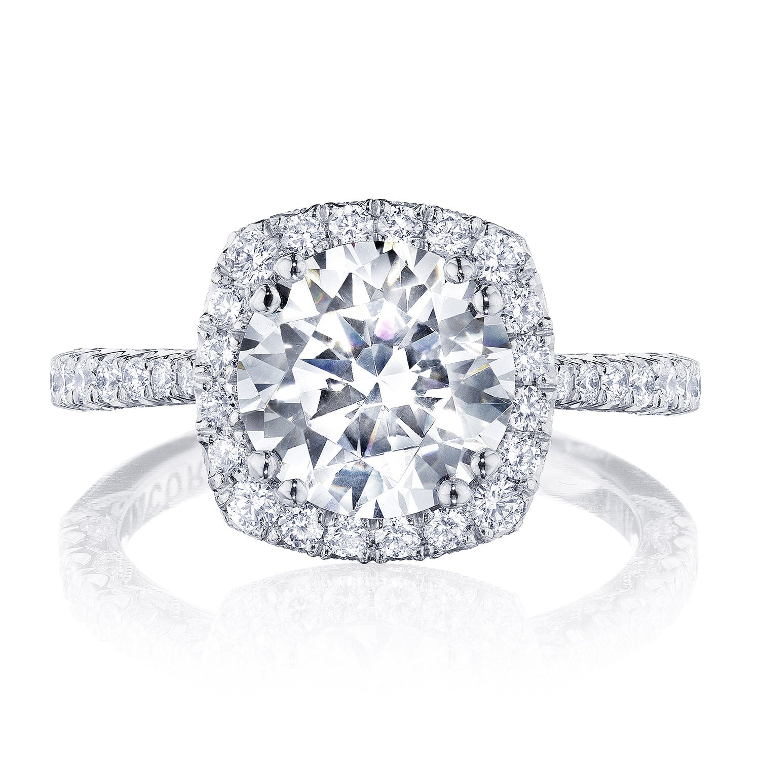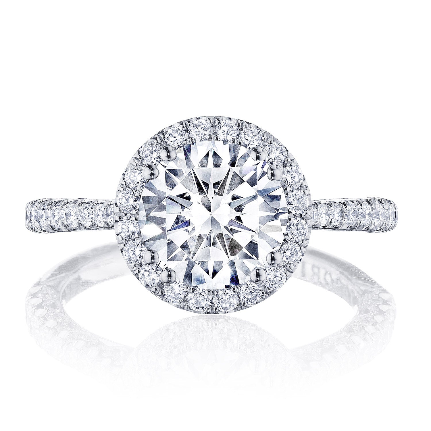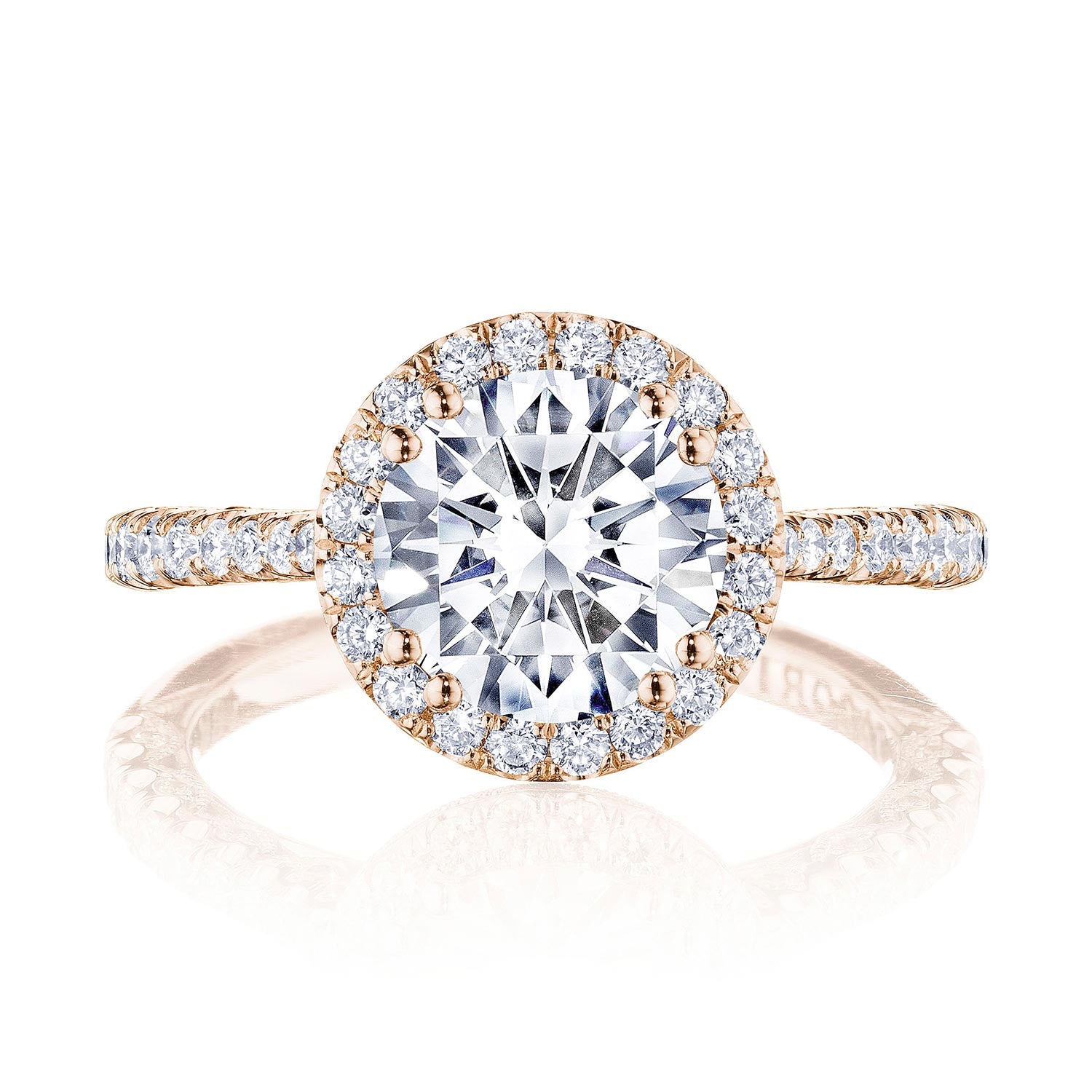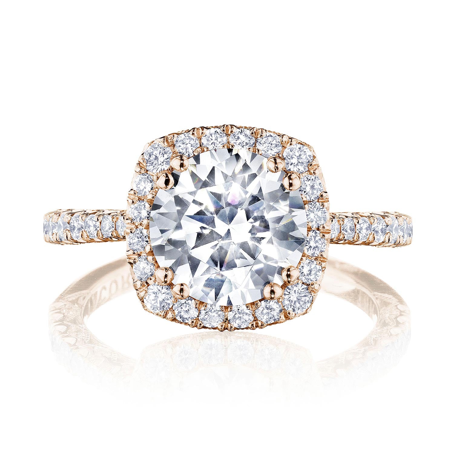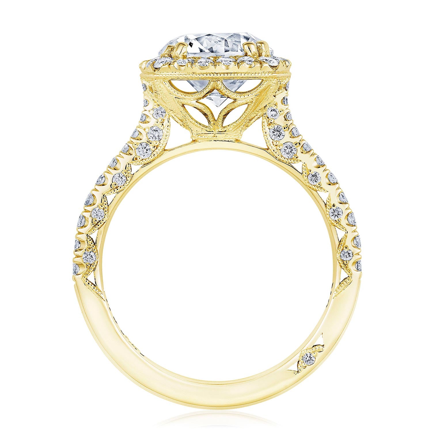 Pave-set diamonds decorate the ceiling, while a round bloom adds dimension to the center stone. The crown floats on a Classic 360 foundation above a band of Petite Crescent with more diamond details. A Signature Crescent marks the resting point.