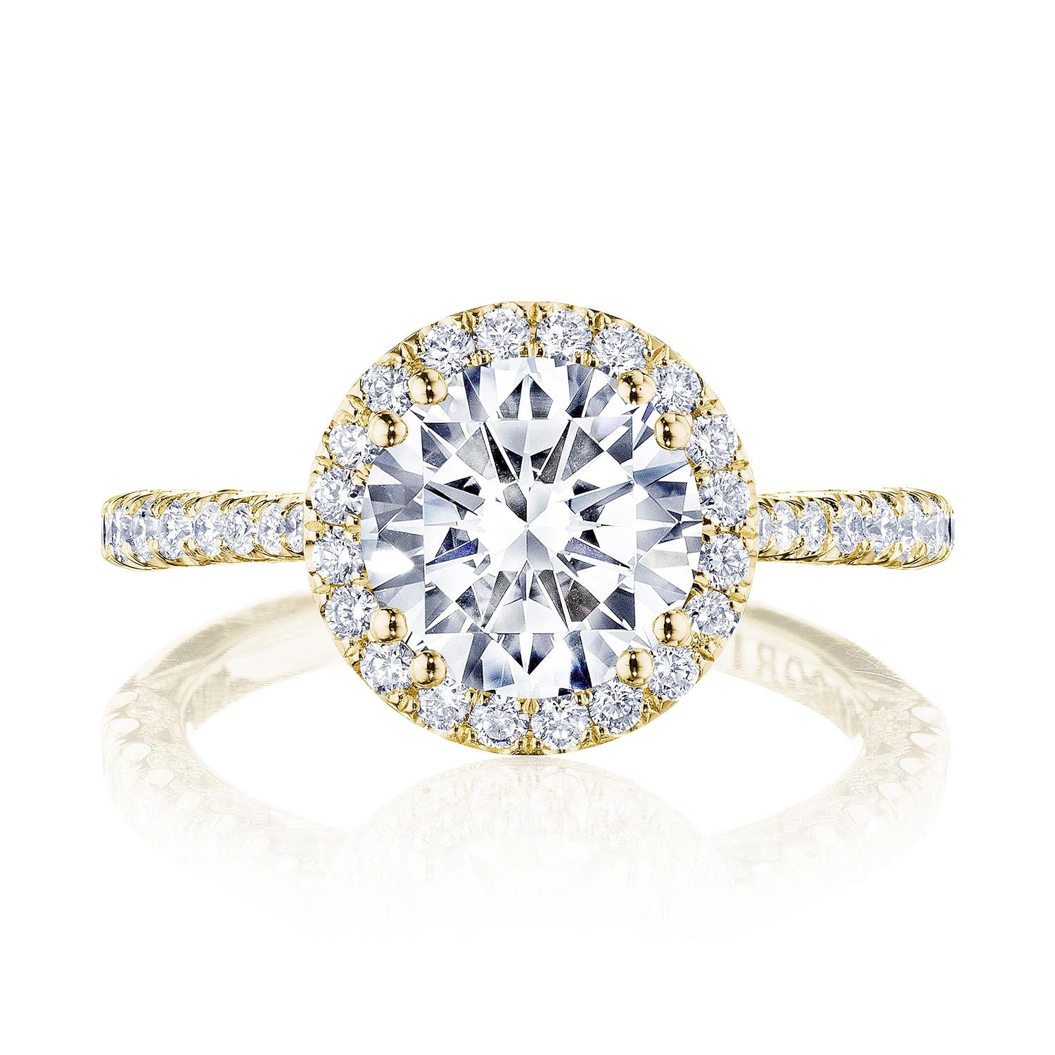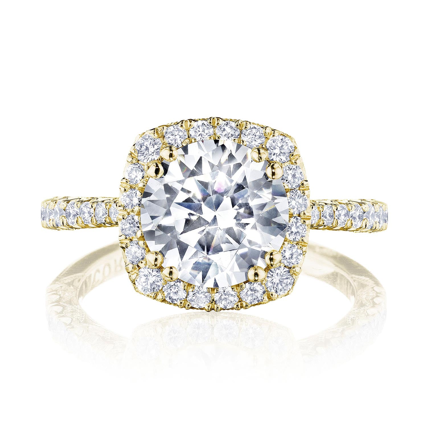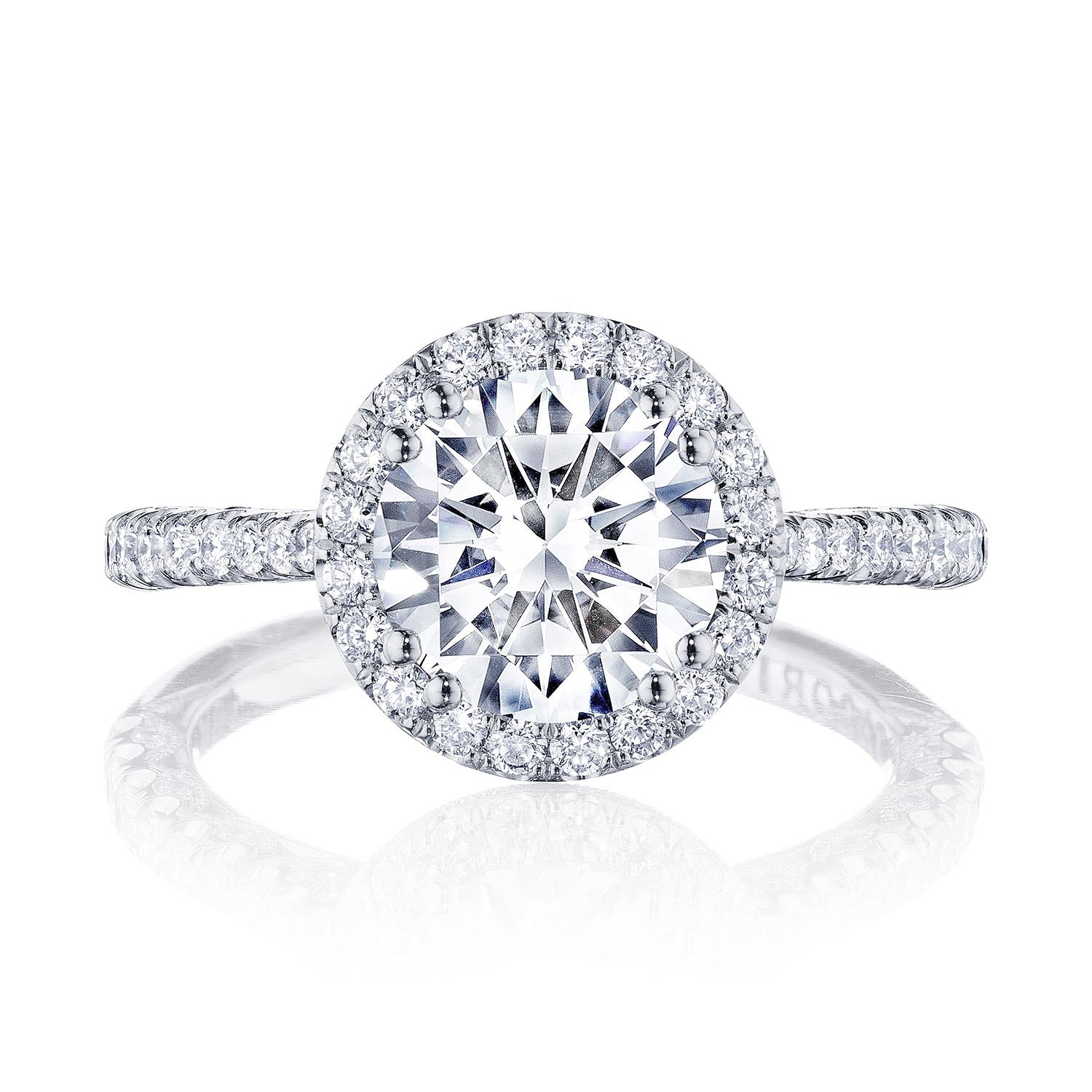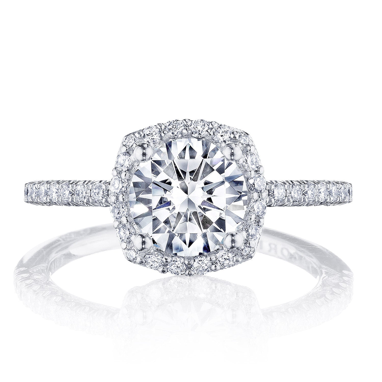 Pave-set diamonds decorate the ceiling, while a round bloom adds dimension to the center stone. The crown floats on a Classic 360 foundation above a band of Petite Crescent with more diamond details. A Signature Crescent marks the resting point.