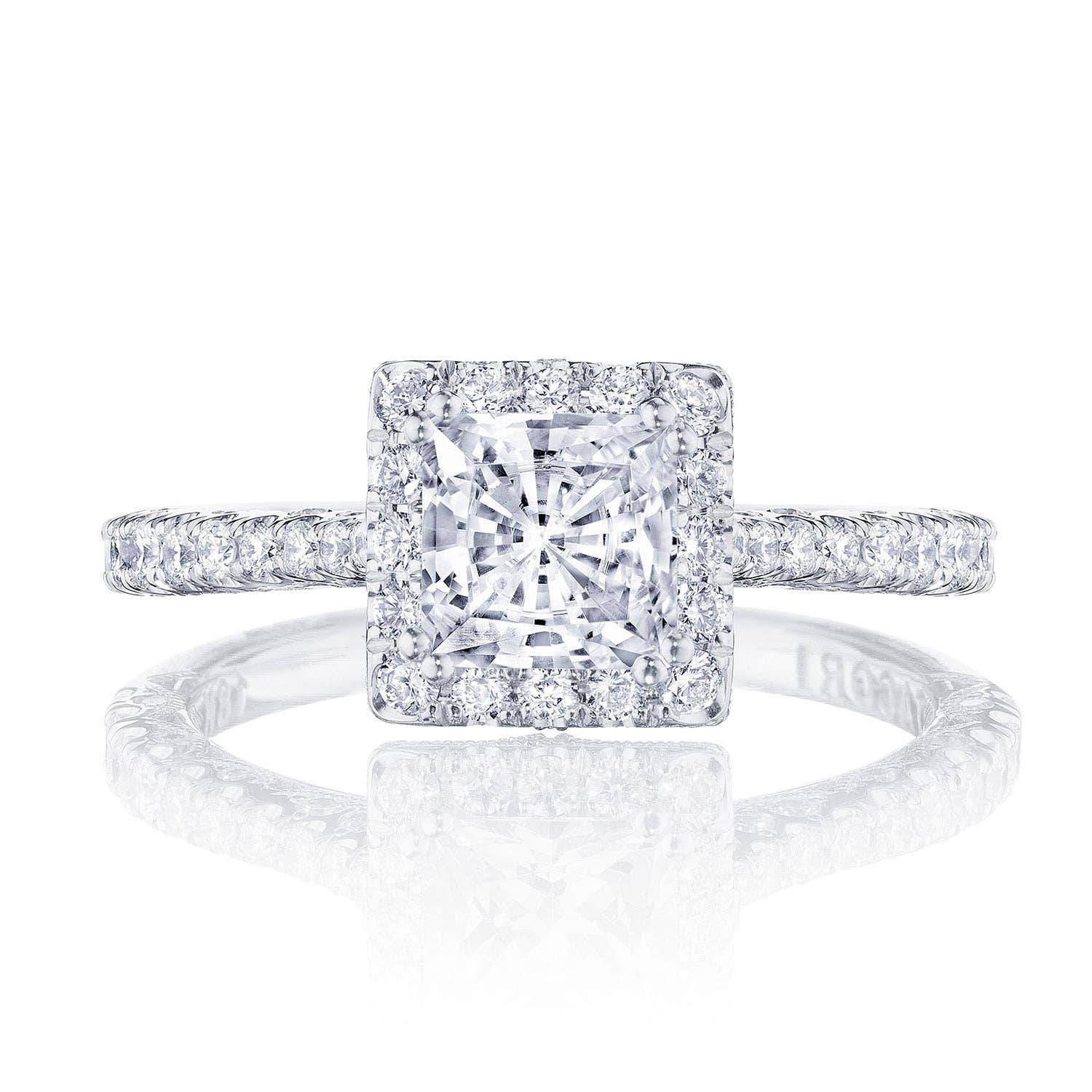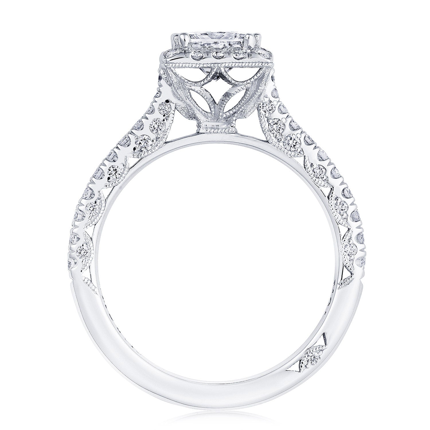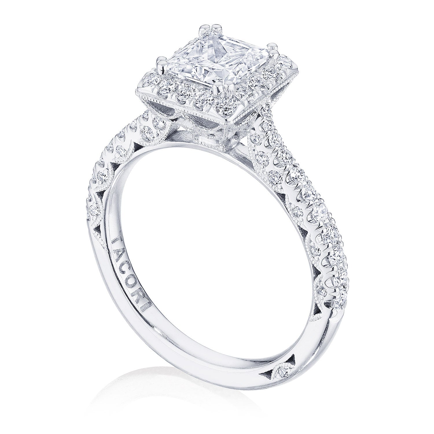Pave-set diamonds lead towards a princess-bloomed center stone, which floats on a Classic 360 foundation with an open gallery. The innerface of the band is decorated with Petite Crescent fabric, and a Signature Crescent marks the resting point.