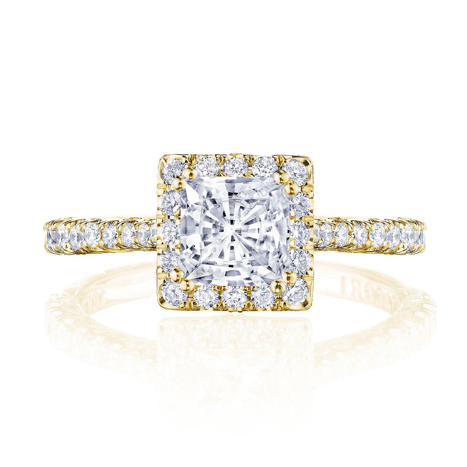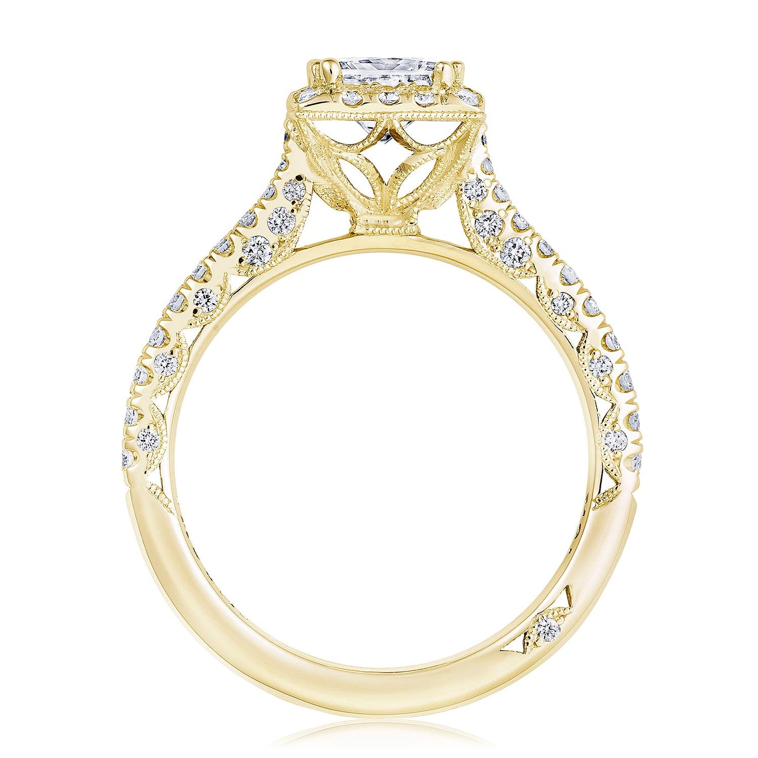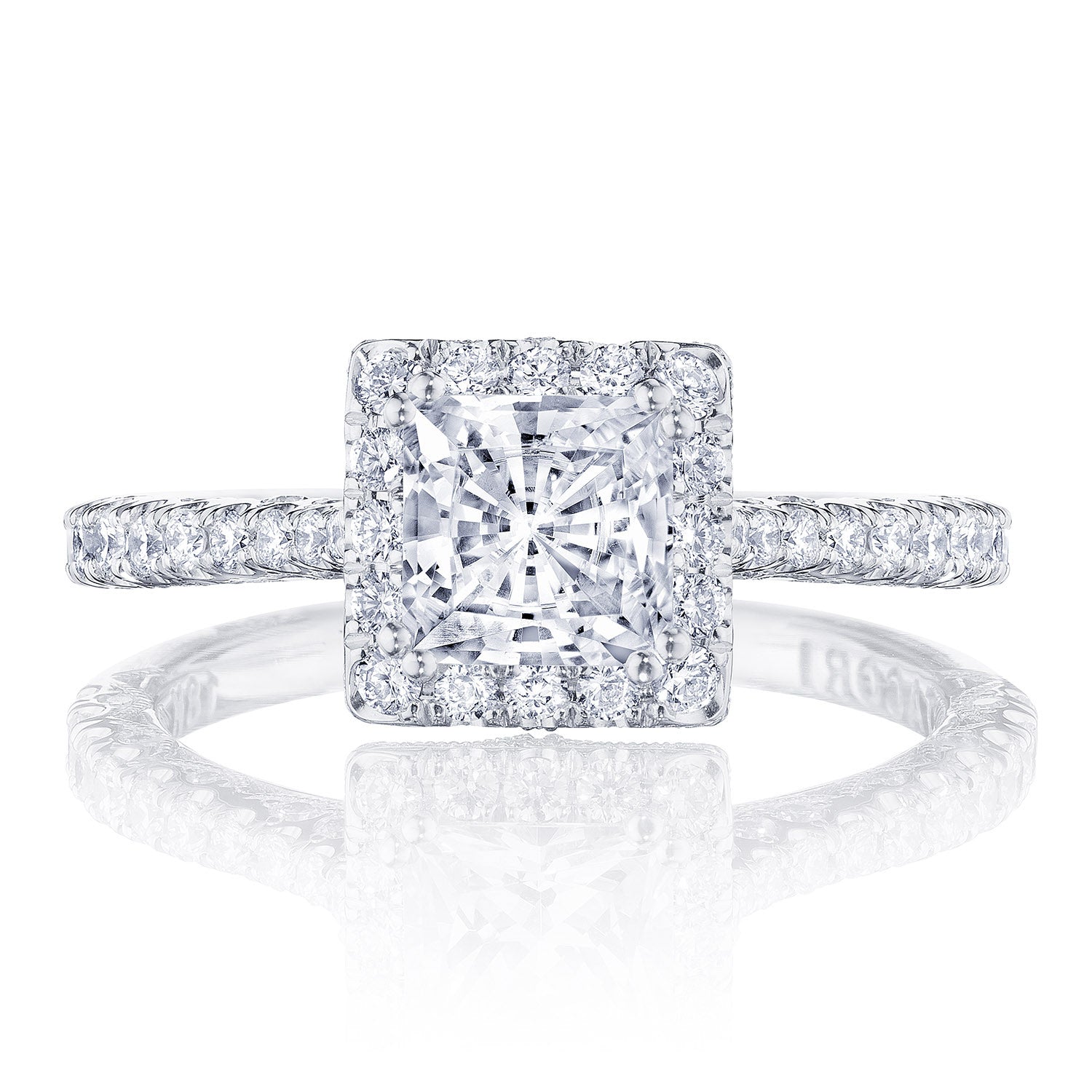 Pave-set diamonds lead towards a princess-bloomed center stone, which floats on a Classic 360 foundation with an open gallery. The innerface of the band is decorated with Petite Crescent fabric, and a Signature Crescent marks the resting point.