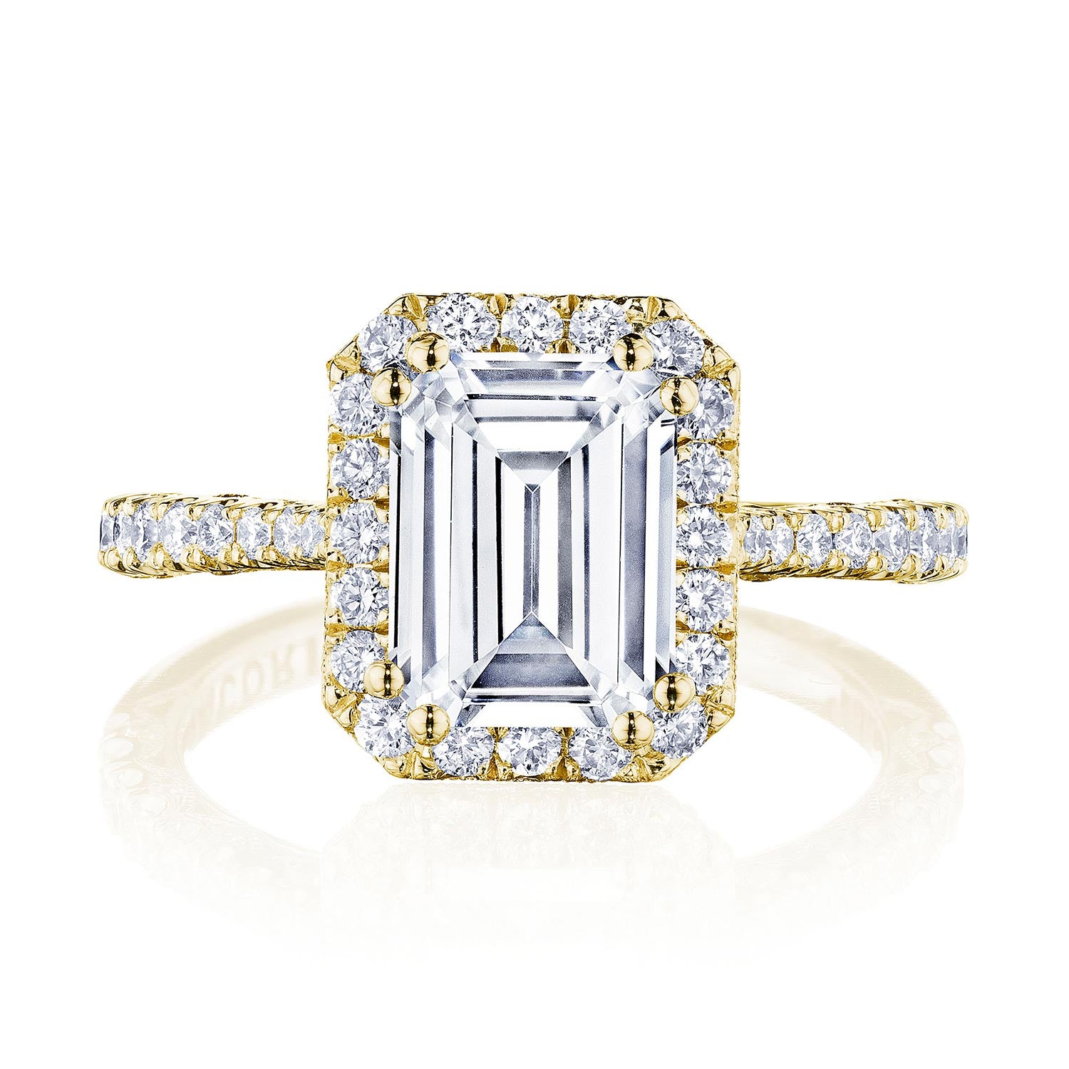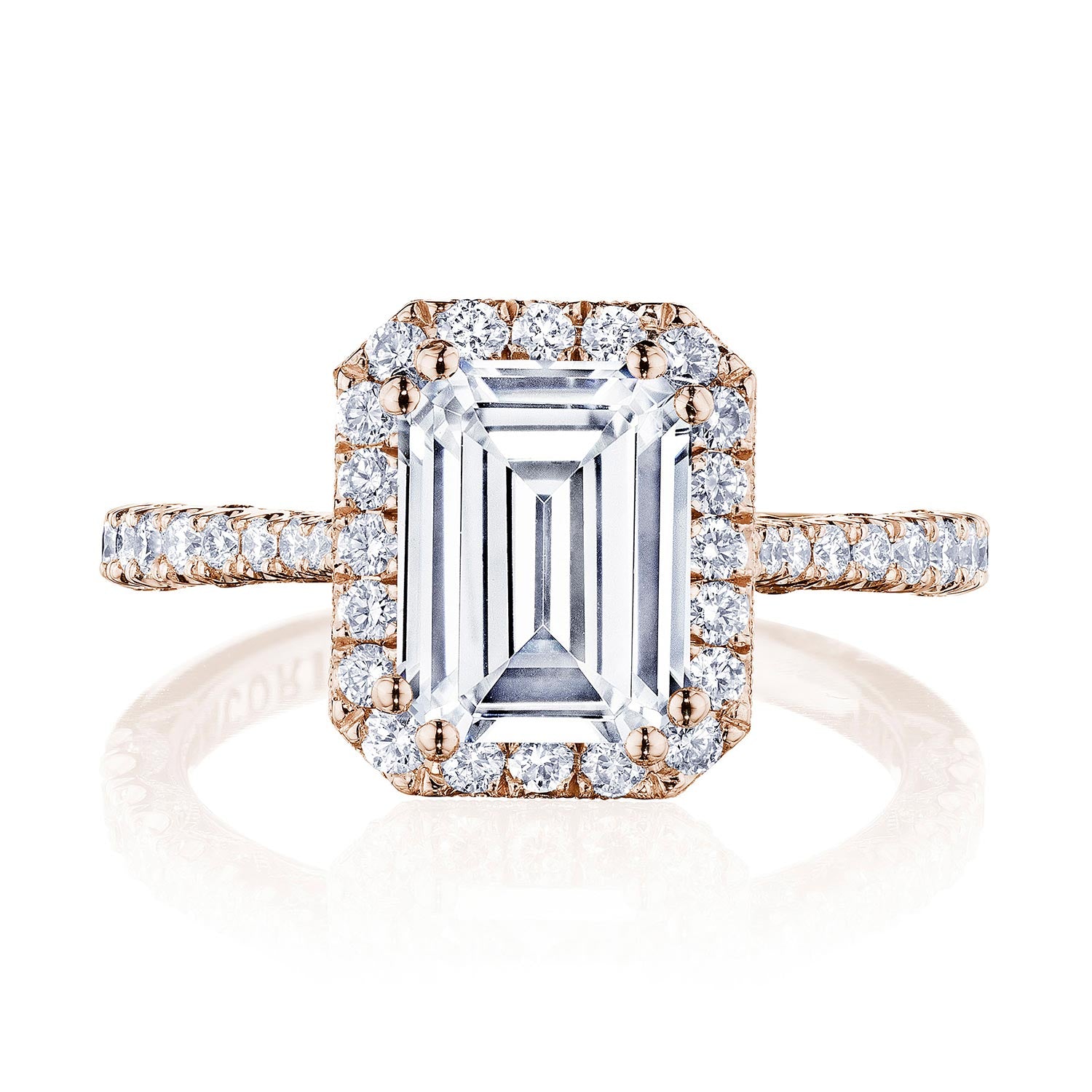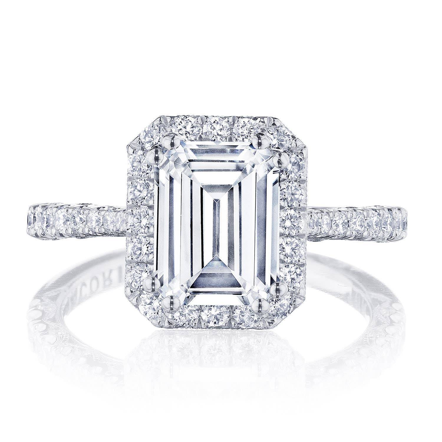 Pave-set diamonds lead towards a emerald-bloomed center stone, which floats on a Classic 360 foundation with an open gallery. The innerface of the band is decorated with Petite Crescent fabric, and a Signature Crescent marks the resting point.