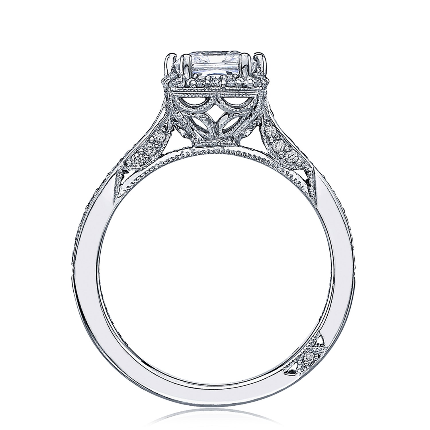 Spotlight diamonds give depth and dimension to a princess cut diamond with diamonds adorning the lower level of the crown, hand set in pavé along the ceiling, and glittering in Tacori crescent details along the sides of a high polished band.
