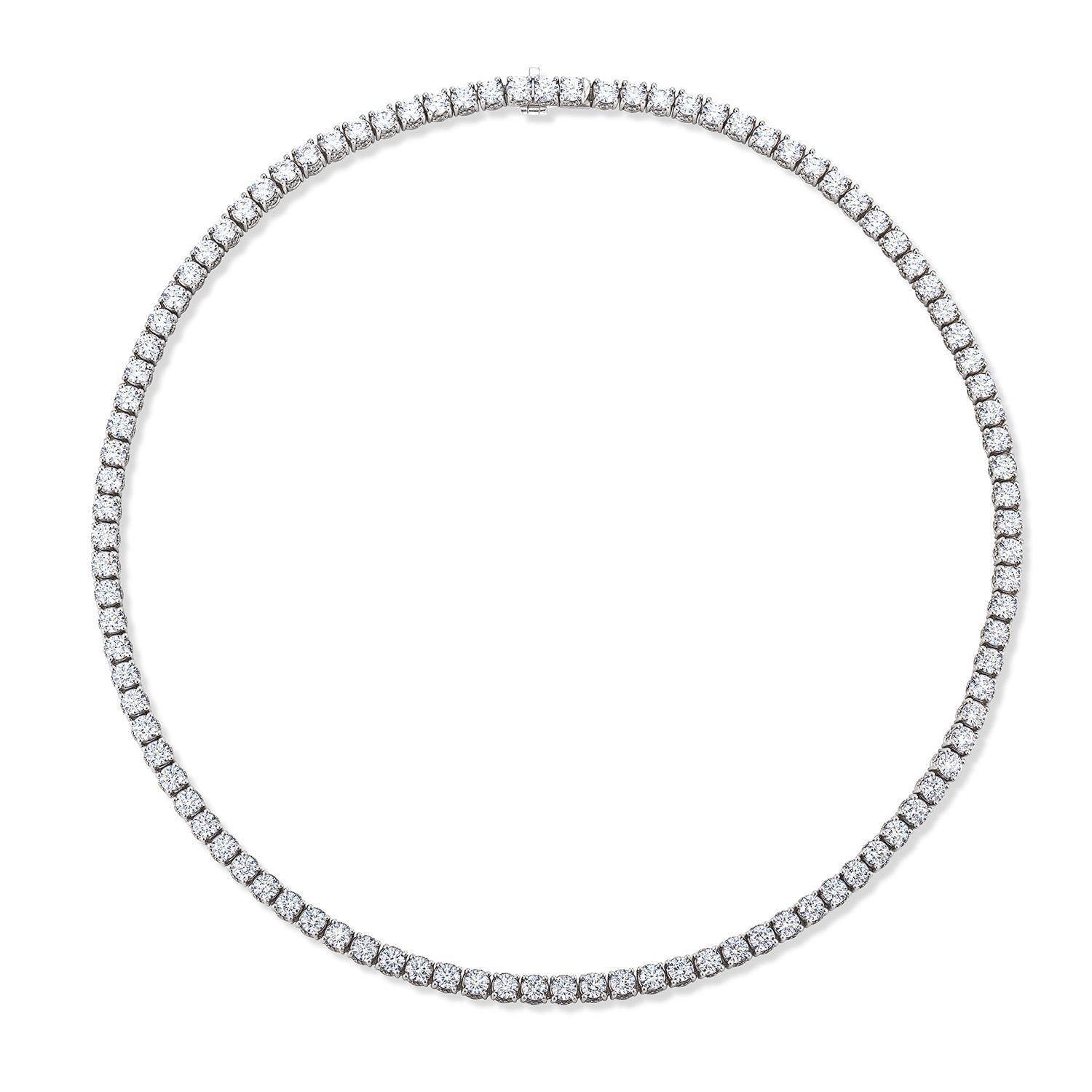Shimmering across the neckline, the Riviera necklace illustrates the power of meticulous craftsmanship to mesmerize with a simple design. The seamless string of round-brilliant diamonds are hand-selected for their impeccable cut and clarity, and hand-set with the a precision to forever hold a sublime form.
