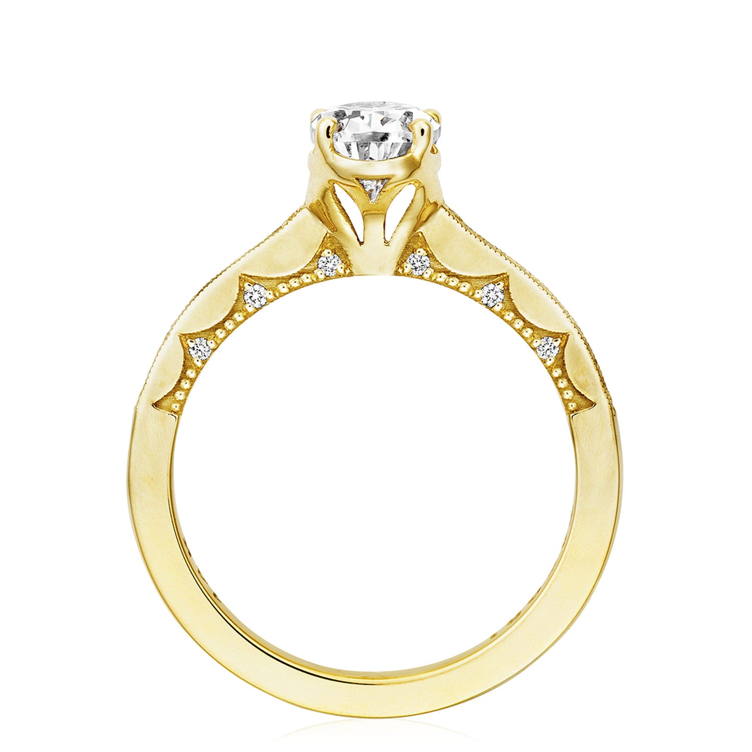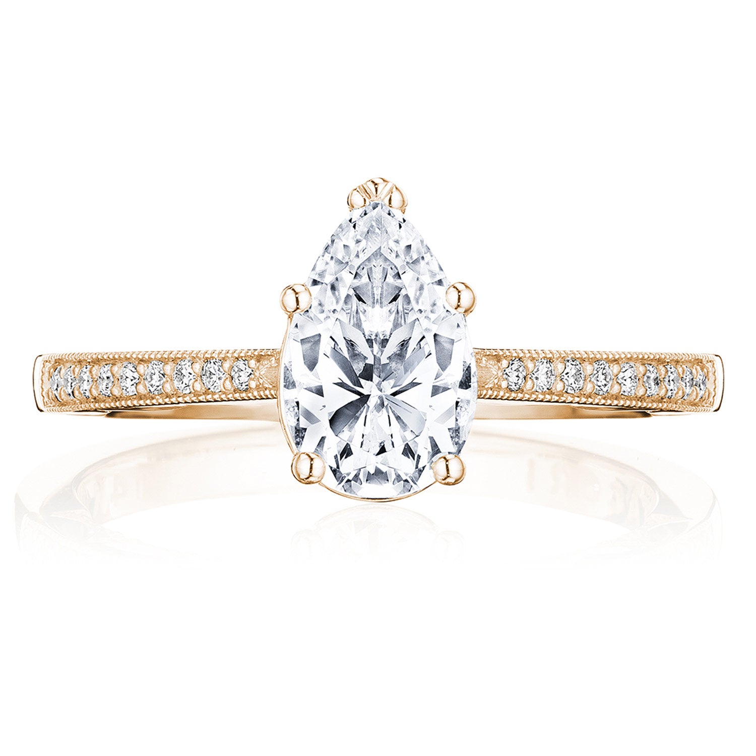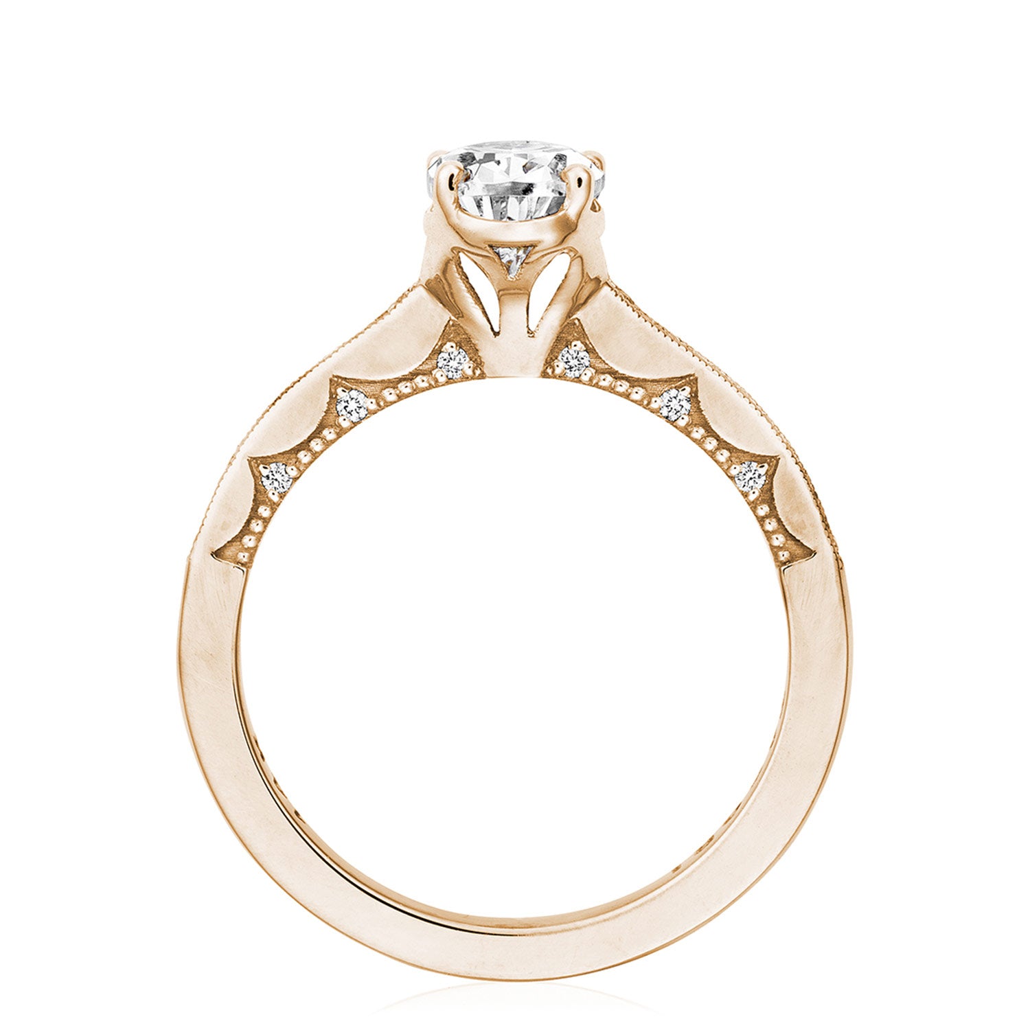 Dainty round-brilliant diamonds decorate the ceiling and lead to the center stone, which embraced by a Cathedral foundation. Coastal Crescent fabric with pinpoint diamond detailing adds a clean texture to the innerface.